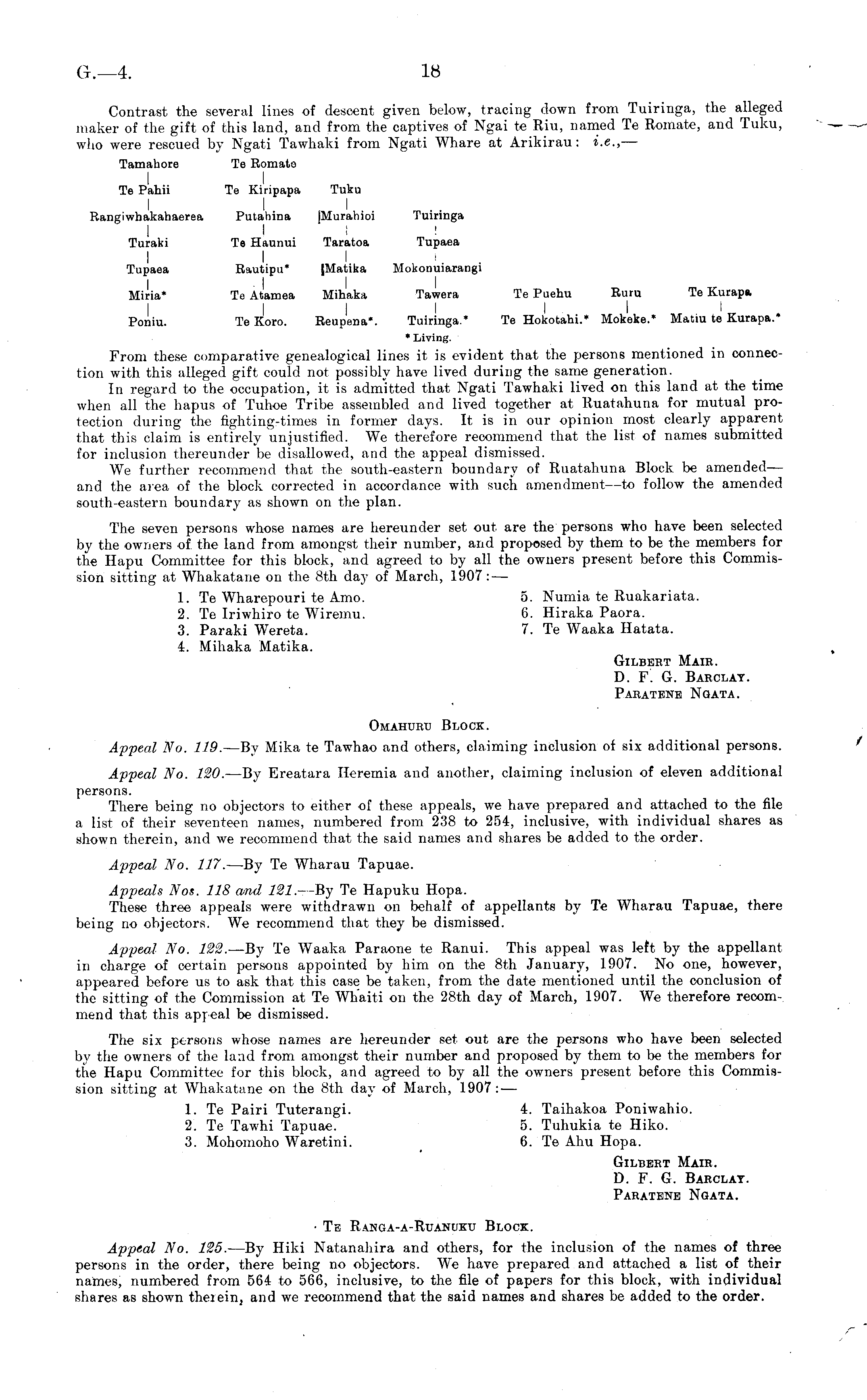 Contrast the several lines of descent given below, tracing down from Tuiringa, the alleged maker of the gift of this land, and from the captives of Ngai te Riu, named Te Romate, and Tuku, who were rescued by Ngati Tawhaki from Ngati Whare at Arikirau : i.e., — Tamahore Tβ Romato Te Pahii Te Kinpapa Tuku I I 1 Rangiwhakahaerea Putahina (Murahioi Tuiringa I I i ! Turaki Tβ Haunui Taratoa Tupaea I I I Tupaea Rautipu* [Matika Mokoouiarangi Miria* To Atamea Mihaka Tawera Te Puehu Ruru Te Kurapa Poniu. Te Koro. Reupena*. Tuiringa.* Te Hokotahi. , Mokeke. , Matiu te Kurapa.* * Living. From these comparative genealogical lines it is evident that the persons mentioned in connection with this alleged gift could not possibly have lived during the same generation. In regard to the occupation, it is admitted that Ngati Tawhaki lived on this land at the time when all the hapus of Tuhoe Tribe assembled and lived together at Ruatahuna for mutual protection during the fighting-times in former days. It is in our opinion most clearly apparent that this claim is entirely unjustified. We therefore recommend that the list of names submitted for inclusion thereunder be disallowed, and the appeal dismissed. We further recommend that the south-eastern boundary of Ruatahuna Block be amended — and the area of the block corrected in accordance with such amendment—to follow the amended south-eastern boundary as shown on the plan. The seven persons whose names are hereunder set out are the persons who have been selected by the owners of the land from amongst their number, and proposed by them to be the members for the Hapu Committee for this block, and agreed to by all the owners present before this Commission sitting at Whakatane on the Bth day of March, 1907: — 1. Te Wharepouri te Amo. 5. Numia te Ruakariata. 2. Te Iriwhiro te Wiremu. 6. Hiraka Paora. 3. Paraki Wereta. 7. Te Waaka Hatata. 4. Mihaka Matika. Gilbert Mair. D. F. G. Barclay. Paratbnb Ngata. Omahuru Block. Appeal No. 119. —8y Mika te Tawhao and others, claiming inclusion of six additional persons. Appeal No. 120. —8y Ereatara Heremia and another, claiming inclusion of eleven additional persons. There being no objectors to either of these appeals, we have prepared and attached to the file a list of their seventeen names, numbered from 238 to 254, inclusive, witli individual shares as shown therein, and we recommend that the said names and shares be added to the order. Appeal No. 117.— 8γ Te Wharau Tapuae. Appeals Nos. 118 and 121. —By Te Hapuku Hopa. These three appeals were withdrawn on behalf of appellants by Te Wharau Tapuae, there being no objectors. We recommend that they be dismissed. Appeal No. 122. —8y Te Waaka Paraone te Ranui. This appeal was left by the appellant in charge of certain persons appointed by him on the Bth January, 1907. No one, however, appeared before us to ask that this case be taken, from the date mentioned until the conclusion of the sitting of the Commission at Te Wh'aiti on the 28th day of March, 1907. We therefore recommend that this appeal be dismissed. The six persons whose names are hereunder set out are the persons who have been selected by the owners of tho land from amongst their number and proposed by them to be the members for the Hapu Committee for this block, and agreed to by all the owners present before this Commission sitting at Whakatane on the Bth day of March, 1907: — 1. Te Pairi Tuterangi. 4. Taihakoa Poniwahio. 2. Te Tawhi Tapuae. 5. Tuhukia te Hiko. 3. Mohomoho Waretini. 6. Te Ahu Hopa. Gilbert Mair. D. F. G. Barclay. Paratene Ngata. •Tβ Ranga-a-Ruanuku Block. Appeal No. 125. —8y Hiki Natanahira and others, for the inclusion of the names of three persons in the order, there being no objectors. We have prepared and attached a list of their names, numbered from 564 to 566, inclusive, to the file of papers for this block, with individual shares as shown theiein, and we recommend that the said names and shares be added to the order.