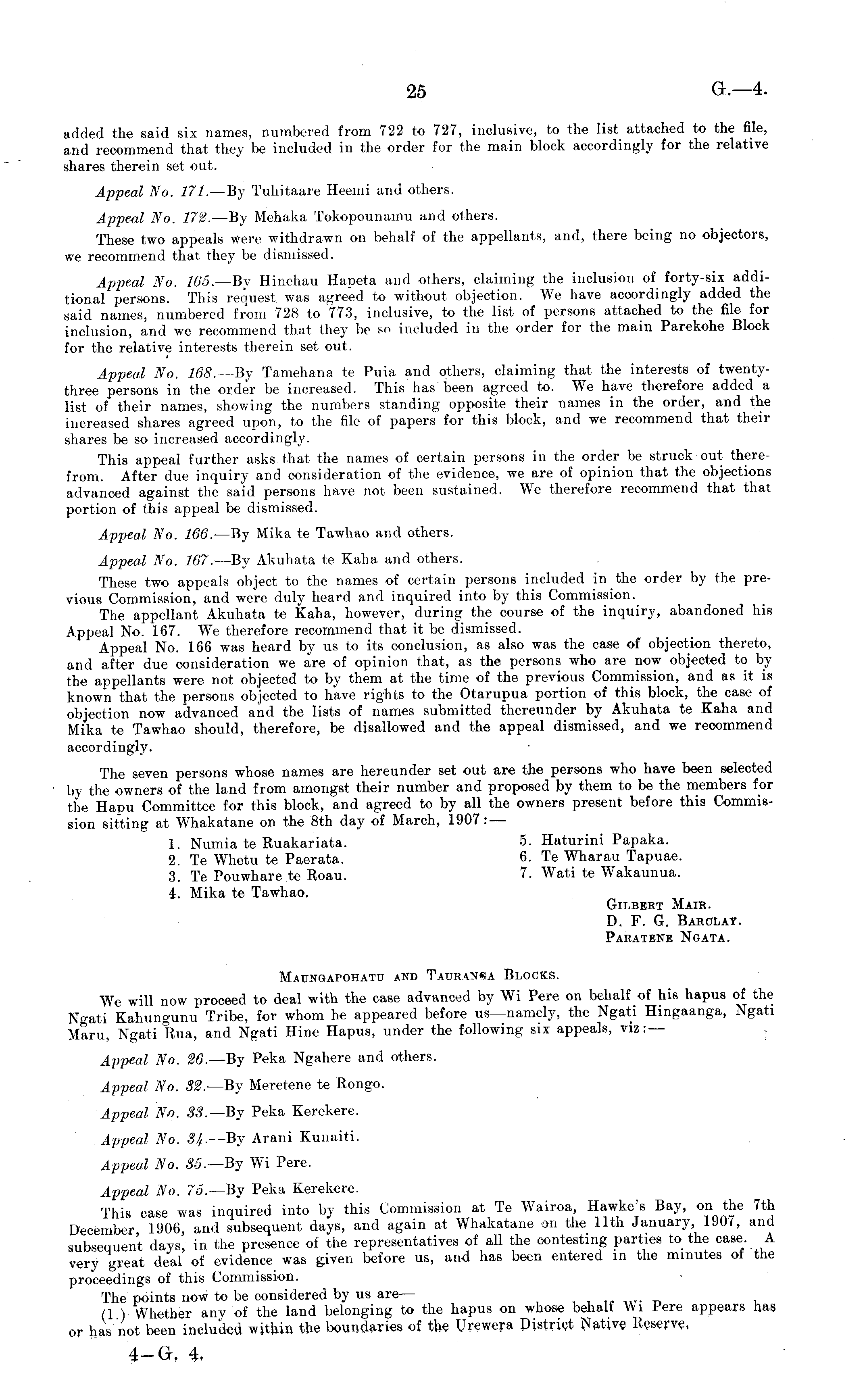 added the said six names, numbered from 722 to 727, inclusive, to the list attached to the file, and recommend that they be included in the order for the main block accordingly for the relative shares therein set out. Appeal No. 171. —By Tuhitaare Heemi and others. Appeal No. 172. —8y Mehaka Tokopounamu and others. These two appeals were withdrawn on behalf of the appellants, and, there being no objectors, we recommend that they be dismissed. Appeal Xo. 165. —By Hinehau Hapeta and others, claiming the inclusion of forty-six additional persons. This request was agreed to without objection. We have accordingly added the said names, numbered from 728 to 773, inclusive, to the list of persons attached to the file for inclusion, and we recommend that they be so included in the order for the main Parekohe Block for the relative interests therein set out. Appeal No. 168.—8y Tamehana te Puia and others, claiming that the interests of twentythree persons in the order be increased. This has been agreed to. We have therefore added a list of their names, showing the numbers standing opposite their names in the order, and the increased shares agreed upon, to the file of papers for this block, and we recommend that their shares be so increased accordingly. This appeal further asks that the names of certain persons in the order be struck out therefrom. After due inquiry and consideration of the evidence, we are of opinion that the objections advanced against the said persons have not been sustained. We therefore recommend that that portion of this appeal be dismissed. Appeal No. 166. —By Mika te Tawhao and others. Appeal No. 167. —By Akuhata te Kaha and others. These two appeals object to the names of certain persons included in the order by the previous Commission, and were duly heard and inquired into by this Commission. The appellant Akuhata te Kaha, however, during the course of the inquiry, abandoned his Appeal No. 167. We therefore recommend that it be dismissed. Appeal No. 166 was heard by us to its conclusion, as also was the case of objection thereto, and after due consideration we are of opinion that, as the persons who are now objected to by the appellants were not objected to by them at the time of the previous Commission, and as it is known that the persons objected to have rights to the Otarupua portion of this block, the case of objection now advanced and the lists of names submitted thereunder by Akuhata te Kaha and Mika te Tawhao should, therefore, be disallowed and the appeal dismissed, and we recommend accordingly. The seven persons whose names are hereunder set out are the persons who have been selected by the owners of the land from amongst their number and proposed by them to be the members for the Hapu Committee for this block, and agreed to by all the owners present before this Commission sitting at Whakatane on the Bth day of March, 1907: — 1. Numia te Ruakariata. 5- Haturini Papaka. 2. Te Whetu te Paerata. 6. Te Wharau Tapuae. 3. Te Pouwhare te Roau. 7. Wati te Wakaunua. 4. Mika te Tawhao. Gilbert Mair. D. F. G. Barclay. Paratenb Ngata. Maungapohatu and Taueania Blocks. We will now proceed to deal with the case advanced by Wi Pere on behalf of his hapus of the Xgati Kahungunu Tribe, for whom he appeared before us—namely, the Ngati Hingaanga, Ngati Maru, Ngati Rua, and Ngati Hine Hapus, under the following six appeals, viz:— , Appeal No. 26. —8y Peka Ngahere and others. Appeal No. $2. —By Meretene te Rongo. Appeal No. S3. —By Peka Kerekere. Appeal No. 3J,.~-B\ Arani Kunaiti. Appeal No. 35.— 8y Wi Pere. Appeal No. 75.—8y Peka Kerekere. This case was inquired into by this Commission at Te Wairoa, Hawke's Bay, on the 7th December 1906 and subsequent days, and again at Whakatane on the 11th January, 190/, and subsequent days, in the presence of the representatives of all the contesting parties to the case A very great deal of evidence was given before us, and has been entered in the minutes of the proceedings of this Commission. The points now to be considered by us are — (1 V Whether any of the land belonging to the hapus on whose behalf Wi Pere appears has or has not been included within the boundaries of the Urewera District Native Reserve,