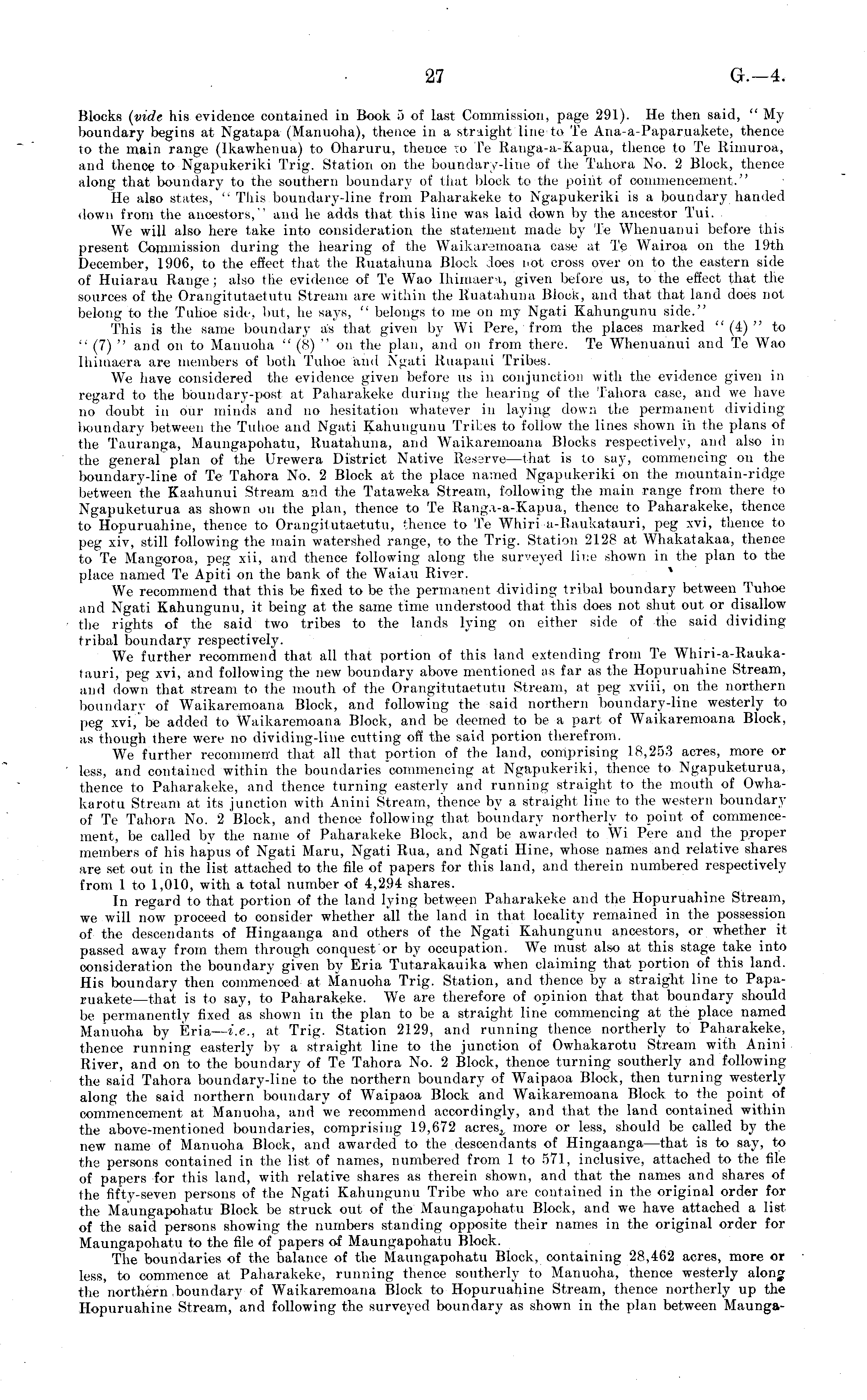 Blocks (vide his evidence contained in Book sof last Commission, page 291). He then said, "My boundary begins at Ngatapa (Manuoha), thence in a straight line to Te Ana-a-Paparuakete, thence to the main range (Ikawhenua) to Oharuru, thence to IV Ranga-a-Kapua, thence to Te Itinmroa, and thence to Ngapukeriki Trig. Station on the boundary-line of the 'J'ahora No. 2 Block, thence along that boundary to the southern boundary of that block to the point of commencement." He also states, "This boundary-line from Paharakeke to Ngapukeriki is a boundary handed down from the ancestors," and he adds that this line was laid down by the ancestor Tui. We will also here take into consideration the statement made by Te Whemianui before this present Commission during the hearing of the Waikaremoana case at Te Wairoa on the 19th December, 1906, to the effect that the Ruatahuna Block does not cross over on to the eastern side of Huiarau Range; also the evidence of Te Wao Ihimuer-i, given before us, to the effect that tin.' sources of the Orangitutaetutu Stream are within the Ruatahuna Block, and that that land does not belong to the Tuhoe side, but, lie says, " belongs to me on my Xgati Kahungumi side." This is the same boundary as that given by Wi Pere, from the places marked " (4) " to " (7) " and on to Manuoha " (8) "on the plan, and on from there. Te Whenuanui and Te Wao Ihimaera are members of both Tuhoe and Ngati Ruapani Tribes. We have considered the evidence given before us in conjunction wilh the evidence given in regard to the boundary-post at Paharakeke during the hearing of the Tahora case, and we have no doubt in our minds and no hesitation whatever in laying down the permanent dividing boundary between the Tuhoe and Ngati Kahungunu Tril.es to follow the lines shown in the plans of the Tauranga, Maungapohatu, Ruatahuna, and Waikaremoana Blocks respectively, and also in the general plan of the Urewera District Native Reserve—that is to say, commencing on the boundary-line of Te Tahora No. 2 Block at the place named Ngapukeriki on the mountain-ridge between the Kaahunui Stream and the Tataweka Stream, following the main range from there to Ngapuketurua as shown on the plan, thence to Te Ranga-a-Kapua, thence to Paharakeke, thence to Hopuruahine, thence to Orangitutaetutu, thence to Te Whiri a-Raukatauri, peg xvi, thence to peg xiv, still following the main watershed range, to the Trig. Station 2128 at Whakatakaa, thence to Te Mangoroa, peg xii, and thence following along the surveyed line shown in the plan to the place named Te Apiti on the bank of the Waiau River. We recommend that this be fixed to be the permanent dividing tribal boundary between Tuhoe and Ngati Kahungunu, it being at the same time understood that this does not shut out or disallow the rights of the said two tribes to the lands lying on either side of the said dividingtribal boundary respectively. We further recommend that all that portion of this land extending from Te Whiri-a-Rauka-tauri, peg xvi, and following the new boundary above mentioned as far as the Hopuruahine Stream, and down that stream to the mouth of the Orangitutaetutu Stream, at peg xviii, on the northern boundary of Waikaremoana Block, and following the said northern boundary-line westerly to peg xvi, be added to Waikaremoana Block, and be deemed to be a part of Waikaremoana Block, as though there were no dividing-line cutting off the said portion therefrom. We further recommend that all that portion of the land, comprising 15,253 acres, more or less, and contained within the boundaries commencing al Ngapukeriki, thence to Ngapuketurua, thence to Paharakeke, and thence turning easterly and running straight to the mouth of Owhakarotu Stream at its junction with Anini Stream, thence by a straight line to the western boundary of Te Tahora No. 2 Block, and thence following that boundary northerly to point of commencement, be called by the name of Paharakeke Block, and be awarded to Wi Pere and the proper members of his hapus of Ngati Maru, Ngati Una, and Ngati Hine, whose names and relative shares are set out in the list attached to the file of papers for this land, and therein numbered respectively from 1 to 1,010, with a total number of 4,294 shares. In regard to that portion of the land lying between Paharakeke and the Hopuruahine Stream, we will now proceed to consider whether all the land in that locality remained in the possession of the descendants of Hingaanga and others of the Ngati Kahungunu ancestors, or whether it passed away from them through conquest or by occupation. We must also at this stage take into consideration the boundary given by Eria Tutarakauika when claiming that portion of this land. His boundary then commenced at Manuoha Trig. Station, and thence by a straight line to Paparuakete—that is to sav, to Paharakeke. We are therefore of opinion that that boundary should be permanently fixed as shown in the plan to be a straight line commencing at the place named Manuoha by Eria — i.e., at Trig. Station 2129, and running thence northerly to Paharakeke, thence running easterly by a straight line to the junction of Owhakarotu Stream with Anini River, and on to the boundary of Te Tahora No. 2 Block, thence turning southerly and following the said Tahora boundary-line to the northern boundary of Waipaoa Block, then turning westerly along the said northern boundary of Waipaoa Block and Waikaremoana Block to the point of commencement at Manuoha, and we recommend accordingly, and that the land contained within the above-mentioned boundaries, comprising 19,672 more or less, should be called by the new name of Manuoha Block, and awarded to the descendants of Hingaanga—that is to say, to the persons contained in the list of names, numbered from 1 to 571, inclusive, attached to the file of papers for this land, with relative shares as therein shown, and that the names and shares of the fifty-seven persons of the Ngati Kahungunu Tribe who are con
