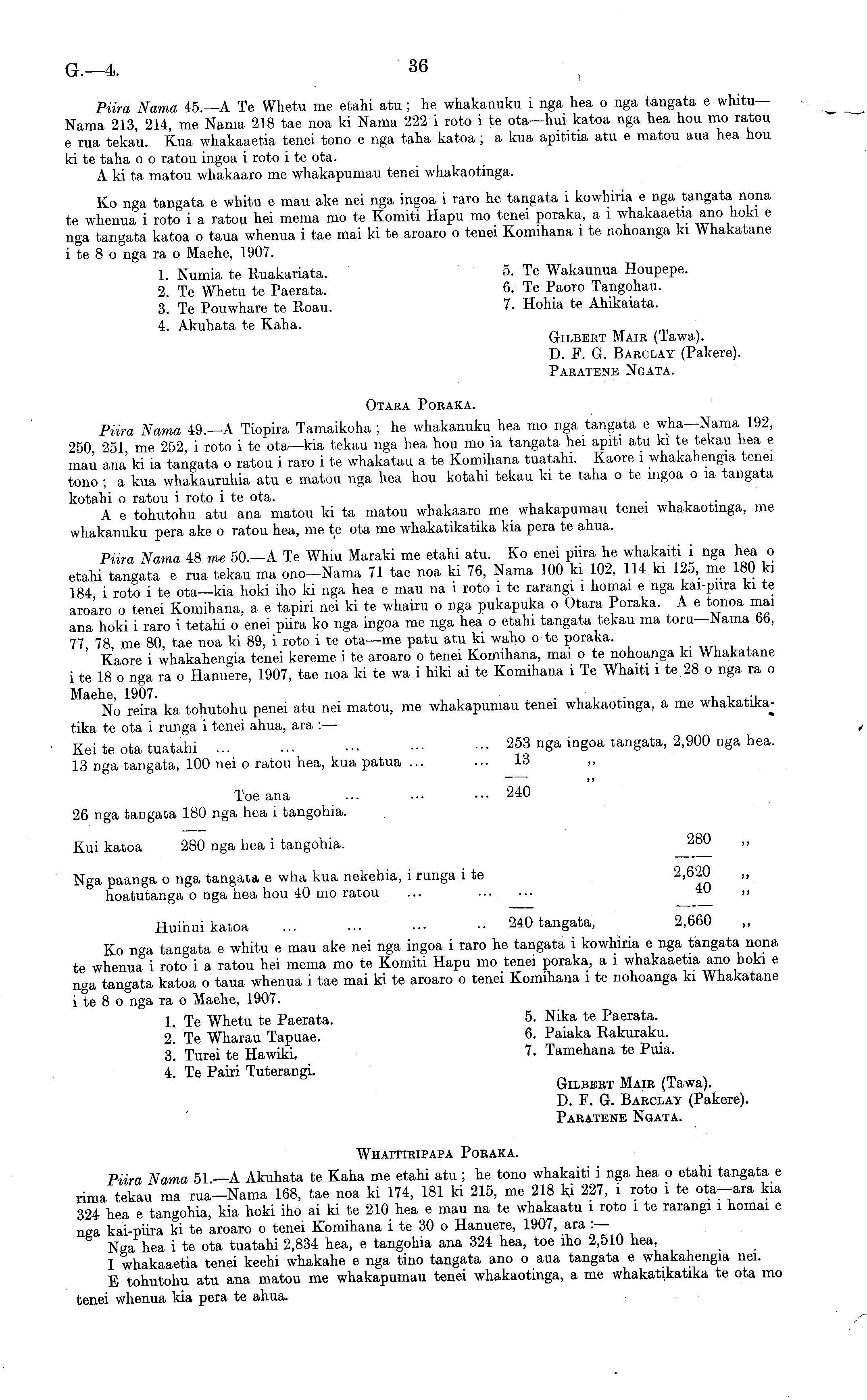 Piira Nama 45.—A Te Whetu me etahi atu ;he whakanuku i nga hea o nga tangata e whitu— Nama 213 214, me Nama 218 tae noa ki Nama 222 i roto ite ota—hui katoa nga hea hou mo ratou e rua tekau. Kua whakaaetia tenei tono e nga taha katoa ; a kua apititia atu e matou aua hea hou ki te taha o o ratou ingoa i roto i te ota. A ki ta matou whakaaro me whakapumau tenei whakaotinga. Ko nga tangata e whitu e mau ake nei nga ingoa i raro he tangata i kowhiria e nga tangata nona te whenua i roto i a ratou hei mema mo te Komiti Hapu mo tenei poraka, a i whakaaetia ano hoki e nga tangata katoa o taua whenua i tae mai ki te aroaro o tenei Komihana i te nohoanga ki Whakatane i te 8 o nga ra o Maehe, 1907. 1. Numia te Ruakariata. 5. Te Wakaunua Houpepe. 2. Te Whetu te Paerata. 6. Te Paoro Tangohau. 3. Te Pouwhare te Roau. V. Hohia te Ahikaiata. 4. Akuhata te Kaha. Gilbert Mair (lawa). D. F. G. Barclay (Pakere). Paratene Ngata. Otara Poraka. Piira Nama 49.— A Tiopira Tamaikoha ;he whakanuku hea mo nga tangata e wha—Nama 192, 250 251 me 252 i roto ite ota—kia tekau nga hea hou mo ia tangata hei apiti atu ki te tekau hea e mau ana ki ia tangata o ratou i raro ite whakatau ate Komihana tuatahi. Kaore i whakahengia tenei tono ; a kua whakauruhia atu e matou nga hea hou kotahi tekau ki te taha o te ingoa o ia tangata kotahi o ratou i roto i te ota. . A e tohutohu atu ana matou ki ta matou whakaaro me whakapumau tenei whakaotinga, me whakanuku pera ake o ratou hea, me te ota me whakatikatika kia pera te ahua. Piira Nama 48 me 50.—A Te Whiu Maraki me etahi atu. Ko enei piira he whakaiti i nga hea o etahi tangata e rua tekau ma ono-Nama 71 tae noa ki 76, Nama 100 ki 102, 114 ki 125, me 180 h 184 i roto ite ota—kia hoki iho ki nga hea e mau na i roto ite rarangi i homai e nga kai-pura ki te aroaro o tenei Komihana, a e tapiri nei ki te whairu o nga pukapuka o Otara Poraka. A e tonoa mai ana hoki i raro i tetahi o enei piira ko nga ingoa me nga hea o etahi tangata tekau ma toru—JNama fab, 77 78 me 80, tae noa ki 89, i roto ite ota—me patu atu ki waho ote poraka. Kaore i whakahengia tenei kereme i te aroaro o tenei Komihana, mai o te nohoanga ki Whakatane i te 18 o nga ra o Hanuere, 1907, tae noa ki te wa i hiki ai te Komihana i Te Whaiti i te 28 o nga ra o Maehe, 1907. . , • , , ~, No reira ka tohutohu penei atu nei matou, me whakapumau tenei whakaotinga, a me whakatikatika te ota i runga i tenei ahua, ara : — Kei te ota tuatahi 253 nga ingoa tangata, 2,900 nga hea. 13 nga tangata, 100 nei o ratou hea, kua patua ... ••• 13 J) Toe ana ... ■•• ••• 240 26 nga tangata 180 nga hea i tangohia. Kui katoa 280 nga hea i tangohia. 280 Nga paanga o nga tangata e wha kua nekehia, i runga i te 2 " hoatutanga o nga hea hou 40 mo ratou ... 40 ~ Huihui katoa 240 tangata, 2,660 Ko nga tangata e whitu e mau ake nei nga ingoa i raro he tangata i kowhiria e nga tangata nona te whenua i roto i a ratou hei mema mo te Komiti Hapu mo tenei poraka, a i whakaaetia ano hoki e nga tangata katoa o taua whenua i tae mai ki te aroaro o tenei Komihana i te nohoanga ki Whakatane i te 8 o nga ra o Maehe, 1907. 1. Te Whetu te Paerata. 5- Nika te Paerata. 2 Te Wharau Tapuae. 6- Paiaka Rakuraku. 3. Turei te Hawiki. 7- Tamehana te Puia. 4. Te Pairi Tuterangi. Gilbert Maie (Tawa). D. F. G. Barclay (Pakere). Paratene Ngata. Whaitiripapa Poraka. Piira Nama 51 —A Akuhata te Kaha me etahi atu ; he tono whakaiti i nga hea o etahi tangata e rima tekau ma rua-Nama 168, tae noa ki 174, 181 ki 215, me 218 ki 227, i roto i te ota-ara kia 324 hea e tangohia, kia hoki iho ai ki te 210 hea e mau na te whakaatu i roto i te rarangi i homai e nga kai-piira ki te aroaro o tenei Komihana i te 30 o Hanuere, 1907, ara :— Nga hea i te ota tuatahi 2,834 hea, e tangohia ana 324 hea, toe iho 2,510 hea. I whakaaetia tenei keehi whakahe e nga tino tangata ano o aua tangata e whakahengia nei. E tohutohu atu ana matou me whakapumau tenei whakaotinga, a me whakatikatika te ota mo tenei whenua kia pera te ahua. , ■