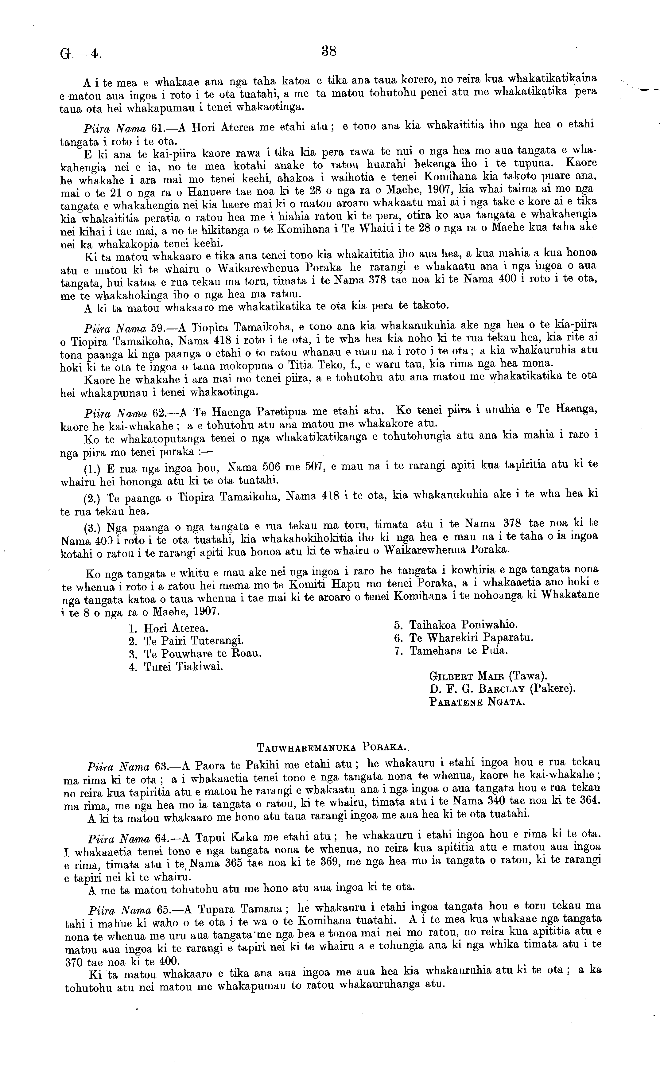 A i te mea e whakaae ana nga taha katoa e tika ana taua korero, no reira kua whakatikatikaina e matou aua ingoa i roto i te ota tuatahi, a me ta matou tohutohu penei atu me whakatikatika pera taua ota hei whakapumau i tenei whakaotinga. Piira Nama 61.—A Hori Aterea me etahi atu ; e tono ana kia whakaititia iho nga hea o etahi tangata i roto i te ota. E ki ana te kai-piira kaore rawa i tika kia pera rawa te nui o nga hea mo aua tangata e whakahengia nei e ia, no te mea kotahi anake to ratou huarahi hekenga iho i te tupuna. Kaore he whakahe i ara mai mo tenei keehi, ahakoa i waihotia e tenei Komihana kia takoto puare ana, mai o te 21 o nga ra o Hanuere tae noa ki te 28 o nga ra o Maehe, 1907, kia whai taima ai mo nga tangata e whakahengia nei kia haere mai ki o matou aroaro whakaatu mai ai i nga take e kore ai e tika kia whakaititia peratia o ratou hea me i hiahia ratou ki te pera, otira ko aua tangata e whakahengia nei kihai i tae mai, a no te hikitanga o te Komihana i Te Whaiti i te 28 o nga ra o Maehe kua taha ake nei ka whakakopia tenei keehi. Ki ta matou whakaaro e tika ana tenei tono kia whakaititia iho aua hea, a kua mama a kua honoa atu e matou ki te whairu o Waikarewhenua Poraka he rarangi e whakaatu ana i nga ingoa o aua tangata, hui katoa e rua tekau ma toru, timata i te Nama 378 tae noa ki te Nama 400 i roto i te ota, me te whakahokinga iho o nga hea ma ratou. A ki ta matou whakaaro me whakatikatika te ota kia pera te takoto. Piira Nama 59.— A Tiopira Tamaikoha, e tono ana kia whakanukuhia ake nga hea ote kia-piira 0 Tiopira Tamaikoha, Nama 418 i roto i te ota, i te wha hea kia noho ki te rua tekau hea, kia rite ai tona paanga ki nga paanga o etahi oto ratou whanau e mau na i roto ite ota; a kia whakauruhia atu hoki ki te ota te ingoa o tana mokopuna o Titia Teko, f., e waru tau, kia rima nga hea mona. Kaore he whakahe i ara mai mo tenei piira, a e tohutohu atu ana matou me whakatikatika te ota hei whakapumau i tenei whakaotinga. Piira Nama 62.—A Te Haenga Paretipua me etahi atu. Ko tenei piira i unuhia eTe Haenga, kaore he kai-whakahe ; a e tohutohu atu ana matou me whakakore atu. Ko te whakatoputanga tenei o nga whakatikatikanga e tohutohungia atu ana kia mahia i raro i nga piira mo tenei poraka : — (1.) E rua nga ingoa hou, Nama 506 me 507, e mau na i te rarangi apiti kua tapiritia atu ki te whairu hei hononga atu ki te ota tuatahi. (2.) Te paanga o Tiopira Tamaikoha, Nama 418 i te ota, kia whakanukuhia ake i te wha hea ki te rua tekau hea. (3 ) Nga paanga o nga tangata e rua tekau ma toru, timata atu i te Nama 378 tae noa ki te Nama 403 l roto i te ota tuatahi, kia whakahokihokitia iho ki nga hea e mau na i te taha o ia ingoa kotahi o ratou i te rarangi apiti kua honoa atu ki te whairu o Waikarewhenua Poraka. Ko nga tangata e whitu e mau ake nei nga ingoa i raro he tangata i kowhiria e nga tangata nona te whenua i roto i a ratou hei mema mo te Komiti Hapu mo tenei Poraka, a i whakaaetia ano hoki e nga tangata katoa o taua whenua i tae mai ki te aroaro o tenei Komihana i te nohoanga ki Whakatane 1 te 8 o nga ra o Maehe, 1907. 1 Hori Aterea. 5. Taihakoa Poniwahio. 2. Te Pairi Tuterangi. 6. Te Wharekiri Paparatu. 3. Te Pouwhare te Roau. 7. Tamehana te Puia. 4. Turei Tiakiwai. Gilbert Mair (Tawa). D. F. G. Barclay (Pakere). Paratene Ngata. Tauwharemanuka Poraka. Piira Nama 63.—A Paora te Pakihi me etahi atu ; he whakauru i etahi ingoa hou e rua tekau ma rima ki te ota ; a i whakaaetia tenei tono e nga tangata nona te whenua, kaore he kai-whakahe ; no reira kua tapiritia atu e matou he rarangi e whakaatu ana i nga ingoa o aua tangata hou e rua tekau ma rima, me nga hea mo ia tangata o ratou, ki te whairu, timata atu i te Nama 340 tae noa ki te 364. A ki ta matou whakaaro me hono atu taua rarangi ingoa me aua hea ki te ota tuatahi. Piira Nama 64.—A Tapui Kaka me etahi atu ; he whakauru i etahi ingoa hou e rima ki te ota. I whakaaetia tenei tono e nga tangata nona te whenua, no reira kua apititia atu e matou aua ingoa e rima, timata atu i te, Nama 365 tae noa ki te 369, me nga hea mo ia tangata o ratou, ki te rarangi e tapiri nei ki te whairu. A me ta matou tohutohu atu me hono atu aua ingoa ki te ota. Piira Nama 65.—A Tupara Tamana ; he whakauru i etahi ingoa tangata hou e toru tekau ma tahi i mahue ki waho ote ota itewa o te Komihana tuatahi. Ai te mea kua whakaae nga tangata nona te whenua me uru aua tangata'me nga hea e tonoa mai nei mo ratou, no reira kua apititia atu e matou aua ingoa ki te rarangi e tapiri nei ki te whairu a e tohungia ana ki nga whika timata atu i te 370 tae noa ki te 400. Ki ta matou whakaaro e tika ana aua ingoa me aua hea kia whakauruhia atu ki te ota ; a ka tohutohu atu nei matou me whakapumau to ratou whakauruhanga atu.