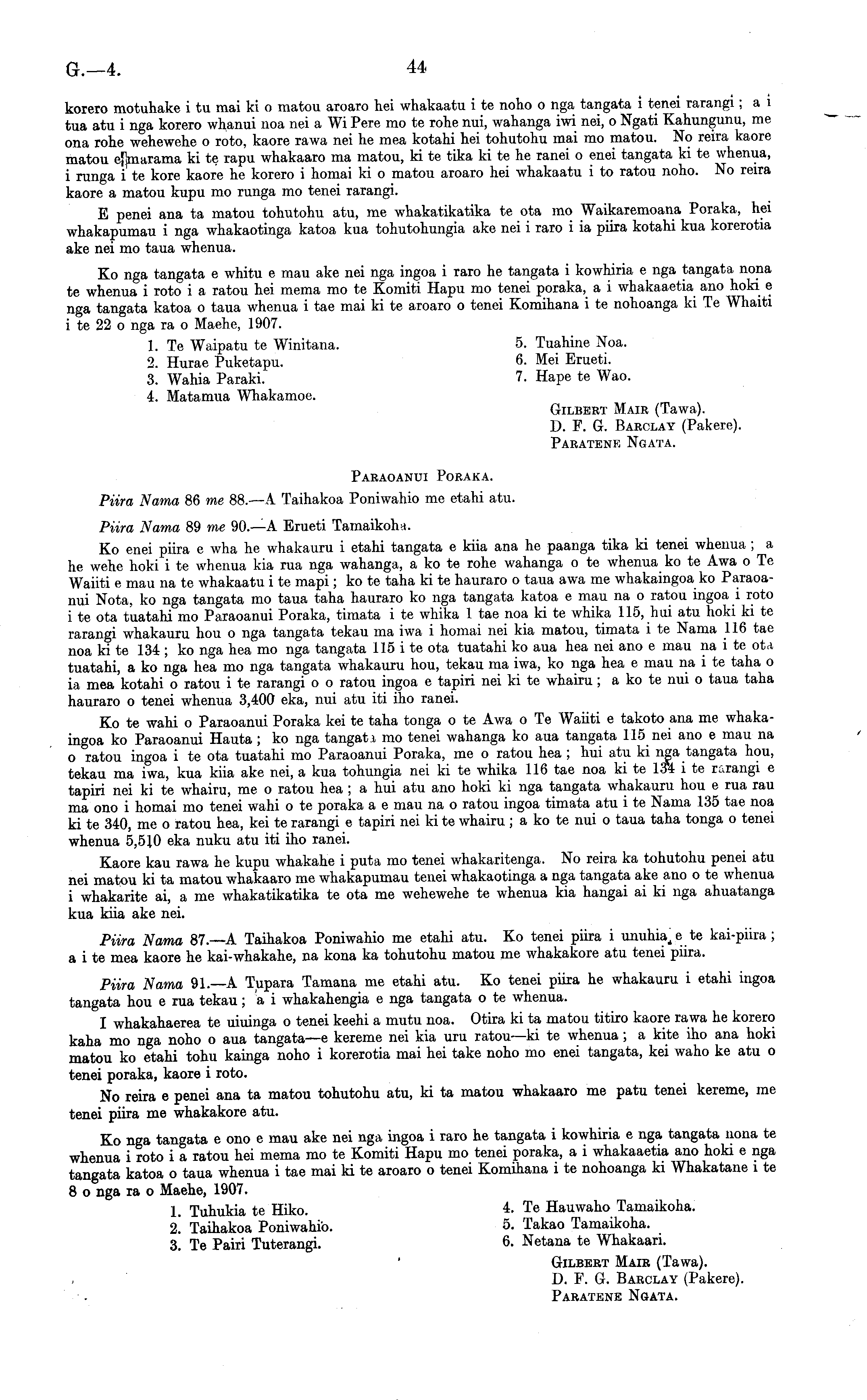 korero motuhake itu mai ki o matou aroaro hei whakaatu ite noho o nga tangata i tenei rarangi; a 1 tua atu i nga korero whanui noa nei a Wi Pere mo te rohe nui, wahanga iwi nei, o Ngati Kahungunu, me ona rohe wehewehe o roto, kaore rawa nei he mea kotahi hei tohutohu mai mo matou. No reira kaorc matou e[]marama ki te rapu whakaaro ma matou, ki te tika ki te he ranei o enei tangata ki te whenua, i runga ite kore kaore he korero i homai ki o matou aroaro hei whakaatu ito ratou noho. No reira kaore a matou kupu mo runga mo tenei rarangi. E penei ana ta matou tohutohu atu, me whakatikatika te ota mo Waikaremoana Poraka, hei whakapumau i nga whakaotinga katoa kua tohutohungia ake nei i raro i ia piira kotahi kua korerotia ake nei mo taua whenua. Ko nga tangata e whitu e mau ake nei nga ingoa i raro he tangata i kowhiria e nga tangata nona te whenua i roto i a ratou hei mema mo te Komiti Hapu mo tenei poraka, a i whakaaetia ano hoki e nga tangata katoa o taua whenua i tae mai ki te aroaro o tenei Komihana i te nohoanga ki Te Whaiti i te 22 o nga ra o Maehe, 1907. 1. Te Waipatu te Winitana. 5. Tuahine Noa. 2. Hurae Puketapu. 6. Mei Erueti. 3. Wahia Paraki. 7. Hape te Wao. 4. Matamua Whakamoe. Gilbert Mair (Tawa). D. F. G. Barclay (Pakere). PARATENE NβATA. Paraoanui Poraka. Piira Nama 86 me 88. —A Taihakoa Poniwahio me etahi atu. Piira Nama 89 me 90.—A Erueti Tamaikoha. Ko enei piira e wha he whakauru i etahi tangata e kiia ana he paanga tika ki tenei whenua ; a he wehe hoki i te whenua kia rua nga wahanga, a ko te rohe wahanga o te whenua ko te Awa o Te Waiiti e mau na te whakaatu ite mapi; ko te taha ki te hauraro o taua awa me whakaingoa ko Paraoanui Nota, ko nga tangata mo taua taha hauraro ko nga tangata katoa e mau na o ratou ingoa i roto i te ota tuatahi mo Paraoanui Poraka, timata i te whika 1 tae noa ki te whika 115, hui atu hoki ki te rarangi whakauru hou o nga tangata tekau ma iwa i homai nei kia matou, timata i te Nama 116 tae noa ki te 134 ; ko nga hea mo nga tangata 115 i te ota tuatahi ko aua hea nei ano e mau na i te ot.i tuatahi, a ko nga hea mo nga tangata whakauru hou, tekau ma iwa, ko nga hea e mau na i te taha o ia mea kotahi o ratou i te rarangi o o ratou ingoa e tapiri nei ki te whairu ; a ko te nui o taua taha hauraro o tenei whenua 3,400 eka, nui atu iti iho ranei. Ko te wahi o Paraoanui Poraka kei te taha tonga o te Awa o Te Waiiti e takoto ana me whakaingoa ko Paraoanui Hauta ; ko nga tangati mo tenei wahanga ko aua tangata 115 nei ano e mau na 0 ratou ingoa i te ota tuatahi mo Paraoanui Poraka, me o ratou hea ; hui atu ki nga tangata hou, tekau ma iwa, kua kiia ake nei, a kua tohungia nei ki te whika 116 tae noa ki te 13U i te rarangi e tapiri nei ki te whairu, me o ratou hea ; a hui atu ano hoki ki nga tangata whakauru hou e rua rau ma ono i homai mo tenei wahi o te poraka a e mau na o ratou ingoa timata atu i te Nama 135 tae noa ki te 340, me o ratou hea, kei te rarangi e tapiri nei ki te whairu ; a ko te nui o taua taha tonga o tenei whenua 5,510 eka nuku atu iti iho ranei. Kaore kau rawa he kupu whakahe i puta mo tenei whakaritenga. No reira ka tohutohu penei atu nei matou ki ta matou whakaaro me whakapumau tenei whakaotinga a nga tangata ake ano o te whenua 1 whakarite ai, a me whakatikatika te ota me wehewehe te whenua kia hangai ai ki nga ahuatanga kua kiia ake nei. Piira Nama 87.—A Taihakoa Poniwahio me etahi atu. Ko tenei piira i te kai-piira ; a i te mea kaore he kai-whakahe, na kona ka tohutohu matou me whakakore atu tenei piira. Piira Nama 91.—A Tupara Tamana me etahi atu. Ko tenei piira he whakauru i etahi ingoa tangata hou e rua tekau; a i whakahengia e nga tangata ote whenua. I whakahaerea te uiuinga o tenei keehi a mutu noa. Otira ki ta matou titiro kaore rawa he korero kaha mo nga noho o aua tangata—e kereme nei kia uru ratou—ki te whenua; a kite iho ana hoki matou ko etahi tohu kainga noho i korerotia mai hei take noho mo enei tangata, kei waho ke atu o tenei poraka, kaore i roto. No reira e penei ana ta matou tohutohu atu, ki ta matou whakaaro me patu tenei kereme, me tenei piira me whakakore atu. Ko nga tangata e ono e mau ake nei nga ingoa i raro he tangata i kowhiria e nga tangata nona te whenua i roto i a ratou hei mema mo te Komiti Hapu mo tenei poraka, a i whakaaetia ano hoki e nga tangata katoa o taua whenua i tae mai ki te aroaro o tenei Komihana i te nohoanga ki Whakatane i te 8 o nga ra o Maehe, 1907. 1. Tuhukia te Hiko. 4- Te Hauwaho Tamaikoha. 2. Taihakoa Poniwahio. 5- Takao Tamaikoha. 3. Te Pairi Tuterangi. 6- Netana te Whakaari. Gilbert Mair (Tawa). D. F. G. Barclay (Pakere). - Paratene Ngata.