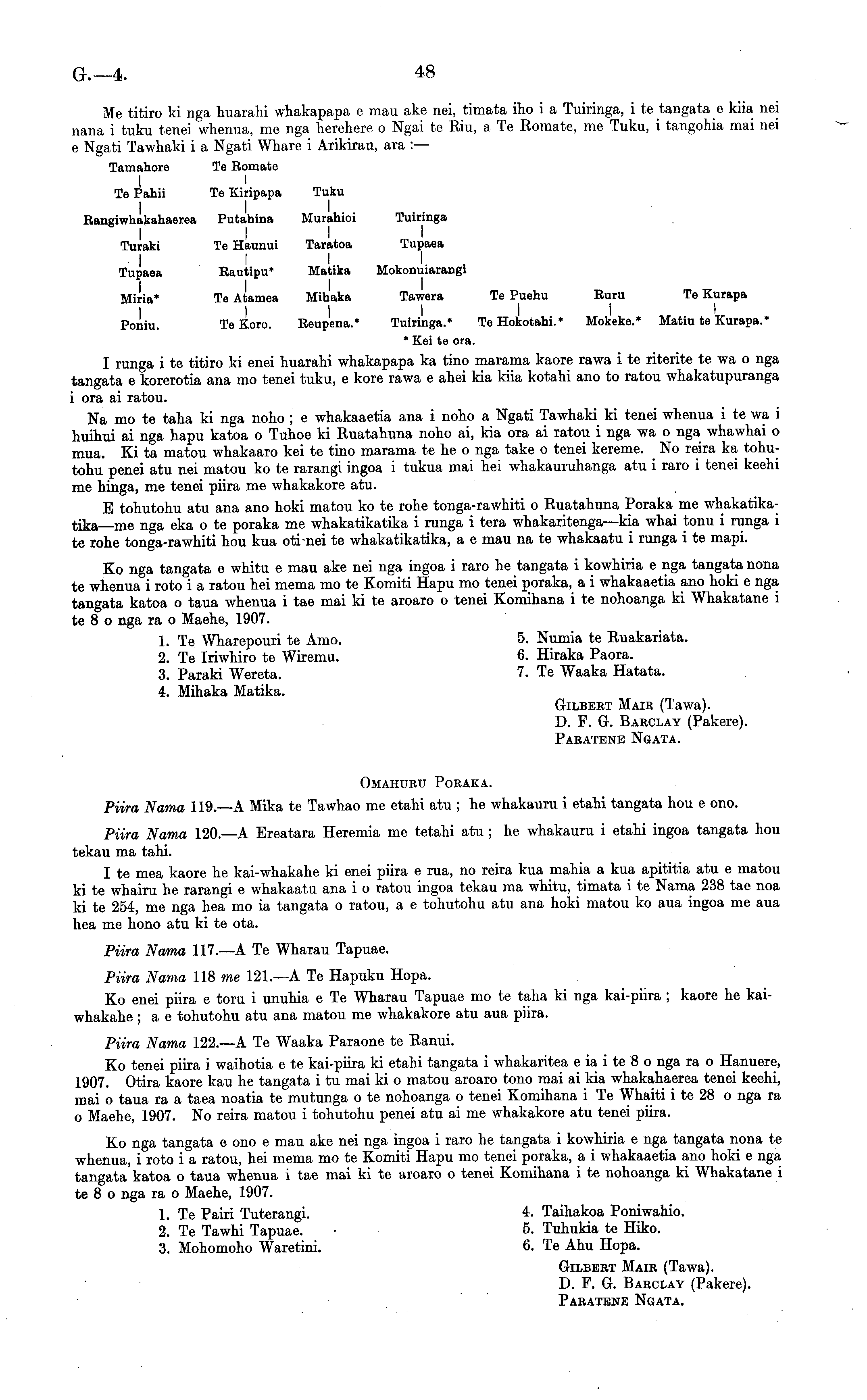 Me titiro ki nga huarahi whakapapa e mau ake nei, timata iho i a Tuiringa, i te tangata _e kiia nei nana i tuku tenei whenua, me nga lierehere o Ngai te Riu, a Te Romate, me Tuku, i tangohia mai nei e Ngati Tawhaki i a Ngati Whare i Arikirau, ara : — Tamahore Te Romate I I Te Pahii Te Kiripapa Tuku Rangiwhakahaerea Putahina Murahioi Tuiringa Turaki Te Haunui Taratoa Tupaea I I I I Tupaea Rautipu* Matika Mokonuiarangi Miria , Te Atamea Mihaka Tawera Te Puehu Ruru Te Kurapa Poniu. Te Koro. Reupena.* Tuiringa.* TeHokotahi.* Mokeke.* Matiu te Kurapa. * * Kei te ora. I runga i te titiro ki enei huarahi whakapapa ka tino marama kaore rawa i te riterite te wa o nga tangata e korerotia ana mo tenei tuku, e kore rawa e ahei kia kiia kotahi ano to ratou whakatupuranga i ora ai ratou. Na mo te taha ki nga noho; e whakaaetia ana i noho a Ngati Tawhaki ki tenei whenua itewa i huihui ai nga hapu katoa o Tuhoe ki Ruatahuna noho ai, kia ora ai ratou i nga wa o nga whawhai o mua. Ki ta matou whakaaro kei te tino marama te he o nga take o tenei kereme. No reira ka tohutohu penei atu nei matou ko te rarangi ingoa i tukua mai hei whakauruhanga atu i raro i tenei keehi me hinga, me tenei piira me whakakore atu. E tohutohu atu ana ano hoki matou ko te rohe tonga-rawhiti o Ruatahuna Poraka me whakatikatika—me nga eka ote poraka me whakatikatika i runga i tera whakaritenga—kia whai tonu i runga i te rohe tonga-rawhiti hou kua oti-nei te whakatikatika, a e mau na te whakaatu i runga i te mapi. Ko nga tangata e whitu e mau ake nei nga ingoa i raro he tangata i kowhiria e nga tangata nona te whenua i roto i a ratou hei mema mo te Komiti Hapu mo tenei poraka, a i whakaaetia ano hoki e nga tangata katoa o taua whenua i tae mai ki te aroaro o tenei Komihana i te nohoanga ki Whakatane i te 8 o nga ra o Maehe, 1907. 1. Te Wharepouri te Amo. 5. Numia te Ruakariata. 2. Te Iriwhiro te Wiremu. 6. Hiraka Paora. 3. Paraki Wereta. 7. Te Waaka Hatata. 4. Mihaka Matika. Gilbert Mair (Tawa). D. F. G. Barclay (Pakere). Paeatbne Ngata. Omahuru Poraka. Piira Nama 119.—A Mika te Tawhao me etahi atu ; he whakauru i etahi tangata hou e ono. Piira Nama 120.—A Ereatara Heremia me tetahi atu; he whakauru i etahi ingoa tangata hou tekau ma tahi. I te mea kaore he kai-whakahe ki enei piira e rua, no reira kua mahia a kua apititia atu e matou ki te whairu he rarangi e whakaatu ana i o ratou ingoa tekau ma whitu, timata i te Nama 238 tae noa ki te 254, me nga hea mo ia tangata o ratou, a e tohutohu atu ana hoki matou ko aua ingoa me aua hea me hono atu ki te ota. Piira Nama 117.—A Te Wharau Tapuae. Piira Nama 118 me 121.—A Te Hapuku Hopa. Ko enei piira e toru i unuhia e Te Wharau Tapuae mo te taha ki nga kai-piira ; kaore he kaiwhakahe ; a e tohutohu atu ana matou me whakakore atu aua piira. Piira Nama 122. —A Te Waaka Paraone te Ranui. Ko tenei piira i waihotia e te kai-piira ki etahi tangata i whakaritea e ia i te 8 o nga ra o Hanuere, 1907. Otira kaore kau he tangata itu mai ki o matou aroaro tono mai ai kia whakahaerea tenei keehi, mai o taua ra a taea noatia te mutunga o te nohoanga o tenei Komihana i Te Whaiti i te 28 o nga ra o Maehe, 1907. No reira matou i tohutohu penei atu ai me whakakore atu tenei piira. Ko nga tangata e ono e mau ake nei nga ingoa i raro he tangata i kowhiria e nga tangata nona te whenua, i roto i a ratou, hei mema mo te Komiti Hapu mo tenei poraka, a i whakaaetia ano hoki e nga tangata katoa o taua whenua i tae mai ki te aroaro o tenei Komihana i te nohoanga ki Whakatane i te 8 o nga ra o Maehe, 1907. 1. Te Pairi Tuterangi. 4. Taihakoa Poniwahio. 2. Te Tawhi Tapuae. • 5. Tuhukia te Hiko. 3. Mohomoho Waretini. 6. Te Ahu Hopa. Gilbert Mair (Tawa). D. F. G. Barclay (Pakere). Paratene Ngata.