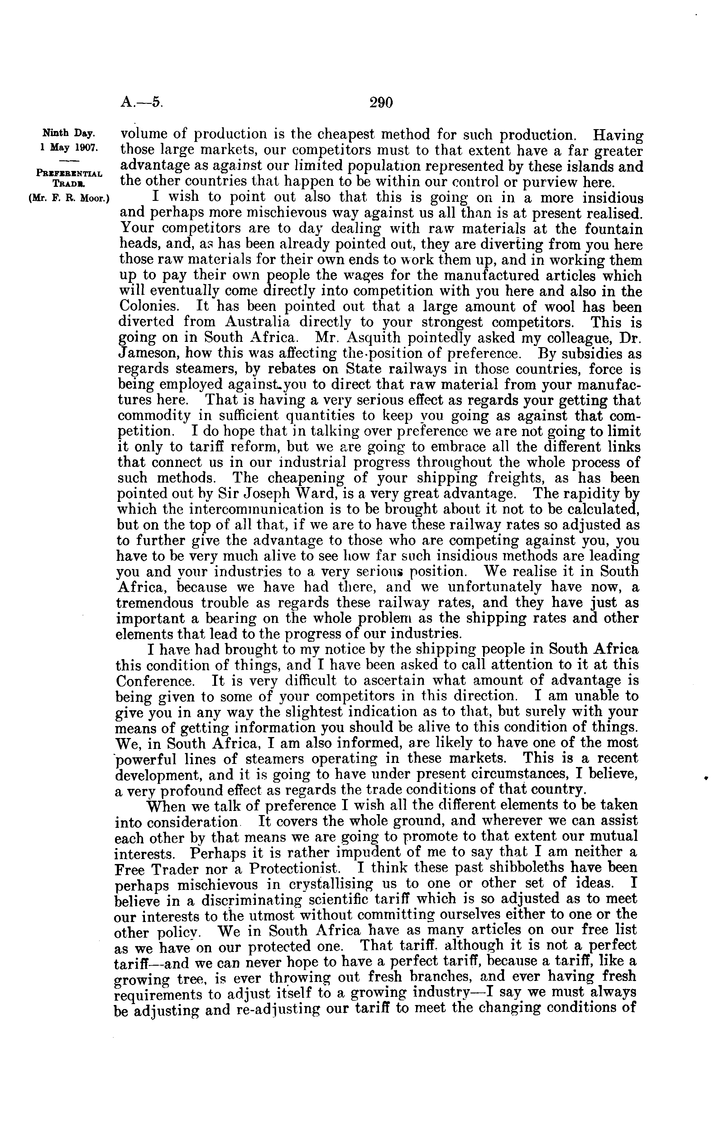volume of production is the cheapest method for such production. Having those large markets, our competitors must to that extent have a far greater advantage as against our limited population represented by these islands and the other countries that happen to be within our control or purview here. I wish to point out also that this is going on in a more insidious and perhaps more mischievous way against us all than is at present realised. Your competitors are to day dealing with raw materials at the fountain heads, and, as has been already pointed out, they are diverting from you here those raw materials for their own ends to work them up, and in working them up to pay their own people the wages for the manufactured articles which will eventually come directly into competition with you here and also in the Colonies. It has been pointed out that a large amount of wool has been diverted from Australia directly to your strongest competitors. This is going on in South Africa. Mr. Asquith pointedly asked my colleague, Dr. Jameson, how this was affecting the-position of preference. By subsidies as regards steamers, by rebates on State railways in those countries, force is being employed against.you to direct that raw material from your manufactures here. That is having a very serious effect as regards your getting that commodity in sufficient quantities to keep you going as against that competition. Ido hope that in talking over preference we are not going to limit it only to tariff reform, but we are going to embrace all the different links that connect us in our industrial progress throughout the whole process of such methods. The cheapening of your shipping freights, as has been pointed out by Sir Joseph Ward, is a very great advantage. The rapidity by which the intercommunication is to be brought about it not to be calculated, but on the top of all that, if we are to have these railway rates so adjusted as to further give the advantage to those who are competing against you, you have to be very much alive to see how far such insidious methods are leading you and your industries to a very serious position. We realise it in South Africa, because we have had there, and we unfortunately have now, a tremendous trouble as regards these railway rates, and they have just as important a bearing on the whole problem as the shipping rates and other elements that lead to the progress of our industries. I have had brought to my notice by the shipping people in South Africa this condition of things, and I have been asked to call attention to it at this Conference. It is very difficult to ascertain what amount of advantage is being given to some of your competitors in this direction. lam unable to give you in any way the slightest indication as to that, but surely with your means of getting information you should be alive to this condition of things. We, in South Africa, I am also informed, are likely to have one of the most powerful lines of steamers operating in these markets. This is a recent development, and it is going to have under present circumstances, I believe, a very profound effect as regards the trade conditions of that country. When we talk of preference I wish all the different elements to be taken into consideration It covers the whole ground, and wherever we can assist each other by that means we are going to promote to that extent our mutual interests. Perhaps it is rather impudent of me to say that I am neither a Free Trader nor a Protectionist. I think these past shibboleths have been perhaps mischievous in crystallising us to one or other set of ideas. I believe in a discriminating scientific tariff which is so adjusted as to meet our interests to the utmost without committing ourselves either to one or the other policy. We in South Africa have as many articles on our free list as we have on our protected one. That tariff, although it is not a perfect tariff and we can never hope to have a perfect tariff, because a tariff, like a growing tree, is ever throwing out fresh branches, and ever having fresh requirements to adjust itself to a growing industry—l say we must always be adjusting and re-adjusting our tariff to meet the changing conditions of