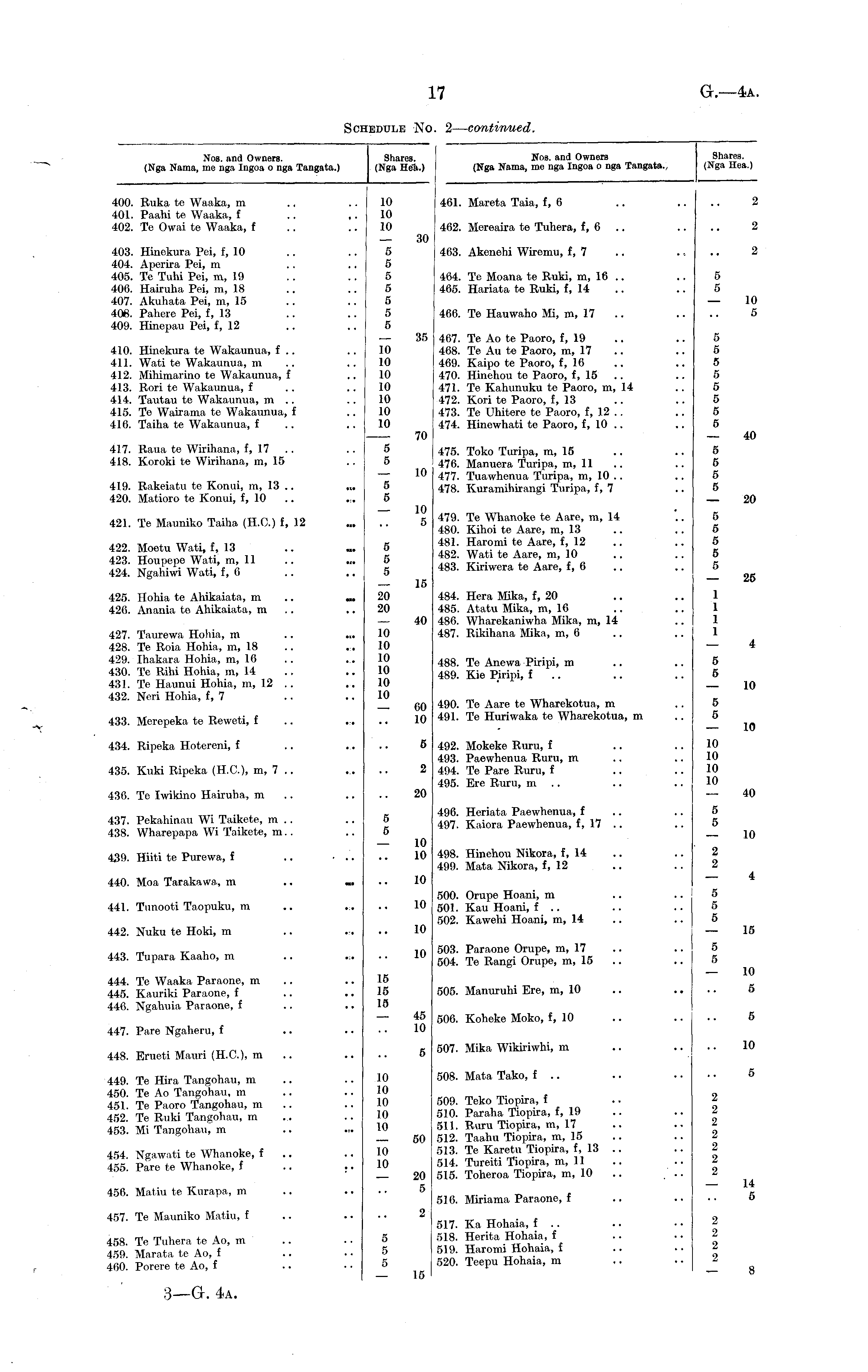 Nos. and Owners. (Nga Nama, me nga Ingoa o nga Tangata.) Shares. (Nga He*a.) Nos. and Owners (Nga Nama, me nga Ingoa o nga Tangata., Shares. (Nga Hea.) 400. Ruka to Waaka, m 401. Paahi te Waaka, f 402. Te Owai te Waaka, f 10 10 10 461. Mareta Taia, £,6 2 462. Mereaira te Tuhera, f, 6 2 403. Hinekura Pei, f, 10 404. Aperira Pei, m 405. Te Tuhi Pei, m, 19 406. Hairuha Pei, m, 18 407. Akuhata Pei, m, 15 408. Pahere Pei, f, 13 409. Hinepau Pei, f, 12 5 5 5 5 5 5 5 30 463. Akenehi Wiremu, f, 7 464. Te Moana te Ruki, m, 16 465. Hariata te Ruki, f, 14 5 5 2 466. Te Hauwaho Mi, m, 17 10 5 410. Hinekura te Wakaunua, f .. 411. Wati te Wakaunua, m 412. Mihimarino te Wakaunua, £ 413. Rori te Wakaunua, f 414. Tautau te Wakaunua, m .. 415. Te Wairama te Wakaunua, f 416. Taiha to Wakaunua, f 10 10 10 10 10 10 10 35 467. Te Ao te Paoro, f, 19 468. Te Au te Paoro, m, 17 469. Kaipo te Paoro, f, 16 470. Hinehou te Paoro, £,15 471. Te Kahunuku te Paoro, m, 14 472. Kori te Paoro, f, 13 473. Te Uhitere te Paoro, f, 12 .. 474. Hinewhati te Paoro, f, 10 5 5 5 5 5 5 5 5 70 40 417. Raua te Wirihana, f, 17 418. Koroki te Wirihana, m, 15 5 5 475. Toko Turipa, m, 15 476. Manuera Turipa, m, 11 477. Tuawhenua Turipa, m, 10 .. 478. Kuramihirangi Turipa, f, 7 5 5 5 5 10 419. Rakeiatu te Konui, m, 13 .. 420. Matioro te Konui, f, 10 5 5 20 421. To Mauniko Taiha (H.C) f, 12 10 5 479. Te Whanoke te Aare, m, 14 480. Kihoi te Aare, m, 13 481. Haromi te Aare, f, 12 482. Wati te Aare, m, 10 483. Kiriwera te Aare, f, 6 5 5 5 5 5 422. Moetu Wati, f, 13 423. Houpepe Wati, m, 11 424. Ngahiwi Wati, f, 6 5 5 5 20 20 15 26 425. Hohia te Ahikaiata, m 426. Anania te Ahikaiata, m 484. Hera Mika, f, 20 485. Atatu Mika, m, 16 486. Wharekaniwha Mika, m, 14 487. Rikihana Mika, m, 6 1 1 1 1 427. Taurewa Hohia, m 428. Te Roia Hohia, m, 18 429. Ihakara Hohia, m, 16 430. Te Rihi Hohia, in, 14 431. Te Haunui Hohia, m, 12 432. Neri Hohia, £,7 10 10 10 10 10 10 40 488. Te Anewa Piripi, m 489. Kie Piripi, f .. 5 5 4 10 60 10 490. Te Aare te Wharekotua, m 491. Te Huriwaka te Wharekotua, m 5 5 433. Merepeka te Reweti, £ 10 434. Ripeka Hotereni, f 5 492. Mokeko Ruru, f 493. Paewhenua Ruru, m 494. Te Pare Ruru, f 495. Ere Ruru, m .. 10 10 10 10 435. Kuki Ripeka (H.C), m, 7 .. 2 436. Te Iwikino Hairuha, m 20 40 437. Pekahinau Wi Taikete, m .. 438. Wharepapa Wi Taikete, m.. 5 5 496. Heriata Paewhenua, f 497. Kaiora Paewhenua, f, 17 5 5 10 439. Hiiti te Purewa, f 10 10 498. Hinehou Nikora, f, 14 499. Mata Nikora, f, 12 2 2 440. Moa Tarakawa, m 10 4 441. Tunooti Taopuku, m 10 500. Orupe Hoani, m 501. Kau Hoani, f .. 502. Kawehi Hoani, m, 14 5 5 5 442. Nuku te Hoki, m 10 15 443. Tupara Kaaho, m 10 503. Paraone Orupe, m, 17 504. Te Rangi Orupe, m, 15 5 5 444. Te Waaka Paraone, m 445. Kauriki Paraone, £ 440. Ngahuia Paraone, f 15 15 15 505. Manuruhi Ere, m, 10 10 5 45 10 506. Koheke Moko, f, 10 5 447. Pare Ngaheru, f 10 448. Erueti Mauri (H.C), m 5 507. Mika Wikiriwhi, m 449. Te Hira Tangohau, m 450. Te Ao Tangohau, m 451. Te Paoro Tangohau, m 452. Te Ruki Tangohau, m 453. Mi Tangohau, m 10 10 10 10 10 508. Mata Tako, f .. 5 50 509. Teko Tiopira, f 510. Paraha Tiopira, f, 19 511. Ruru Tiopira, m, 17 512. Taahu Tiopira, m, 15 513. Te Karetu Tiopira, f, 13 514. Tureiti Tiopira, m, 11 515. Toheroa Tiopira, m, 10 2 2 2 2 2 2 2 454. Ngawati te Whanoke, f 455. Pare te Whanoke, f 10 10 466. Matiu te Kurapa, m 20 5 14 5 516. Miriama Paraone, f 457. Te Mauniko Matiu, f 2 517- Ka Hohaia, £ .. 518. Herita Hohaia, f 519. Haromi Hohaia, f 520. Teepu Hohaia, m 2 2 2 2 458. Te Tuhera te Ao, m 459. Marata te Ao, f 460. Porere te Ao, f 5 5 5 15 8