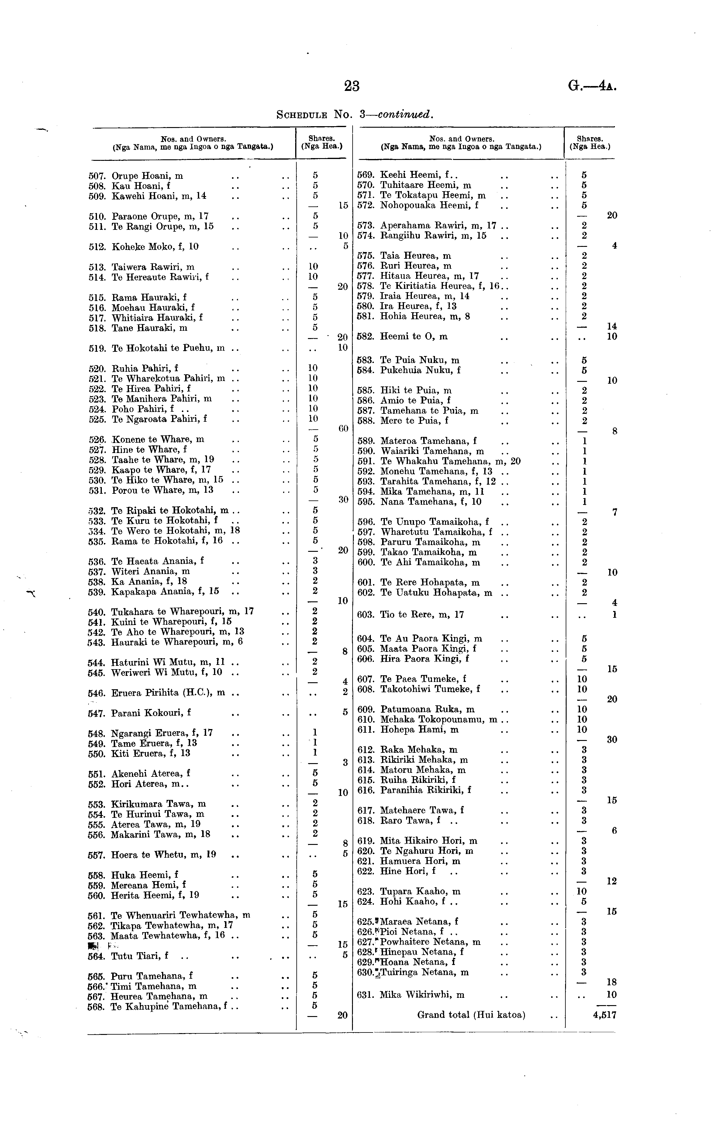 Nos. and Owners. (Nga Nama, me nga Ingoa o nga Tangata.) Shares. (Nga Hea.) Nos. and Owners. (Nga Nama, me nga Ingoa o nga Tangata.) Shares. (Nga Hea.) 507. Orupe Hoani, m 508. Kau Hoani, f 509. Kawehi Hoani, m, 14 5 6 5 569. Keehi Heemi, f.. 570. Tuhitaare Heemi, m 571. Te Tokatapu Heemi, m 572. Nohopouaka Heemi, f 5 5 5 5 510. Paraone Orupe, m, 17 511. Te Rangi Orupe, m, 15 — 15 5 5 2 2 20 — 10 5 573. Aperahama Rawiri, m, 17 .. 574. Rangiihu Rawiri, m, 15 512. Koheke Moko, f, 10 575. Taia Heurea, m 576. Ruri Heurea, m 577. Hitaua Heurea, m, 17 578. Te Kiritiatia Heurea, f, 16.. 579. Iraia Heurea, m, 14 580. Ira Heurea, f, 13 581. Hohia Heurea, m, 8 4 513. Taiwera Rawiri, m 514. Te Hereaute Rawiri, f 10 10 — 20 2 2 2 2 2 2 2 515. Rama Hauraki, f 516. Moehau Hauraki, f 517. Whitiaira Hauraki, f 518. Tane Hauraki, m 5 5 5 5 — " 20 10 582. Heemi te O, m 14 10 519. Te Hokotahi te Puehu, m .. 520. Ruhia Pahiri, f 521. Te Wharekotua Pahiri, m .. 522. Te Hirea Pahiri, f 523. Te Manihera Pahiri, m 524. Polio Pahiri, f .. 525. Te Ngaroata Pahiri, f 10 10 10 10 10 10 583. Te Puia Nuku, m 584. Pukehuia Nuku, f 5 5 10 585. Hiki te Puia, m 586. Amio te Puia, f 587. Tamehana te Puia, m 588. Mere te Puia, f 2 2 2 2 526. Konene te Whare, m 527. Hine te Whare, f 528. Taahe te Whare, m, 19 529. Kaapo te Whare, f, 17 530. Te Hiko te Whare, m, 15 531. Porou te Whare, m, 13 — 60 5 5 5 5 5 5 589. Materoa Tamehana, £ 590. Waiariki Tamehana, m 591. Te Whakahu Tamehana, m, 20 592. Monehu Tamehana, f, 13 593. Tarahita Tamehana, f, 12 594. Mika Tamehana, m, 11 595. Nana Tamehana, £,10 8 — 30 532. Te Ripaki te Hokotahi, m .. 533. Te Kuru te Hokotahi, f .. 534. Te Wero te Hokotahi, m, 18 535. Rama te Hokotahi, £,16 5 5 5 5 596. Te Unupo Tamaikoha, f .. 597. Wharetutu Tamaikoha, f .. 598. Paruru Tamaikoha, m 599. Takao Tamaikoha, m 600. Te Ahi Tamaikoha, m 2 2 2 2 2 7 — ■ 20 536. Te Haeata Anania, f 537. Witeri Anania, m 538. Ka Anania, f, 18 539. Kapakapa Anania, f, 15 3 3 2 2 601. To Rere Hohapata, m 602. Te Uatuku Hohapata, m .. 10 2 2 540. Tukahara te Wharepouri, m, 17 541. Kuini te Wharepouri, f, 15 542. Te Aho te Wharepouri, m, 13 543. Hauraki te Wharepouri, m, 6 — 10 2 2 2 2 603. Tio te Rere, m, 17 4 1 — 8 604. Te Au Paora Kingi, m 605. Maata Paora Kingi, f 606. Hira Paora Kingi, f 5 5 5 544. Haturini Wi Mutu, m, 11 .. 545. Weriweri Wi Mutu, f, 10 2 2 10 10 15 546. Eruera Pirihita (H.C), m .. — 4 2 607. Te Paea Tumeke, f 608. Takotohiwi Tumeke, f 547- Parani Kokouri, f 5 609. Patumoana Ruka, m 610. Mehaka Tokopounamu, m .. 611. Hohepa Hami, m 10 10 10 20 548. Ngarangi Eruera, f, 17 549. Tame Eruera, f, 13 550. Kiti Eruera, f, 13 1 1 1 612. Raka Mehaka, m 613. Rikiriki Mehaka, m 614. Matoru Mehaka, m 615. Ruiha Rikiriki, f 616. Paranihia Rikiriki, f 3 3 3 3 3 30 551. Akenehi Aterea, f 552. Hori Aterea, m.. — 3 5 5 553. Kirikumara Tawa, m 554. Te Hurinui Tawa, m 555. Aterea Tawa, m, 19 556. Makarini Tawa, m, 18 — 10 2 2 2 2 617. Matehaere Tawa, f 618. Raro Tawa, £ .. 3 3 15 557. Hoera te Whetu, m, 19 — 8 5 619. Mita Hikairo Hori, m 620. Te Ngahuru Hori, m 621. Hamuera Hori, m 622. Hine Hori, f .. 3 3 3 3 6 558. Huka Heemi, f 559. Mereana Hemi, f 560. Herita Heemi, f, 19 5 5 5 623. Tupara Kaaho, m 624. Hohi Kaaho, f .. 12 10 5 561. Te Whenuariri Tewhatewha, m 562. Tikapa Tewhatewha, m, 17 563. Maata Tewhatewha, f, 16 .. m i ■ 564. Tutu Tiari, f .. — 15 5 5 5 625.* Maraea Netana, f 626.?-Pioi Netana, f .. 627." , Powhaitere Netana, m 628. r Hinepau Netana, f 629."Hoana Netana, f 630."Tuiringa Netana, m 3 3 3 3 3 3 15 — 15 5 565. Puru Tamehana, f 666." Timi Tamehana, m 567. Heurea Tamehana, m 568. Te Kahupine Tamehana, f .. 5 5 5 5 631. Mika Wikiriwhi, m 18 10 — 20 Grand total (Hui katoa) 4,517
