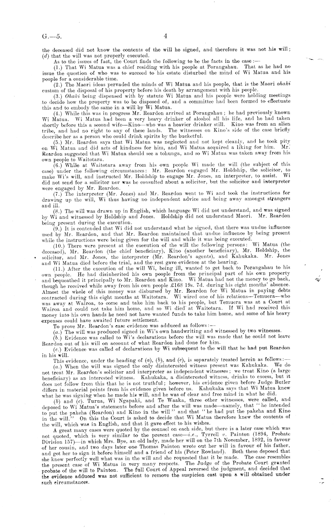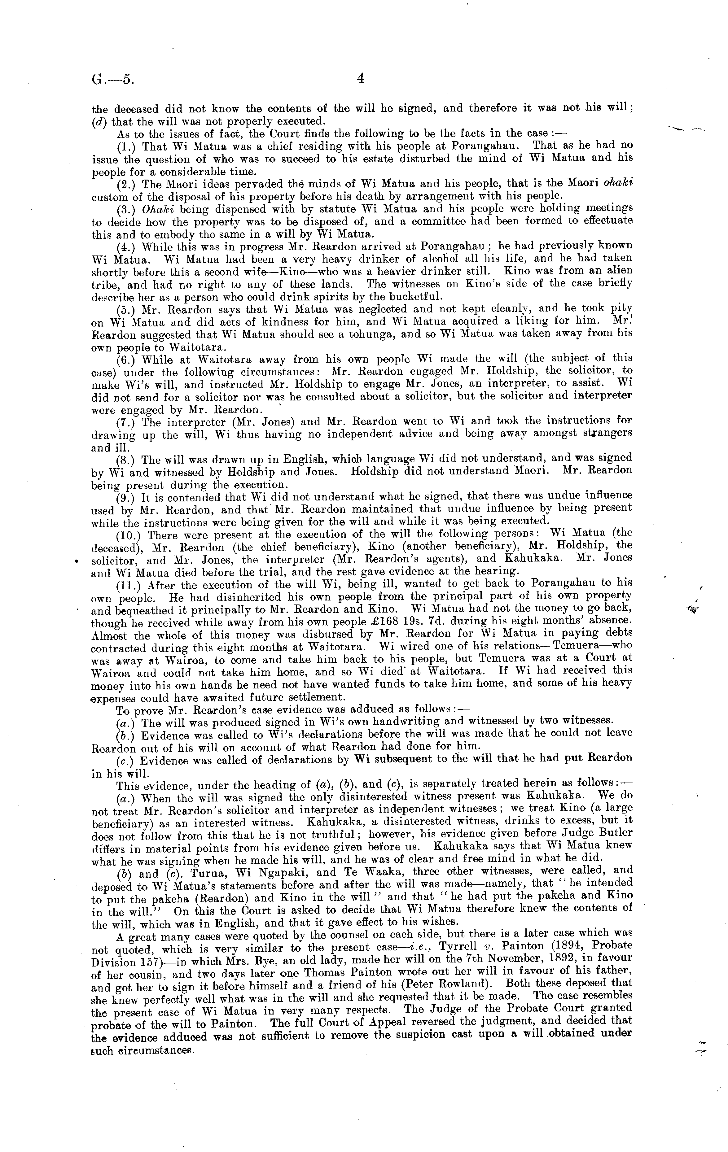 the deceased did not know the contents of the will he signed, and therefore it was not his will; (d) that the will was not properly executed. As to the issues of fact, the Court finds the following to be the facts in the case : — (1.) That Wi Matua was a chief residing with his people at Porangahau. That as he had no issue the question of who was to succeed to his estate disturbed the mind of Wi Matua and his people for a considerable time. (2.) The Maori ideas pervaded the minds of Wi Matua and his people, that is the Maori ohaki custom of the disposal of his property before his death by arrangement with his people. (3.) Ohaki being dispensed with by statute Wi Matua and his people were holding meetings to decide how the property was to be disposed of, and a committee had been formed to effectuate this and to embody the same in a will by Wi Matua. (4.) While this was in progress Mr. Keardon arrived at Porangahau ; he had previously known Wi Matua. Wi Matua had been a very heavy drinker of alcohol all his life, and he had taken shortly before this a second wife—Kino —who was a heavier drinker still. Kino was from an alien tribe, and had no right to any of these lands. The witnesses on Kino's side of the case briefly describe her as a person who could drink spirits by the bucketful. (5.) Mr. Reardon says that Wi Matua was neglected and not kept cleanly, and he took pity on Wi Matua and did acts of kindness for him, and Wi Matua acquired a liking for him. Mr. 1 Reardon suggested that Wi Matua should see a tohunga, and so Wi Matua was taken away from his own people to Waitotara. (6.) While at Waitotara away from his own people Wi made the will (the subject of this case) under the following circumstances: Mr. Reardon engaged Mr. Holdship, the solicitor, to make Wi's will, and instructed Mr. Holdship to engage Mr. Jones, an interpreter, to assist. Wi did not send for a solicitor nor was he consulted about a solicitor, but the solicitor and interpreter were engaged by Mr. Reardon. (7.) The interpreter (Mr. Jones) and Mr. Reardon went to Wi and took the instructions for drawing up the will, Wi thus having no independent advice and being away amongst strangers and ill. (8.) The will was drawn up in English, which language Wi did not understand, and was signed by Wi and witnessed by Holdship and Jones. Holdship did not understand Maori. Mr. Reardon being present during the execution. (9.) It is contended that Wi did not understand what he signed, that there was undue influence used by Mr. Reardon, and that Mr. Reardon maintained that undue influence by being present while the instructions were being given for the will and while it was being executed. (10.) There were present at the execution of the will the following persons: Wi Matua (the deceased), Mr. Reardon (the chief beneficiary), Kino (another beneficiary), Mr. Holdship, the solicitor, and Mr. Jones, the interpreter (Mr. Reardon's agents), and Kahukaka. Mr. Jones and Wi Matua died before the trial, and the rest gave evidence at the hearing. (11.) After the execution of the will Wi, being ill, wanted to get back to Porangahau to his own people. He had disinherited his own people from the principal part of his own property and bequeathed it principally to Mr. Reardon and Kino. Wi Matua had not the money to go back, though he received while away from his own people £168 19s. 7d. during his eight months' absence. Almost the whole of this money was disbursed by Mr. Reardon for Wi Matua in paying debts contracted during this eight months at Waitotara. Wi wired one of his relations—Temuera —who was away at Wairoa, to come and take him back to his people, but Temuera was at a Court at Wuiroa and could not take him home, and so Wi died at Waitotara. If Wi had received this money into his own hands he need not have wanted funds to take him home, and some of his heavy expenses could have awaited future settlement. To prove Mr. Reardon's ease evidence was adduced as follows: — (a.) The will was produced signed in Wi's own handwriting and witnessed by two witnesses. (b.) Evidence was called to Wi's declarations before the will was made that he could not leave Reardon out of his will on account of what Reardon had done for him. (c.) Evidence was called of declarations by Wi subsequent to the will that he had put Reardon in his will. This evidence, under the heading of (a), (b), and (c), is separately treated herein as follows: — (a.) When the will was signed the only disinterested witness present was Kahukaka. We do not treat Mr. Reardon's solicitor and interpreter as independent witnesses; we treat Kino (a large beneficiary) as an interested witness. Kahukaka, a disinterested witness, drinks to excess, but it does not follow from this that he is not truthful; however, his evidence given before Judge Butler differs in material points from his evidence given before us. Kahukaka says that Wi Matua knew what he was signing when he made his will, and he was of clear and free mind in what he did. (b) and (c). Turua, Wi Ngapaki, and Te Waaka, three other witnesses, were called, and deposed to Wi Matua's statements before and after the will was made —namely, that "he intended to put the pakeha (Reardon) and Kino in the will " and that " he had put the pakeha and Kino in the will." On this the Court is asked to decide that Wi Matua therefore knew the contents of the will, which was in English, and that it gave effect to his wishes. A great many cases were quoted by the counsel on each side, but there is a later case which was not quoted, which is very similar to the present case — i.e., Tyrrell v. Painton (1894, Probate Division 157)— in which Mrs. Bye, an old lady, made her will on the 7th November, 1892, in favour of her cousin, and two days later one Thomas Painton wrote out her will in favour of his father, and got her to sign it before himself and a friend of his (Peter Rowland). Both these deposed that she knew perfectly well what was