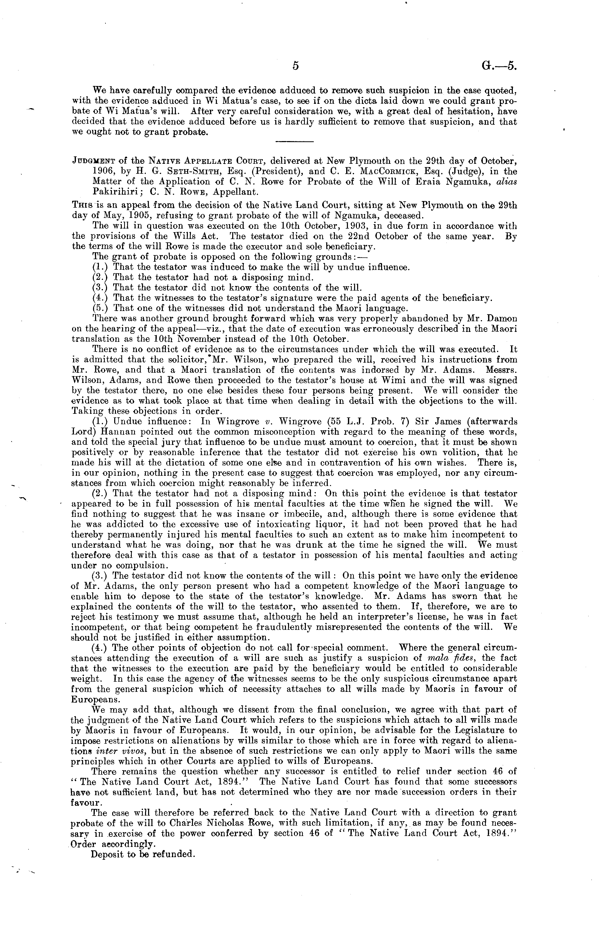 Judgment of the Native Appellate Court, delivered at New Plymouth on the 29th day of October, 1906, by H. G. Seth-Smith, Esq. (President), and C. E. MacCoemick, Esq. (Judge), in the Matter of the Application of C. N. Rowe for Probate of the Will of Eraia Ngamuka, alias Pakirihiri; C. N. Rowe, Appellant. This is an appeal from the decision of the Native Land Court, sitting at New Plymouth on the 29th day of May, 1905, refusing to grant probate of the will of Ngamuka, deceased. The will in question was executed on the 10th October, 1903, in due form in accordance with the provisions of the Wills Act. The testator died on the 22nd October of the same year. By the terms of the will Rowe is made the executor and sole beneficiary. The grant of probate is opposed on the following grounds: — (1.) That the testator was induced to make the will by undue influence. (2.) That the testator had not a disposing mind. (3.) That the testator did not know the contents of the will. (4.) That the witnesses to the testator's signature were the paid agents of the beneficiary. (5.) That one of the witnesses did not understand the Maori language. There was another ground brought forward which was very properly abandoned by Mr. Damon on the hearing of the appeal—viz., that the date of execution was erroneously described in the Maori translation as the 10th November instead of the 10th October. There is no conflict of evidence as to the circumstances under which the will was executed. It is admitted that the solicitor,* Mr. Wilson, who prepared the will, received his instructions from Mr. Rowe, and that a Maori translation of the contents was indorsed by Mr. Adams. Messrs. Wilson, Adams, and Rowe then proceeded to the testator's house at Wimi and the will was signed by the testator there, no one else besides these four persons being present. We will consider the evidence as to what took place at that time when dealing in detail with the objections to the will. Taking these objections in order. (1.) Undue influence: In Wingrove v. Wingrove (55 L.J. Prob. 7) Sir James (afterwards Lord) Hannan pointed out the common misconception with regard to the meaning of these words, and told the special jury that influence to be undue must amount to coercion, that it must be shown positively or by reasonable inference that the testator did not exercise his own volition, that he made his will at the dictation of some one else and in contravention of his own wishes. There is, in our opinion, nothing in the present case to suggest that coercion was employed, nor any circumstances from which coercion might reasonably be inferred. (2.) That the testator had not a disposing mind: On this point the evidence is that testator appeared to be in full possession of his mental faculties at the time wfren he signed the will. We find nothing to suggest that he was insane or imbecile, and, although there is some evidence that he was addicted to the excessive use of intoxicating liquor, it had not been proved that he had thereby permanently injured his mental faculties to such an extent as to make him incompetent to understand what he was doing, nor that he was drunk at the time he signed the will. We must therefore deal with this case as that of a testator in possession of his mental faculties and acting under no compulsion. (3.) The testator did not know the contents of the will: On this point we have only the evidence of Mr. Adams, the only person present who had a competent knowledge of the Maori language to enable him to depose to the state of the testator's knowledge. Mr. Adams has sworn that he explained the contents of the will to the testator, who assented to them. If, therefore, we are to reject his testimony we must assume that, although he held an interpreter's license, he was in fact incompetent, or that being competent he fraudulently misrepresented the contents of the will. We should not be justified in either assumption. (4.) The other points of objection do not call for special comment. Where the general circumstances attending the execution of a will are such as justify a suspicion of mala fidex, the fact that the witnesses to the execution are paid by the beneficiary would be entitled to considerable weight. In this case the agency of the witnesses seems to be the only suspicious circumstance apart from the general suspicion which of necessity attaches to all wills made by Maoris in favour of Europeans. We may add that, although we dissent from the final conclusion, we agree with that part of the judgment of the Native Land Court which refers to the suspicions which attach to all wills made by Maoris in favour of Europeans. It would, in our opinion, be advisable for the Legislature to impose restrictions on alienations by wills similar to those which are in force with regard to alienations inter vivos, but in the absence of such restrictions we can only apply to Maori wills the same principles which in other Courts are applied to wills of Europeans. There remains the question whether any successor is entitled to relief under section 46 of "The Native Land Court Act, 1894." The Native Land Court has found that some successors have not sufficient land, but has not determined who they are nor made succession orders in their favour. The case will therefore be referred back to the Native Land Court with a direction to grant probate of the will to Charles Nicholas Rowe, with such limitation, if any, as may be found necessary in exercise of the power conferred by section 46 of "The Native Land Court Act, 1894." Order accordingly. Deposit to be refunded.