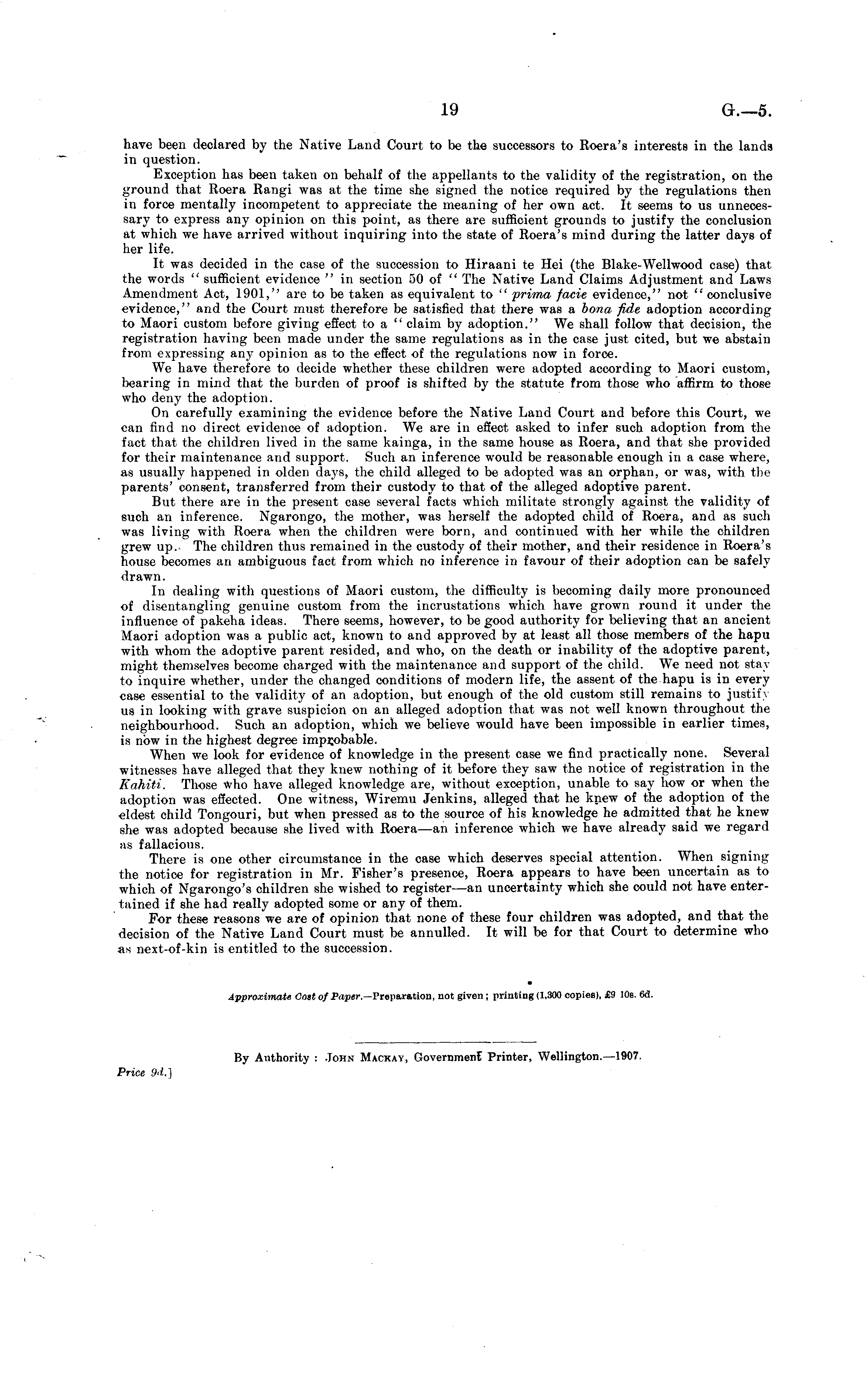 have been declared by the Native Land Court to be the successors to Roera's interests in the lands in question. Exception has been taken on behalf of the appellants to the validity of the registration, on the ground that Roera Rangi was at the time she signed the notice required by the regulations then in force mentally incompetent to appreciate the meaning of her own act. It seems to us unnecessary to express any opinion on this point, as there are sufficient grounds to justify the conclusion at which we have arrived without inquiring into the state of Roera's mind during the latter days of her life. It was decided in the case of the succession to Hiraani te Hei (the Blake-Wellwood case) that the words " sufficient evidence " in section 50 of " The Native Land Claims Adjustment and Laws Amendment Act, 1901," are to be taken as equivalent to " prima facie evidence," not " conclusive evidence," and the Court must therefore be satisfied that there was a bona fide adoption according to Maori custom before giving effect to a " claim by adoption." We shall follow that decision, the registration having been made under the same regulations as in the case just cited, but we abstain from expressing any opinion as to the effect of the regulations now in force. We have therefore to decide whether these children were adopted according to Maori custom, bearing in mind that the burden of proof is shifted by the statute from those who affirm to those who deny the adoption. On carefully examining the evidence before the Native Land Court and before this Court, we can find no direct evidence of adoption. We are in effect asked to infer such adoption from the fact that the children lived in the same kainga, in the same house as Roera, and that she provided for their maintenance and support. Such an inference would be reasonable enough in a case where, as usually happened in olden A&j%, the child alleged to be adopted was an orphan, or was, with the parents' consent, transferred from their custody to that of the alleged adoptive parent. But there are in the present case several facts which militate strongly against the validity of such an inference. Ngarongo, the mother, was herself the adopted child of Roera, and as such was living with Roera when the children were born, and continued with her while the children grew up. The children thus remained in the custody of their mother, and their residence in Roera's house becomes an ambiguous fact from which no inference in favour of their adoption can be safely drawn. In dealing with questions of Maori custom, the difficulty is becoming daily more pronounced of disentangling genuine custom from the incrustations which have grown round it under the influence of pakeha ideas. There seems, however, to be good authority for believing that an ancient Maori adoption was a public act, known to and approved by at least all those members of the hapu with whom the adoptive parent resided, and who, on the death or inability of the adoptive parent, might themselves become charged with the maintenance and support of the child. We need not stay to inquire whether, under the changed conditions of modern life, the assent of the hapu is in every case essential to the validity of an adoption, but enough of the old custom still remains to justify us in looking with grave suspicion on an alleged adoption that was not well known throughout the neighbourhood. Such an adoption, which we believe would have been impossible in earlier times, is now in the highest degree improbable. When we look for evidence of knowledge in the present case we find practically none. Several witnesses have alleged that they knew nothing of it before they saw the notice of registration in the Kahiti. Those who have alleged knowledge are, without exception, unable to say how or when the adoption was effected. One witness, Wiremu Jenkins, alleged that he knew of the adoption of the •eldest child Tongouri, but when pressed as to the source of his knowledge he admitted that he knew she was adopted because she lived with Roera —an inference which we have already said we regard us fallacious. There is one other circumstance in the case which deserves special attention. When signing the notice for registration in Mr. Fisher's presence, Roera appears to have been uncertain as to which of Ngarongo's children she wished to register—an uncertainty which she could not have entertained if she had really adopted some or any of them. For these reasons we are of opinion that none of these four children was adopted, and that the decision of the Native Land Court must be annulled. It will be for that Court to determine who as next-of-kin is entitled to the succession.