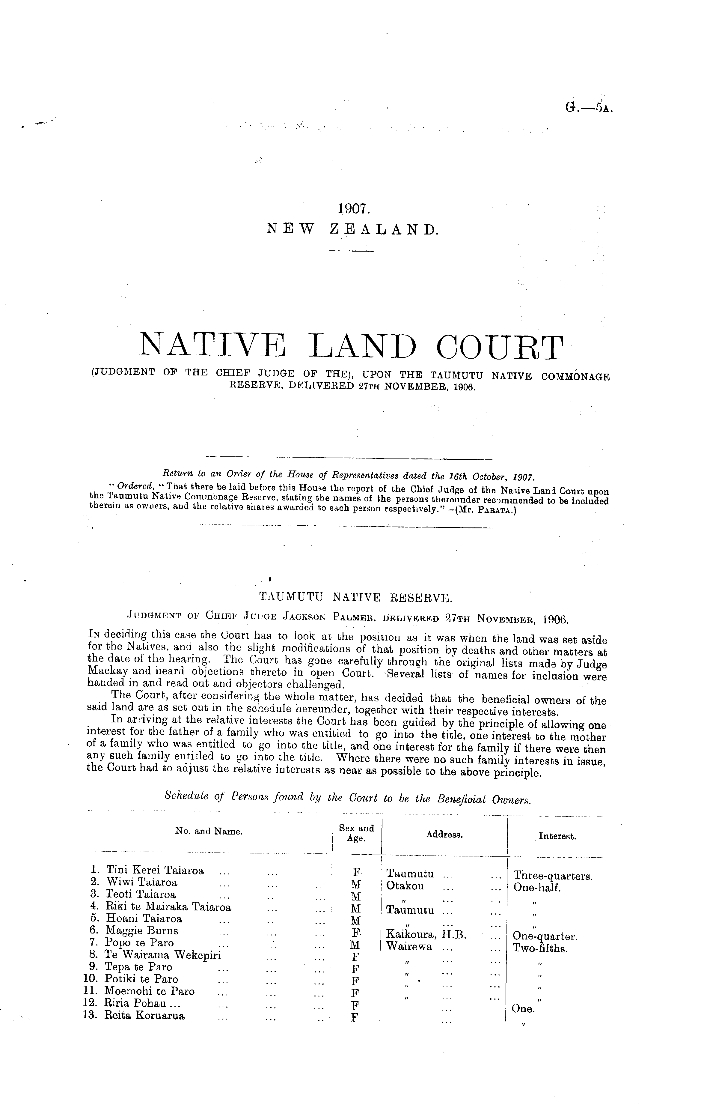 Return to an Order of the House of Representatives dated the 16th October, 1907. " Ordered " That there be laid before this House the report of the Chief Judge of the Native Laud Court upon the Taumutu Native Commonage Reserve, stating the names of the persons thereunder recommended to be included therein as owuers, and the relative shares awarded to etch person respectively." —(Mr. Pabata.) TAUMUTU NATIVE BESEEVE. Judgment of Chief Judge Jackson Palmek, delivered 27th November, 1906. In deciding this case the Court has to look at the position as it was when the land was set aside for the Natives, and also the slight modifications of that position by deaths and other matters at the date of the hearing. The Court has gone carefully through the original lists made by Jucke Mackay and heard objections thereto in open Court. Several lists of names for inclusion were handed m and read out ana objectors challenged. The Court, after considering the whole matter, has decided that the beneficial owners of the said land are as set out in the schedule hereunder, together with their respective interests In arriving at the relative interests the Court has been guided by the principle of allowing one interest for the father of a family who was entitled to go into the title, one interest to the mother ot a family who was entitled to go into the title, and one interest for the family if there were then any such family entitled to go into the title. Where there were no such family interests in issue the Court had to adjust the relative interests as near as possible to the above principle