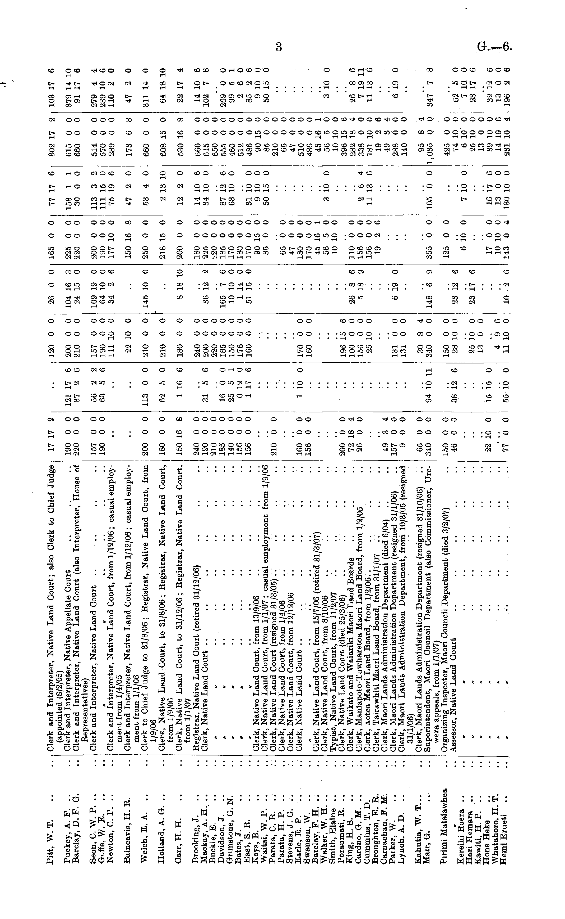 Pitt, W. T. Clerk and Interpreter, Native Land Court; also Clerk to Chief Judge (appointed (8/2/05) Clerk and Interpreter, Native Appellate Court Clerk and Interpreter, Native Land Court (also Interpreter, House of Representatives) Clerk and Interpreter, Native Land Court 17 17 2 120 0 0 26 0 0 165 0 0 77 IT 6 302 17 2 1 103 17 6 Puokey, A. F. Barclay, D. P. G. 190 0 0 220 0 0 121 17 6 37 2 6 200 0 0 210 0 0 104 16 3 24 15 0 225 0 0 220 0 0 153 1 1 30 0 0 615 0 0 660 0 0 379 14 10 91 17 6 Seon, C. W. P. .. Gxffe, W. E. Newton, C. P. .. Clerk and Interpreter, Native Land Court, from 1/32/06; casual employment from 1/4/05 Clerk and Interpreter, Native Land Court, from 1/12/06 ; casual employment from 1/1/06 Clerk to Chief Judge to 31/8/06; Registrar, Native Land Court, from 1/9/06 Clerk, Native Land Court, to 31/8/06 ; Registrar, Native Land Court, from 1/9/06 Clerk, Native Land Court, to 31/12/06; Registrar, Native Land Court, from 1/1/07 Registrar, Native Land Court (retired 31/12/06) Clerk, Native Land Court 157 0 0 190 0 0 56 2 2 63 5 6 157 0 0 190 0 0 111 10 0 109 19 0 64 10 0 34 2 6 200 0 0 190 0 0 177 10 0 113 3 2 111 15 0 75 19 6 514 0 0 570 0 0 289 0 0 279 4 4 239 10 6 110 2 0 Balneavis, H. R. 22 10 0 150 16 8 47 2 0 173 6 8 47 2 0 Welch, E. A. .. 200 0 0 113 0 0 210 0 0 145 10 0 250 0 0 53 4 0 660 0 0 311 14 0 Holland, A. G. .. 180 0 0 62 5 0 210 0 0 218 15 0 2 13 10 608 15 0 64 18 10 Carr, H. H. 150 16 8 1 16 6 180 0 0 8 18 10 200 0 0 12 2 0 530 16 8 22 17 4 Brooking, J. TMackay, A. H. .. Buckle, B. Davidson, J. Grimstone, G. N. Bates, J. East, 8. R. Keys, B. Waitai, W. P. Parata, C. R. Parata, H. P. Stevens, J. G. .. Earle, E. P. Swanson, W. Barclay, F. H. Walker, W. H. .. Smith, Elaine .. Poraumati, R. .. King, H. S. Cardno, G. M. Cummins, T. D. Broughton, E. R. Carnachan, F. M. Parker, W. Lynch, A. D. Clerk, Native Land Court, from 13/9/06 Clerk, Native Land Court, from 1/1/07 ; casual employment from 1/9/06 Clerk, Native Latid Court (resigned 31/3/05) Clerk, Native Land Court, from 1/4/06 Clerk, Native Land Court, from 12/12/06 Clerk, Native Land Court 240 0 0 190 0 0 210 0 0 195 0 0 140 0 0 156 0 0 156 0 0 210 0 0 160 0 0 156 0 0 31 5 6 16 0 0 25 5 1 0 12 0 1 17 6 1 10 0 240 0 0 200 0 0 220 0 0 185 0 0 150 0 0 176 0 0 160 0 0 170 0 0 160 0 0 36 12 2 165 7 6 10 10 0 1 14 0 51 15 0 180 0 0 225 0 0 i<20 0 0 185 0 0 170 0 0 180 0 0 170 0 0 90 15 0 85 0 0 65 0 0 47 0 0 180 0 0 170 0 0 45 16 1 56 5 0 10 10 0 14 10 6 34 10 0 87 12 6 63 10 0 31 10 0 9 10 0 50 15 0 660 0 0 615 0 0 650 0 0 555 0 0 460 0 0 512 0 0 486 0 0 90 15 0 85 0 0 210 0 0 65 0 0 47 0 0 510 0 0 486 0 0 45 16 1 56 5 0 10 10 0 396 15 6 282 18 4 338 0 0 181 10 0 19 2 6 49 3 4 288 0 0 140 0 0 14 10 6 102 7 8 269 0 0 99 5 1 2 6 0 85 2 6 9 10 0 50 15 0 Clerk, Native Land Court, from 15/7/06 (retired 31/3/07) Clerk, Native Land Court, from 8/10/06 Typist, Native Land Court, from 11/2/07 Clerk, Native Land Court (died 25/3/06) Clerk, Waikato and Waiariki Maori Land Boards Clerk, Maniapoto-Tuwharetoa Maori Land Board, from 1/2/05 Clerk, Aotea Maori Land Board, from 1/2/06.. .. Clerk, Tairawhiti Maori Land Board, from 31/1/07 Clerk, Maori Lands Administration Department (died 6/04) Clerk, Maori Lands Administration Department (resigned 31/1/06) Clerk, Maori Lands Administration Department, from 10/3/05 (resigned 31/1/06) Clerk, Maori Lands Administration Department (resigned 31/10/06) Superintendent, Maori Council Department (also Commissioner, Urewera appeals, from 1/1/07) Organizing Inspector, Maori Council Department (died 3/2/07) Assessor, Native Land Court 200 0 0 72 18 4 26 0 0 49 3 4 157 0 0 9 0 0 196 15 6 100 0 0 156 0 0 25 10 0 26 8 6 5 13 9 110 0 0 156 0 0 156 0 0 19 2 6 3 10 0 2 'e 4 11 13 6 3°io o 26 8 6 7 19 11 11 13 6 131 "6 0 131 0 0 6 19 0 6 19 0 Kahutia, W. T... Mair, G. 65 0 0 340 0 0 94 10 11 30 8 4 340 0 0 148 6 9 355 0 0 105 0 0 95 8 4 1,035 0 0 347 7 8 Pirimi Mataiawhea 150 0 0 46 0 0 38 12 6 150 0 0 28 10 0 23 12 6 125 0 0 425 0 0 74 10 0 6 10 0 25 10 0 13 0 0 39 10 0 14 19 6 231 10 4 62 5 0 7 10 0 23 17 6 Kereihi Roera .. Hari Hemara .. Kawiti, H. P. Hone Heke Whatahoro, H. T. Hemi Erueti 22 10 0 15 15 0 25 10 0 13 0 0 23 17 6 6 10 0 17 0 0 10 10 0 143 0 4 7 10 0 77 0 0 4 9 6 11 10 0 16 17 6 13 0 0 130 10 0 32 12 6 13 0 0 ]96 2 6 55 10 0 10 2 6