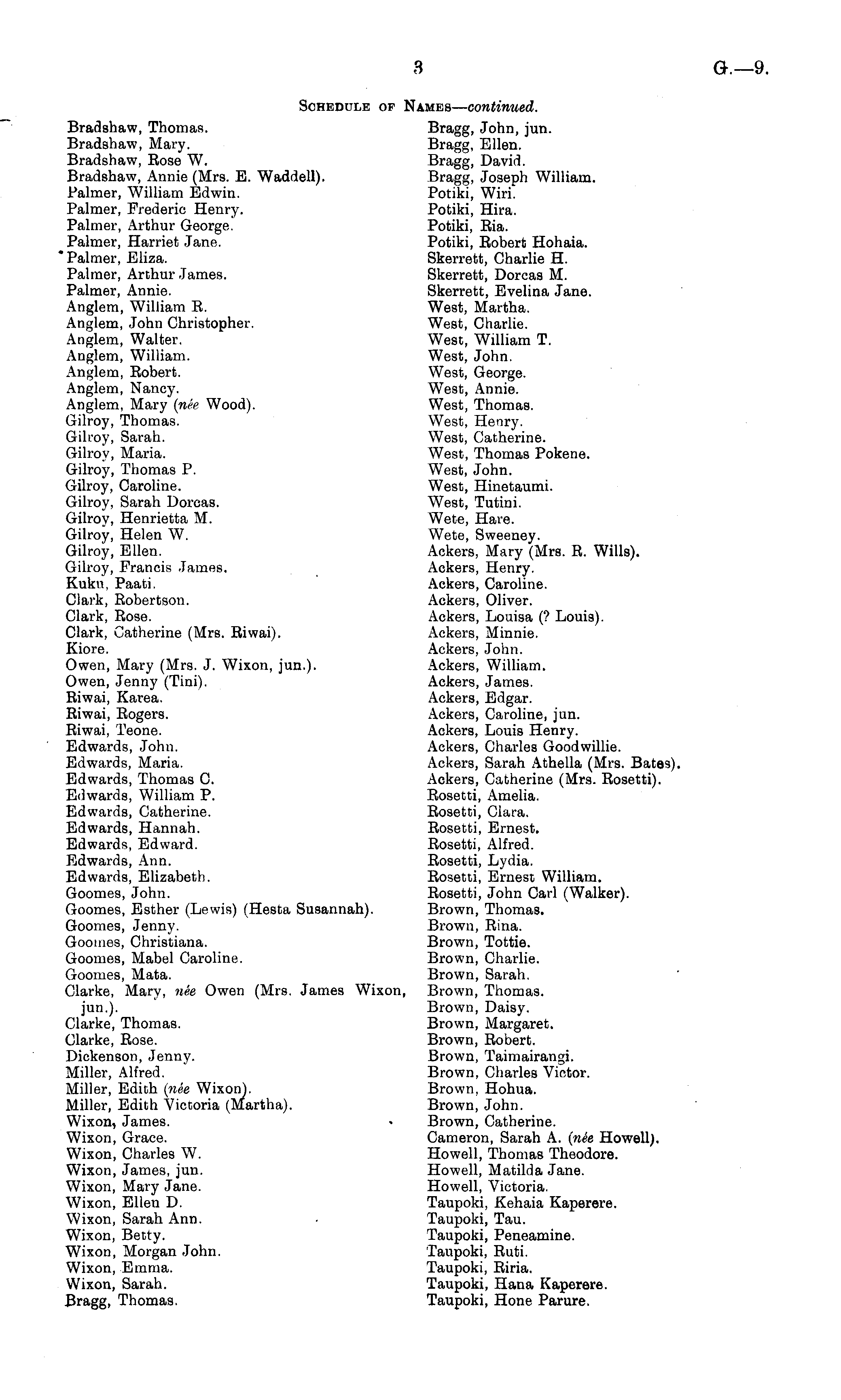Schedule of Names— continued. Bradshaw, Thomas. Bragg, John, jun. Bradshaw, Mary. Bragg, Ellen. Bradshaw, Rose W. Bragg, David. Bradshaw, Annie (Mrs. E. Waddell). Bragg, Joseph William. Palmer, William Edwin. Potiki, Wiri. Palmer, Frederic Henry. Potiki, Hira. Palmer, Arthur George. Potiki, Ria. Palmer, Harriet Jane. Potiki, Robert Hohaia. ' Palmer, Eliza. Skerrett, Charlie H. Palmer, Arthur James. Skerrett, Dorcas M. Palmer, Annie. Skerrett, Evelina Jane. Anglem, William R. West, Martha. Anglem, John Christopher. West, Charlie. Anglem, Walter. West, William T. Anglem, William. West, John. Anglem, Robert. West, George. Anglem, Nancy. West, Annie. Anglem, Mary (nee Wood). West, Thomas. Gilroy, Thomas. West, Henry. Gilroy, Sarah. West, Catherine. Gilroy, Maria. West, Thomas Pokene. Gilroy, Thomas P. West, John. Gilroy, Caroline. West, Hinetaumi. Gilroy, Sarah Dorcas. West, Tutini. Gilroy, Henrietta M. Wete, Hare. Gilroy, Helen W. Wete, Sweeney. Gilroy, Ellen. Ackers, Mary (Mrs. R. Wills). Gilroy, Francis James. Ackers, Henry. Kuku, Paati. Ackers, Caroline. Clark, Robertson. Ackers, Oliver. Clark, Rose. Ackers, Louisa (? Louis). Clark, Catherine (Mrs. Riwai). Ackers, Minnie. Kiore. Ackers, John. Owen, Mary (Mrs. J. Wixon, jun.). Ackers, William. Owen, Jenny (Tini). Ackers, James. Riwai, Karea. Ackers, Edgar. Riwai, Rogers. Ackers, Caroline, jun. Riwai, Teone. Ackers, Louis Henry. Edwards, John. Ackers, Charles Goodwillie. Edwards, Maria. Ackers, Sarah Athella (Mrs. Bates) Edwards, Thomas C. Ackers, Catherine (Mrs. Rosetti). Edwards, William P. Rosetti, Amelia. Edwards, Catherine. Rosetti, Clara. Edwards, Hannah. Rosetti, Ernest. Edwards, Edward. Rosetti, Alfred. Edwards, Ann. Rosetti, Lydia. Edwards, Elizabeth. Rosetti, Ernest William. Goomes, John. Rosetti, John Carl (Walker). Goomes, Esther (Lewis) (Hesta Susannah). Brown, Thomas. Goomes, Jenny. Brown, Rina. Goomes, Christiana. Brown, Tottie. Goomes, Mabel Caroline. Brown, Charlie. Goomes, Mata. Brown, Sarah. Clarke, Mary, nee Owen (Mrs. James Wixon, Brown, Thomas. jun.). Brown, Daisy. Clarke, Thomas. Brown, Margaret. Clarke, Rose. Brown, Robert. Dickenson, Jenny. Brown, Taimairangi. Miller, Alfred. Brown, Charles Victor. Miller, Edith (nee Wixon). Brown, Hohua. Miller, Edith Victoria (Martha). Brown, John. Wixon, James. • Brown, Catherine. Wixon, Grace. Cameron, Sarah A. (nee Howell). Wixon, Charles W. Howell, Thomas Theodore. Wixon, James, jun. Howell, Matilda Jane. Wixon, Mary Jane. Howell, Victoria. Wixon, Ellen D. Taupoki, Kehaia Kaperere. Wixon, Sarah Ann. • Taupoki, Tau. Wixon, Betty. Taupoki, Peneamine. Wixon, Morgan John. Taupoki, Ruti. Wixon, Emma. Taupoki, Riria. Wixon, Sarah. Taupoki, Hana Kaperere. Bragg, Thomas. Taupoki, Hone Parure.
