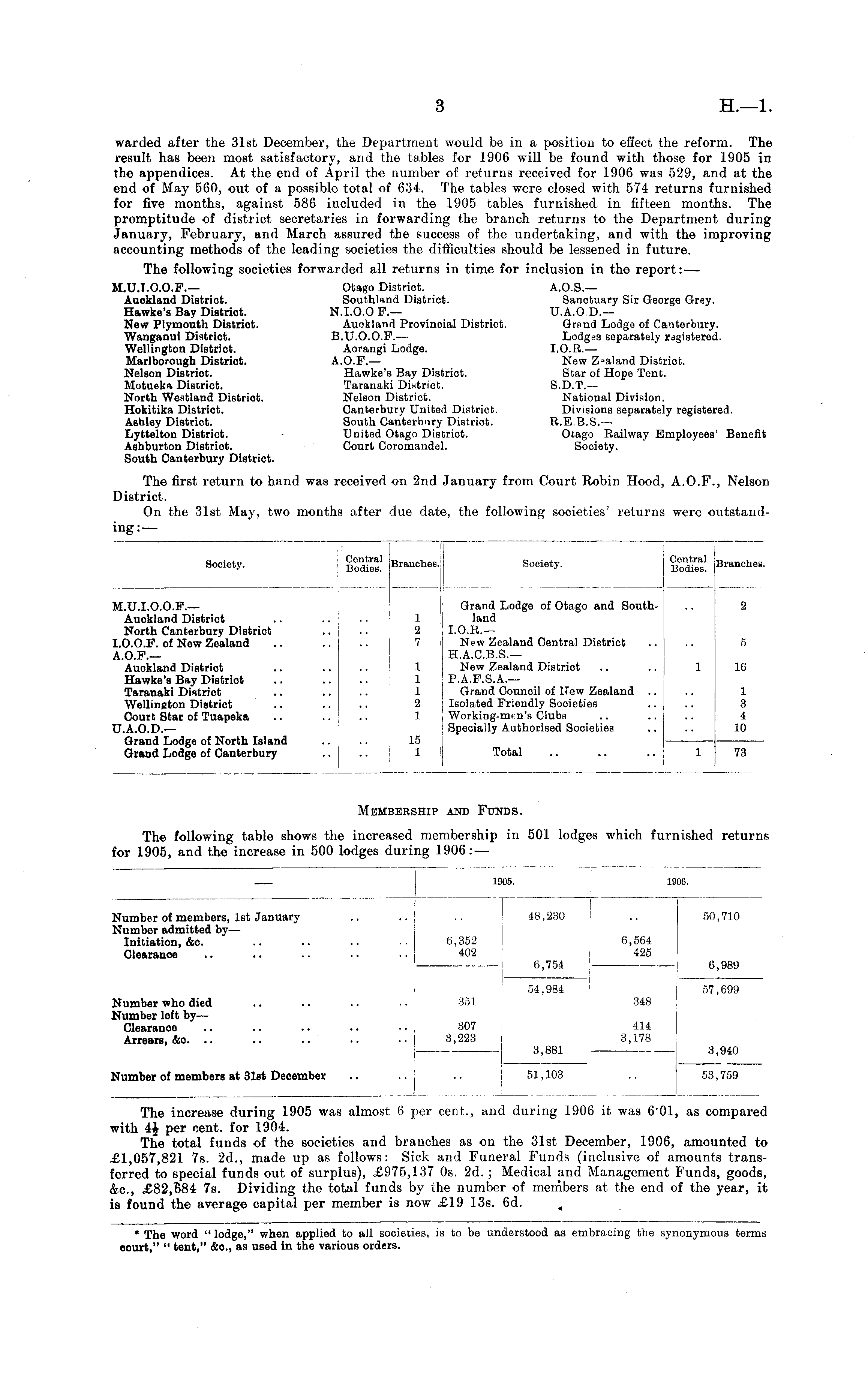warded after the 31st December, the Department would be in a position to effect the reform. The result has been most satisfactory, and the tables for 1906 will be found with those for 1905 in the appendices. At the end of April the number of returns received for 1906 was 529, and at the end of May 560, out of a possible total of 634. The tables were closed with 574 returns furnished for five months, against 586 included in the 1905 tables furnished in fifteen months. The promptitude of district secretaries in forwarding the branch returns to the Department during January, February, and March assured the success of the undertaking, and with the improving accounting methods of the leading societies the difficulties should be lessened in future. The following societies forwarded all returns in time for inclusion in the report:— M.U.1.0.0.F.— Otago District. A.O.S.— Auckland District. Southland District. Sanctuary Sir George Grey. Hawke's Bay Distriot. N.1.0.0F.— U.A.O D.— New Plymouth District. Auckland Provincial Distriot. Grand Lodge of Canterbury. Wanganui DUtriot. 8.U.0.0.F. — Lodges separately registered. Wellington District. Aorangi Lodge. 1.0.R.— Maryborough Distriot. A.O.F.— New Z»aland Distriot. Nelson Distriot. Hawke's Bay District. Star of Hope Tent. Motueka District. Taranaki District. S.D.T.— North Westland Distriot. Nelson District. National Division. Hokitika District. Canterbury United District. Divisions separately registered. Ashley District. South Canterbury District. R.E.B.S.— Lyttelton District. - United Otago Distriot. Otago Railway Employees' Benefit Aehburton District. Court Coromandel. Sooiety. South Canterbury District. The first return to hand was received on 2nd January from Court Robin Hood, A.0.F., Nelson District. On the 31st May, two months after due date, the following societies' returns were outstanding:—