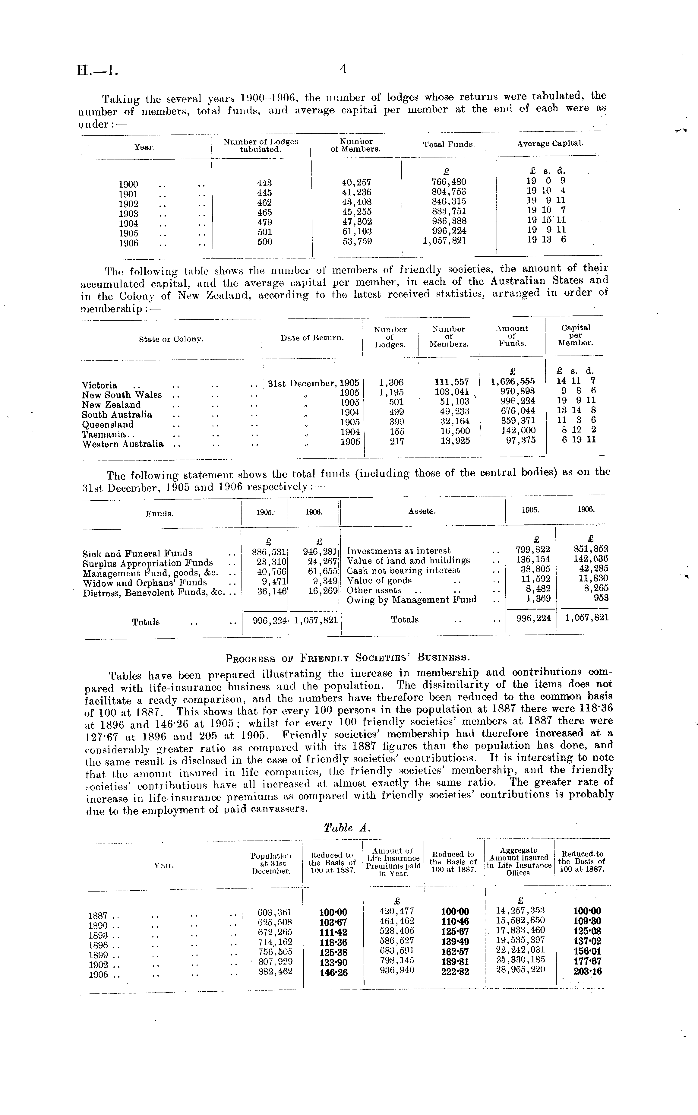 Progress of Friendly Societies' Business. Tables have been prepared illustrating the increase in membership and contributions compared with life-insurance business and the population. The dissimilarity of the items does not facilitate a ready comparison, and the numbers have therefore been reduced to the common basis of 100 at 1887. This shows that for every 100 persons in the population at 1887 there were 118-36 at 1896 and 146-26 at 1905; whilst for every 100 friendly societies' members at 1887 there were 127-67 at 1896 and 205 at 1905. Friendly' societies' membership had therefore increased at a considerably greater ratio as compared with its 1887 figures than the population has done, and the same result is disclosed in the case of friendly societies' contributions. It is interesting to note that the amount insured in life companies, the friendly societies' membership, and the friendly societies' contributions have all increased at almost exactly the same ratio. The greater rate of increase in life-insurance premiums as compared with friendly societies' contributions is probably due to the employment of paid canvassers.