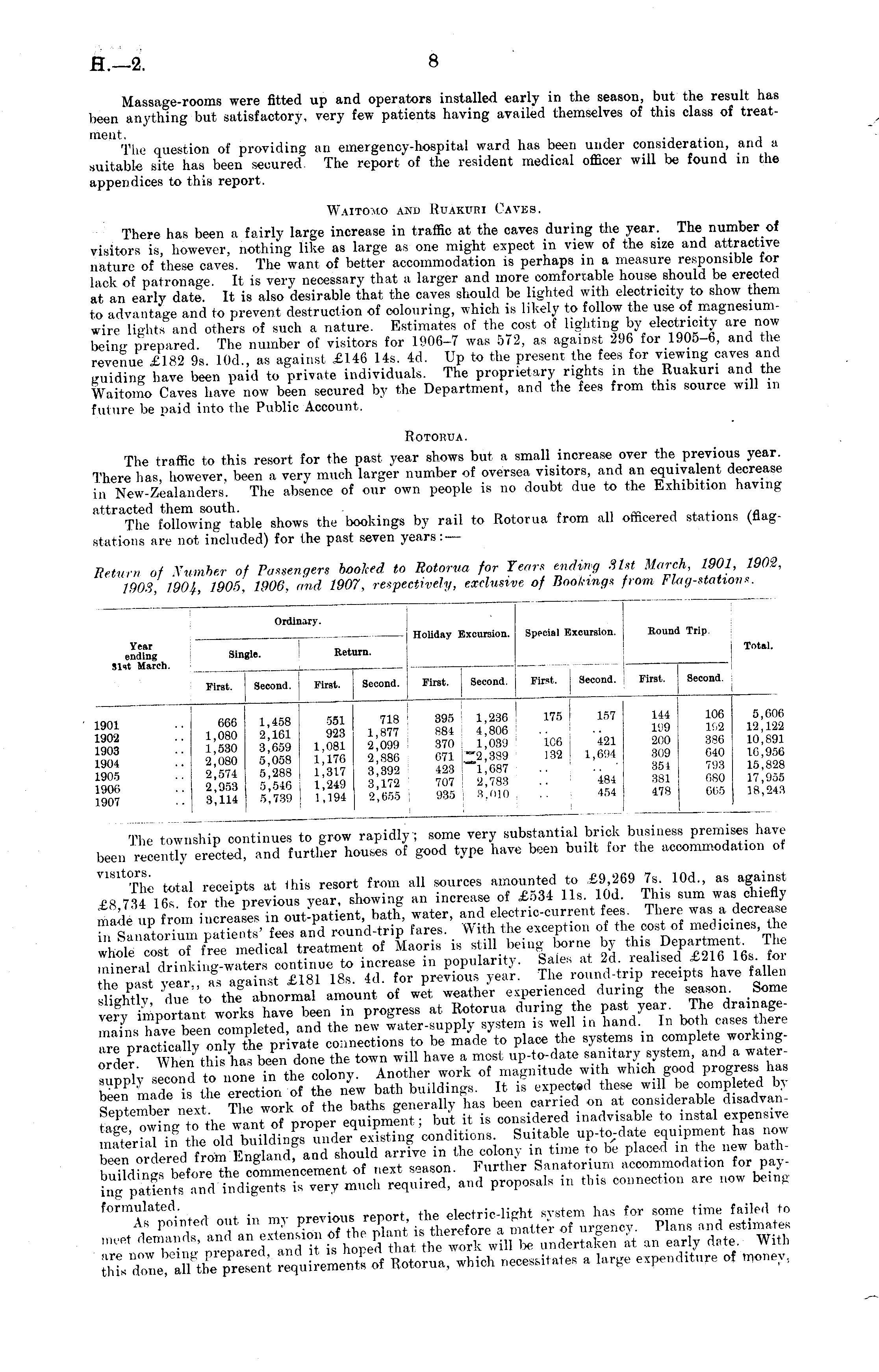 Massage-rooms were fitted up and operators installed early in the season, but the result has been anything but satisfactory, very few patients having availed themselves of this class of treatment. . .. . , The question of providing an emergency-hospital ward has been under consideration, and a suitable site has been secured The report of the resident medical officer will be found in the appendices to this report. Waitomo and UuAKurti Caves. There has been a fairly large increase in traffic at the caves during the year. The number of visitors is, however, nothing like as large as one might expect in view of the size and attractive nature of these caves. The want of better accommodation is perhaps in a measure responsible tor lack of patronage It is very necessary that a larger and more comfortable house should be erected at an early date. It is also desirable that the caves should be lighted with electricity to show them to advantage and to prevent destruction of colouring, which is likely to follow the use of magnesiumwire lights and others of such a nature. Estimates of the cost of lighting by electricity now being prepared. The number of visitors for 1906-7 was 5(2, as against 296 for 1905-6, and the revenue £182 9s. 10d., as against £146 14s. 4d. Up to the present the fees for viewing caves and guiding have been paid to private individuals. The proprietary rights in the Ruakuri and the Waitomo Caves have now been secured by the Department, and the fees from this source will m future be paid into the Public Account. Rotohua. The traffic to this resort for the past year shows but a small increase over the previous year. There has, however, been a very much larger number of oversea visitors, and an equivalent decrease in New-Zealanders. The absence of our own people is no doubt due to the Exhibition having attracted them south. „ , . ,„ The following table shows the bookings by rail to Rotorua from all officered stations (flagstations are not included) for the past seven years: — Return of Number of Passengers boohed to Rotorua for Year* ending 81st March, 1901, 1902, WO3, 190/,, 1905. 1906, and 1907, respectively, exclusive of Bookings from t lag-stations.