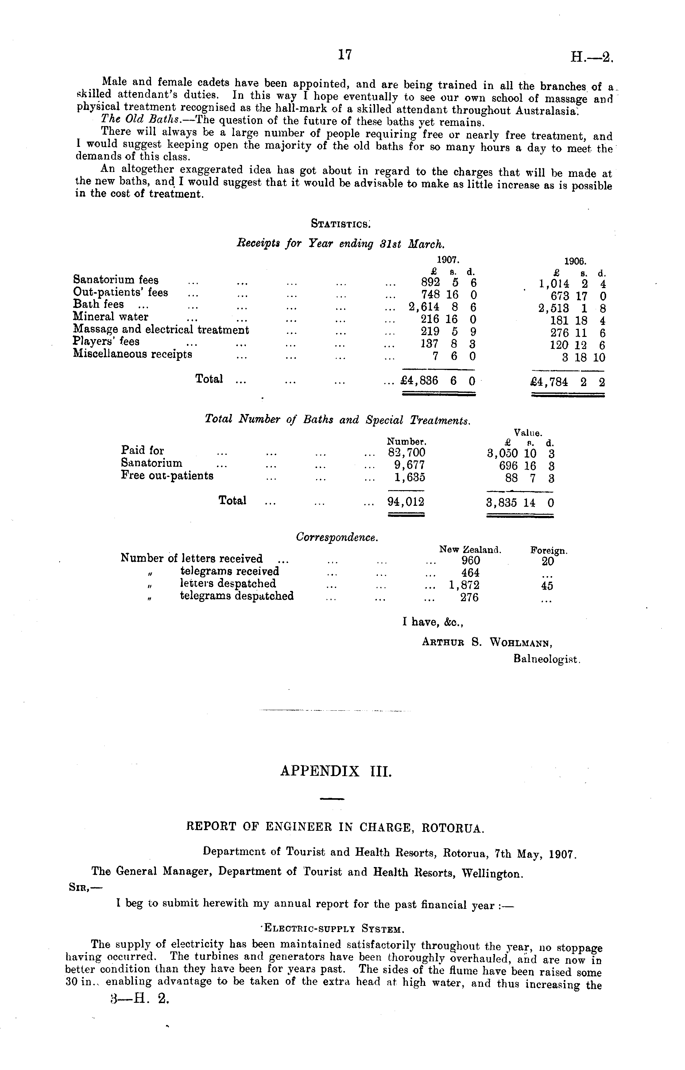 Male and female cadets have been appointed, and are being trained in all the branches of a skilled attendant's duties. In this way I hope eventually to see our own school of massage and physical treatment recognised as the hall-mark of a skilled attendant throughout Australasia. The Old Baths. —The question of the future of these baths yet remains. There will always be a large number of people requiring "free or nearly free treatment, and I would suggest keeping open the majority of the old baths for so many hours a day to meet the demands of this class. An altogether exaggerated idea has got about in regard to the charges that will be made at the new baths, and I would suggest that it would be advisable to make as little increase as is possible in the cost of treatment. Statistics. Receipts for Year ending 31st March. 1907. 1906. Sanatorium fees ... ... ... ... ... 892 5 6 1,014 2 4 Out-patients'fees ... ... ... ... ... 748 16 0 '673 17 0 Bath fees 2,614 8 6 2,513 1 8 Mineral water ... ... ... ... ... 216 16 0 18118 4 Massage and electrical treatment ... ... ... 219 5 9 276 11 6 Players'fees ... ... ... ... ... 137 8 3 120 12 6 Miscellaneous receipts ... ... ... ... 7 6 0 3 18 10 Total ... ... ... ... £4,836 6 0 £4,784 2 2 Total Number of Baths and Special Treatments. Value. _~ , Number. £ p. d. Paid for ... ... ... ... 82,700 3,050 10 3 Sanatorium ... ... ... ... 9,677 696 16 3 Free out-patients ... ... ... 1,635 88 7 3 Total ... ... ... 94,012 3,835 14 0 Correspondence. New Zealand. Foreign. Number of letters received ... ... ... ... 960 20 „ telegrams received ... ... ... 464 „ letters despatched ... ... ... 1,872 45 „ telegrams despatched ... ... ... 276 I have, &c, Arthur S. Wohlmann, Balneologist. APPENDIX 111. REPORT OF ENGINEER IN CHARGE, ROTORUA. Department of Tourist and Health Resorts, Rotorua, 7th May, 1907. The General Manager, Department of Tourist and Health Resorts, Wellington. Sir, — I beg to submit herewith my annual report for the past financial year : •Electric-supply System. The supply of electricity has been maintained satisfactorily throughout the year, no stoppage having occurred. The turbines and generators have been thoroughly overhauled, and are now in better condition than they have been for years past. The sides of the flume have been raised some 30 in. enabling advantage to be taken of the extra head at high water, and thus increasing the 3—H. 2.