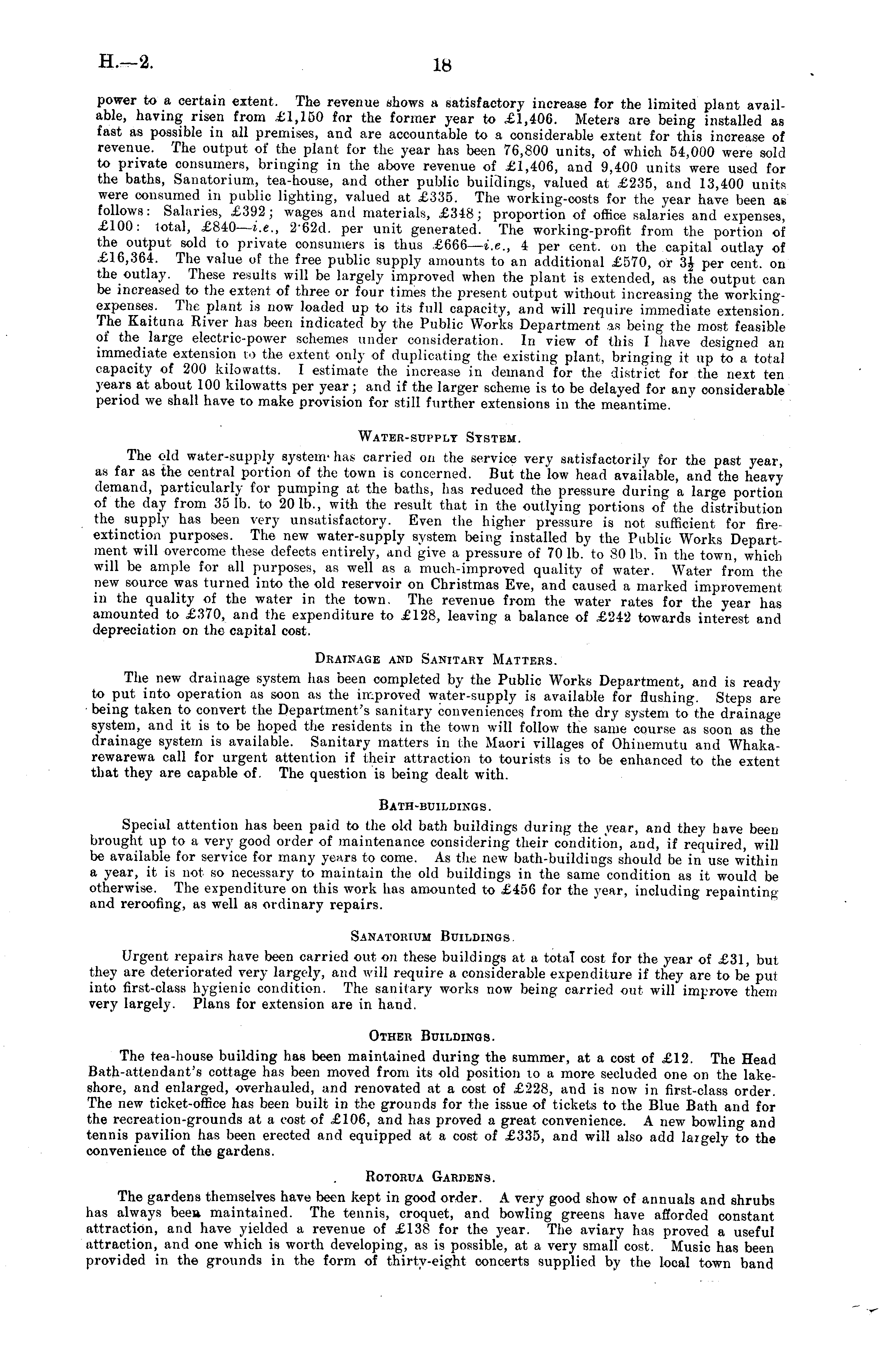 power to a certain extent. The revenue shows a satisfactory increase for the limited plant available, having risen from £1,150 for the former year to £1,406. Meters are being installed as fast as possible in all premises, and are accountable to a considerable extent for this increase of revenue. The output of the plant for the year has been 76,800 units, of which 54,000 were sold to private consumers, bringing in the above revenue of £1,406, and 9,400 units were used for the baths, Sanatorium, tea-house, and other public buildings, valued at £235, and 13,400 units were consumed in public lighting, valued at £335. The working-costs for the year have been as follows: Salaries, £392; wages and materials, £348; proportion of office salaries and expenses, £100: total, £840— i.e., 2'62d. per unit generated. The working-profit from the portion of the output sold to private consumers is thus £666— i.e., 4 per cent, on the capital outlay of £16,364. The value of the free public supply amounts to an additional £570, or 3J per cent, on the outlay. These results will be largely improved when the plant is extended, as the output can be increased to the extent of three or four times the present output without increasing the workingexpenses. The plant is now loaded up to its full capacity, and will require immediate extension. The Kaituna River has been indicated by the Public Works Department as being the most feasible of the large electric-power schemes under consideration. In view of this I have designed an immediate extension to the extent only of duplicating the existing plant, bringing it up to a total capacity of 200 kilowatts. I estimate the increase in demand for the district for the next ten years at about 100 kilowatts per year; and if the larger scheme is to be delayed for any considerable period we shall have to make provision for still further extensions in the meantime. Water-supply System. The old water-supply system-has carried on the service very satisfactorily for the past year, as far as the central portion of the town is concerned. But the low head available, and the heavy demand, particularly for pumping at the baths, has reduced the pressure during a large portion of the day from 35 Ib. to 201b., with the result that in the outlying portions of the distribution the supply has been very unsatisfactory. Even the higher pressure is not sufficient for fireextinction purposes. The new water-supply system being installed by the Public Works Department will overcome these defects entirely, and give a pressure of 70 lb. to 80 lb. In the town, which will be ample for all purposes, as well as a much-improved quality of water. Water from the new source was turned into the old reservoir on Christmas Eve, and caused a marked improvement in the quality of the water in the town. The revenue from the water rates for the year has amounted to £370, and the expenditure to £128, leaving a balance of £242 towards interest and depreciation on the capital cost. Drainage and Sanitary Matters. The new drainage system has been completed by the Public Works Department, and is ready to put into operation as soon as the improved water-supply is available for flushing. Steps are being taken to convert the Department's sanitary conveniences from the dry system to the drainage system, and it is to be hoped the residents in the town will follow the same course as soon as the drainage system is available. Sanitary matters in the Maori villages of Ohinemutu and Whakarewarewa call for urgent attention if their attraction to tourists is to be enhanced to the extent that they are capable of. The question is being dealt with. Bath-buildings. Special attention has been paid to the old bath buildings during the year, and they have been brought up to a very good order of maintenance considering their condition, and, if required, will be available for service for many years to come. As the new bath-buildings should be in use within a year, it is not so necessary to maintain the old buildings in the same condition as it would be otherwise. The expenditure on this work has amounted to £456 for the year, including repainting and reroofing, as well as ordinary repairs. Sanatorium Buildings. Urgent repairs have been carried out on these buildings at a total cost for the year of £31, but they are deteriorated very largely, and will require a considerable expenditure if they are to be put into first-class hygienic condition. The sanitary works now being carried out will improve them very largely. Plans for extension are in hand. Other Buildings. The tea-house building has been maintained during the summer, at a cost of £12. The Head Bath-attendant's cottage has been moved from its old position to a more secluded one on the lakeshore, and enlarged, overhauled, and renovated at a cost of £228, and is now in first-class order. The new ticket-office has been built in the grounds for the issue of tickets to the Blue Bath and for the recreation-grounds at a cost of £106, and has proved a great convenience. A new bowling and tennis pavilion has been erected and equipped at a cost of £335, and will also add largely to the convenience of the gardens. Rotorua Gardens. The gardens themselves have been kept in good order. A very good show of annuals and shrubs has always been maintained. The tennis, croquet, and bowling greens have afforded constant attraction, and have yielded a revenue of £138 for the year. The aviary has proved a useful attraction, and one which is worth developing, as is possible, at a very small cost. Music has been provided in the grounds in the form of thirty-eight concerts supplied by the local town band