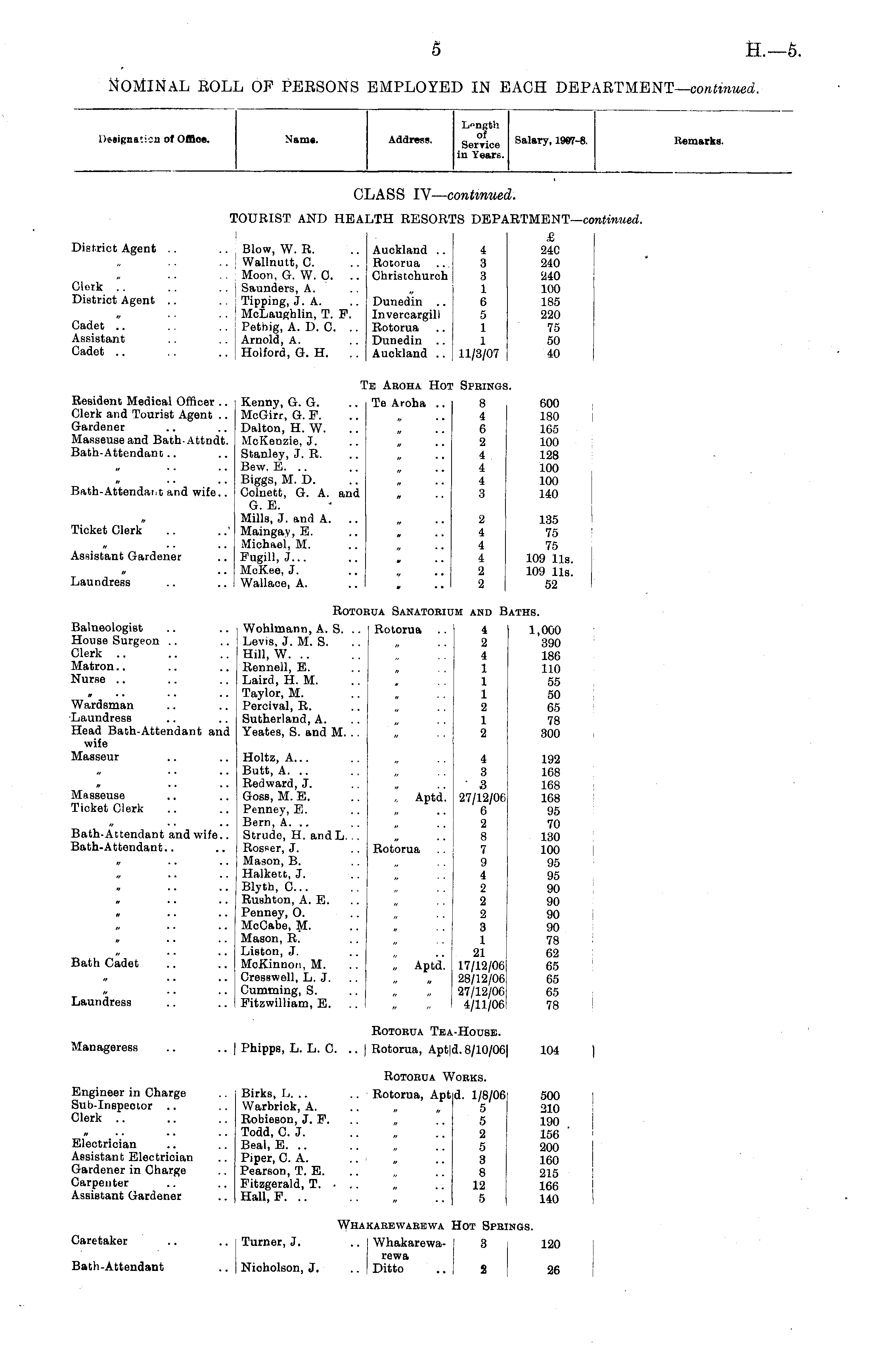 Daaignation of Office. Name. Address. Length of Service in Years. Salary, 1997-8. Remarks. CLASS IV— c •.ontinuei i. TOURIST AND HEALTH RESOR1 DS DEPA lRTMENT— continued. District Agent .. .. Blow, W. R. .. Auckland .. .. Wallnutt, C .. Rotorua Moon, G. W. 0. .. Christchurch Clerk .. .. .. i Saunders, A. District Agent .. . Tipping, J. A. .. Dunedin .. McLaughlin, T. F. lnvercargill Cadet .. .. .. j Pethig, A. D. C. .. Rotorua .. Assistant .. .. Arnold, A. .. Dunedin .. Cadet .. .. .. ! Holford, G. H. .. Auckland.. 4 3 3 1 6 5 1 1 11/3/07 £ I 24C 240 240 100 185 220 75 50 40 Te Aroha Hot ■ Springs i. Resident Medical Officer .. Kenny, G. G. .. Te Aroha .. Clerk and Tourist Agent .. McGirr, G. P. Gardener .. .. Dalton, H. W. Masseuse and Bath- Attndt. McKenzie, J. Bath-Attendant.. .. Stanley, J. R. .. Bew, E. .. .. Biggs, M. D. Bath-Attendar.t and wife.. Colnett, G. A. and G. E. Mills, J. and A. Ticket Clerk .. .. Maingay, E. .. Michael, M. Assistant Gardener .. Fugill, J... .. McKee, J. Laundress .. .. Wallaoe, A. 8 4 6 2 4 4 4 3 600 180 165 100 128 100 100 140 2 4 4 4 2 2 135 75 75 109 lis. 109 lis. 52 Rotorua Sanatoriu IM AND B lATHS. Balneologist .. .. Wohlmann, A. S. .. Rotorua .. House Surgeon .. .. Levis, J. M. S. Clerk .. .. .. Hill, W. .. Matron.. .. .. Rennell, E. Nurse .. .. .. Laird, H. M. .. Taylor, M. Wardsman .. .. Percival, R. Laundress .. .. Sutherland, A. Head Bath-Attendant and Yeates, S. and M. .. wife Masseur .. .. Holtz, A... .. Butt, A. .. » .. .. Redward, J. .. „ Masseuse .. .. Goss, M. E. .. ,. Aptd. Ticket Clerk .. .. Penney, E. .. Bern, A. .. Bath-Attendant and wife.. Strude, H. andL. .. Bath-Attendant.. .. Rosser, J. Rotorua .. Mason, B. .. Halkett, J. .. Blyth, 0... .. Rushton, A. E. 0 .. .. Penney, O. .. McCabe, M. „ .. .. Mason, R. .. Liston, J. Bath Cadet .. .. McKinnon, M. .. „ Aptd. .. Cresswell, L. J. .. Cumming, S. Laundress .. .. Pitzwilliam, E. .. 4 2 4 1 1 1 2 1 2 1,000 390 186 110 55 50 65 78 300 4 3 • 3 27/12/06 6 2 8 7 9 4 2 2 2 3 1 21 17/12/06 28/12/06 27/12/06 4/11/06! 192 168 168 168 95 70 130 100 95 95 90 90 90 90 78 62 65 65 65 78 Rotorua Tea .-House. I 104 | Manageress .. .. | Phipps, L. L. C. .. | Rotorua, Apt|, d. 8/10/06| Rotorua W fORKS. 500 210 190 156 200 160 215 166 140 Engineer in Charge .. Birks, 0. .. .. Rotorua, Apt Sub-Inspeotor .. .. Warbrick, A. .. „ „ Clerk .. .. .. Robieson, J. P. .. Todd, C. J. Electrician .. .. Beal, E. .. Assistant Electrician .. Piper, C. A. Gardener in Charge .. Pearson, T. E. Carpenter .. .. Fitzgerald, T. • .. , Assistant Gardener .. Hall, P. .. d. 1/8/06 5 5 2 5 3 8 12 5 Whakarewarewa ! Hot Spri [NGS. Caretaker .. .. Turner, J. .. Whakarewarewa Bath-Attendant .. Nicholson, J. .. Ditto 3 120 j 2 26