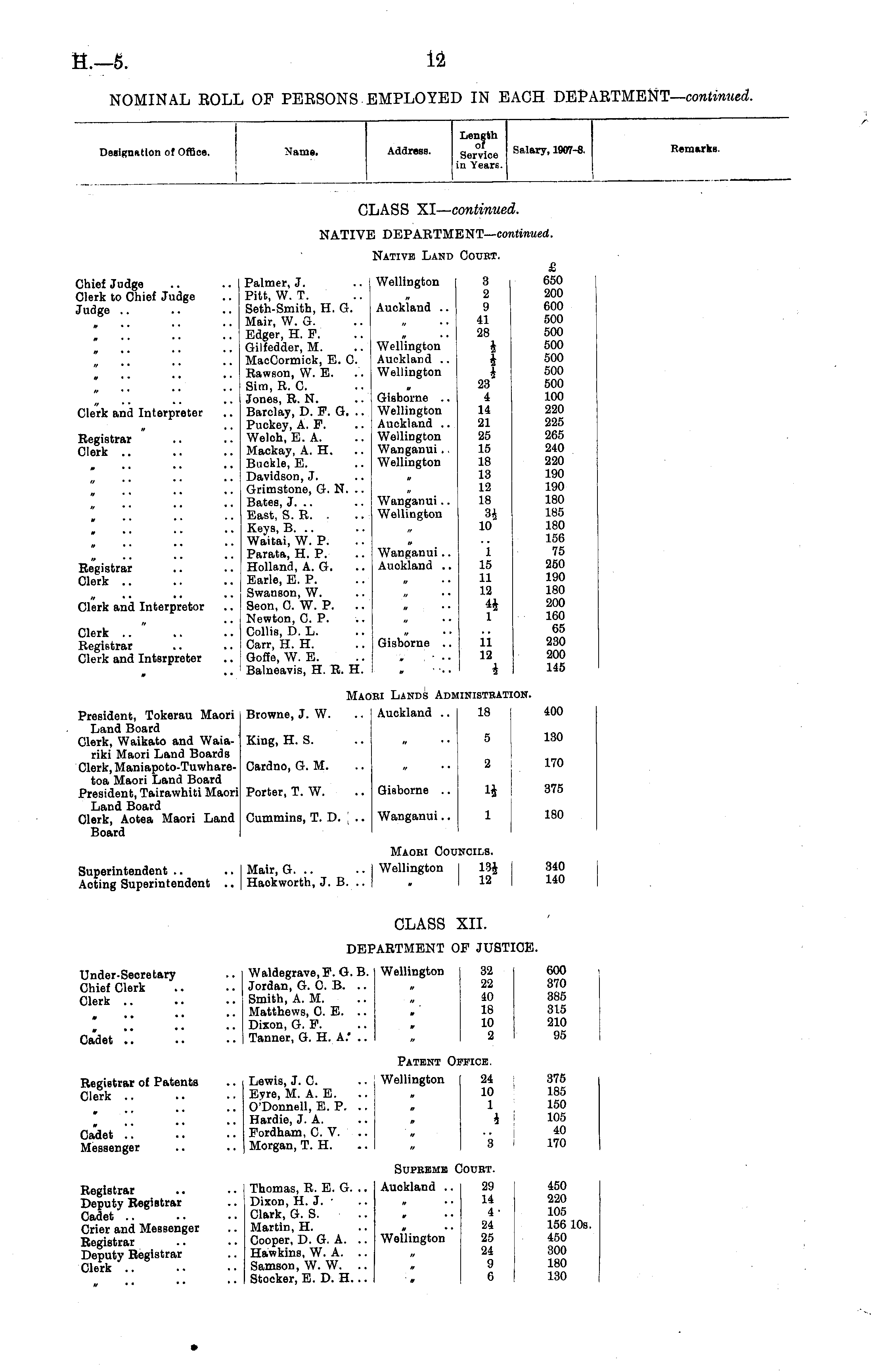 Designation of Office. Name. Address. Length Service in Years. Salary, 1907-8. Remarks. I Li. NATIVI ILASS XI — continued. E DEPARTMENT—continued. Native Land Court. Chief Judge Clerk to Chief Judge Judge Clerk and Interpreter Registrar Clerk Palmer, J. .. j Pitt, W. T. Seth-Smith, H. G. Mair, W. G. Edger, H. P. Gilfedder, M. MacCormick, E. C. Rawson, W. E. Sim, R. C Jones, R. N. Barclay, D. P. G. .. Puckey, A. F. Welch, E. A. Mackay, A. H. Buckle, E. Davidson, J. Grimstone, G. N. Bates, J. .. East, S. R. . Keys, B. .. Waitai, W. P. Parata, H. P. Holland, A. G. Earle, E. P. Swanson, W. Seon, 0. W. P. .. Newton, C P. Collis, D. L. Carr, H. H. Goffe, W. E. Balneavis, H. R. H. £ I Wellington | 3 650 2 200 Auckland .. 9 600 41 500 28 500 Wellington 1 500 Auckland .. 1 500 Wellington 1 500 23 500 Gisborne .. 4 100 Wellington 14 220 Auckland .. 21 225 Wellington 25 265 Wanganui . 15 240 Wellington 18 220 13 190 12 190 Wanganui.. 18 180 Wellington 31 185 10 180 156 Wanganui.. 1 75 Auokland .. 15 250 11 190 12 180 41 200 1 160 .... 65 Gisborne .. 11 230 12 200 1 145 Registrar Clerk Clerk and Interpretor Clerk .. Registrar Clerk and Intsrpreter Mao ori Lands Administration. President, Tokerau Maori Land Board Clerk, Waikato and Waiariki Maori Land Boards Clerk, Maniapoto-Tuwhare-toa Maori Land Board President, Tairawhiti Maori Land Board Clerk, Aotea Maori Land Board Browne, J. W. King, H. S. Cardno, G. M. Auckland .. 18 400 5 130 2 170 Porter, T. W. Gisborne .. 11 375 Cummins, T. D. [ .. Wanganui.. 1 180 Superintendent Acting Superintendent .. Mair, G. .. Haokworth, J. B. Maori Councils. i Wellington I 131 I 34 ° 12 140 DEI CLASS XII. Under-Secretary Chief Clerk Clerk .. Waldegrave.F. G. B. Jordan, G. C.B. Smith, A. M. Matthews, C. E. Dixon, G. P. Tanner, G. H. A." .. PARTMENT OF JUSTICE. . Wellington 32 600 22 370 40 385 18 315 10 210 2 95 Cadet Patent Office. Registrar of Patents Clerk .. Lewis, J. C. Eyre, M. A. E. .. O'Donnell, E. P. Hardie, J. A. Pordham, C. V. Morgan, T. H. . Wellington 24 375 10 185 1 150 1 105 40 3 I 170 Cadet Messenger Supreme Court. Registrar Deputy Registrar Cadet Crier and Messenger Registrar Deputy Registrar Clerk .. Thomas, R. E. G. .. Dixon, H. J. • Clark, G. S. Martin, H. Cooper, D. G. A. Hawkins, W. A. Samson, W. W. Stocker, E. D. H. .. , Auckland .. 29 450 14 220 4' 105 24 156 10s. . Wellington 25 450 24 300 9 180 6 130