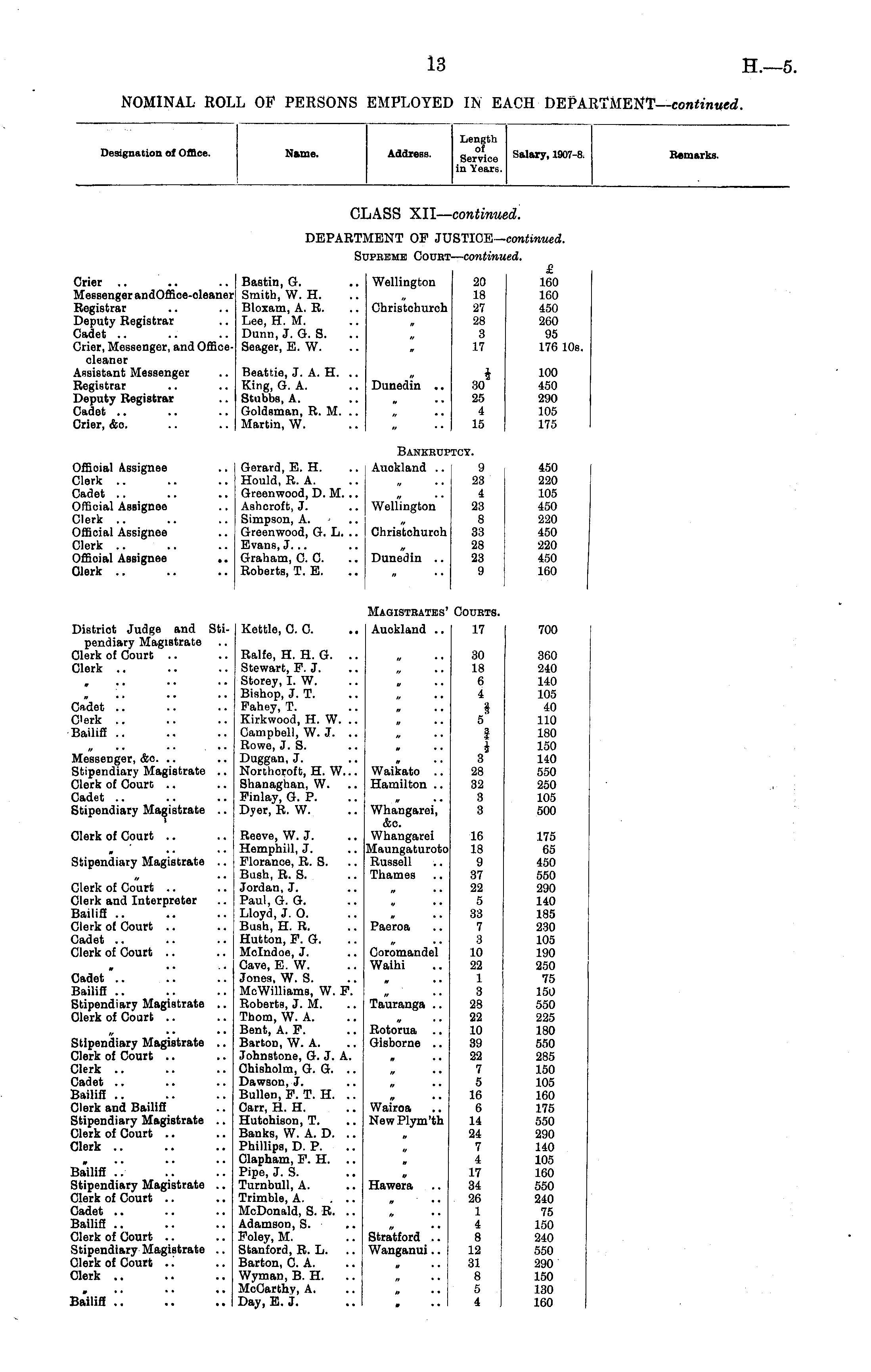 Designation of Office. Name. Address. Length of Service in Years. Salary, 1907-8. Remarks. C] LASS XII—, continued. depart: MENT OF JUi STIGE-continued. Si upreme Court- — continued. Crier Messenger andOffice-oleaner Registrar Deputy Registrar Cadet .. Crier, Messenger, and Officecleaner Assistant Messenger Registrar Deputy Registrar Cadet .. Crier, &c. Bastin, G. Smith, W. H. Bloxam, A. R. Lee, H. M. Dunn, J. G. S. Seager, E. W. Wellington Christchurch £ 20 160 18 160 27 450 28 260 3 95 17 176 10s. Beattie, J. A. H. King, G. A. Stubbs, A. Goldsman, R. M. Martin, W. Dunedin .. 1 100 30 450 25 290 4 105 15 175 Official Assignee Clerk .. Cadet Official Assignee Clerk .. Official Assignee Clerk .. Official Assignee .. Clerk Gerard, E. H. Hould, R. A. Greenwood, D. M. .. Ashoroft, J. Simpson, A. Greenwood, G. L, .. Evans, J. .. Graham, CO. Roberts, T. E. Bankrupt Auokland .. res. Wellington Christchurch 9 450 23 220 4 105 23 450 8 220 33 450 28 220 23 450 9 160 Dunedin .. Distriot Judge and Stipendiary Magistrate Clerk of Court Clerk .. Kettle, O.O. Magistrates' Courts. Auckland .. 17 700 Cadet C'erk .. Bailiff .. Ralfe, H. H. G. .. Stewart, P.J. Storey, I. W. Bishop, J. T. Fahey, T. Kirkwood, H. W. Campbell, W. J. .. Rowe, J. S. Duggan, J. Northcroft, H. W... 8hanaghan, W. Finlay, G. P. Dyer, R. W. 30 360 18 240 6 140 4 105 f 40 5' 110 } 180 1 150 3 140 28 550 32 250 3 105 3 500 Messenger, &c. Stipendiary Magistrate .. Clerk of Court Cadet .. Stipendiary Magistrate .. Waikato .. Hamilton .. Clerk of Court Reeve, W. J. Hemphill, J. Florance, R. S. Bush, R. S. Jordan, J. Paul,G. G. Lloyd, J. O. Bush, H. R. Hutton, P. G. Mclndoe, J. Cave, E. W. Jones, W. S. McWilliams, W. F. Roberts, J. M. Thorn, W. A. Bent, A. F. Barton, W. A. Johnstone, G. J. A. Chisholm, G. G. Dawson, J. Bullen, P. T. H. .. Carr, H. H. Hutohison, T. Banks, W. A. D. Phillips, D. P. Clapham, F. H. Pipe, J. S. Turnbull, A. Trimble, A. ... McDonald, S. R. Adamson, S.Foley, M. Stanford, R. L. Barton, C. A. Wyman, B. H. McCarthy, A. Day, E.J. Whangarei, &o. Whangarei Maungaturoto Russell Thames 16 175 18 65 9 450 37 550 22 290 5 140 33 185 7 230 3 105 10 190 22 250 1 75 3 150 28 550 22 225 10 180 39 550 22 285 7 150 5 105 16 160 6 175 14 550 24 290 7 140 4 105 17 160 34 550 26 240 1 75 4 150 8 240 12 550 31 290 8 150 5 130 4 160 Stipendiary Magistrate .. Clerk of Court Clerk and Interpreter Bailiff .. Clerk of Court Cadet Clerk of Court Paeroa Coromandel Waihi Cadet .. Bailiff .. Stipendiary Magistrate .. Clerk of Court Tauranga .. Stipendiary Magistrate .. Clerk of Court Clerk .. Cadet Bailiff .. Clerk and Bailiff Stipendiary Magistrate .. Clerk of Court Clerk .. Rotorua .. Gisborne .. Wairoa New Plym'th Bailiff .. Stipendiary Magistrate .. Clerk of Court Cadet Bailiff .. Clerk of Court Stipendiary Magistrate .. Clerk of Court .'. Clerk .. Hawera Stratford .. Wanganui.. Bailiff .. . • •