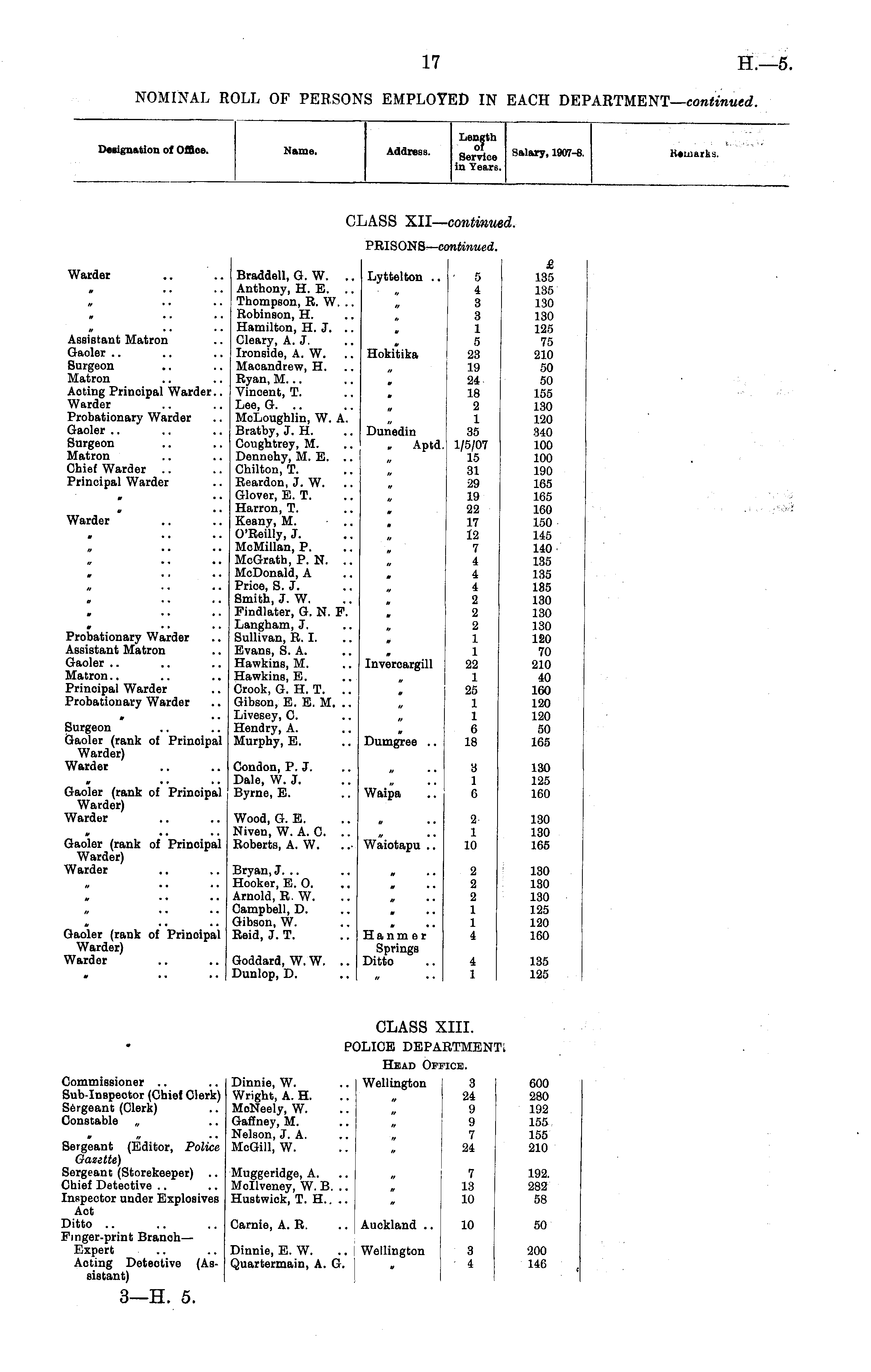Designation of Offioe. Name. Address. Length Service in Years. Salary, 1907-8. He ui arks. CLASS XII— continui id. PRISONS— continued. £ 135 135 130 130 125 75 210 50 50 155 130 120 340 100 100 190 165 165 160 150 145 140 135 135 135 130 130 130 120 70 210 40 160 120 120 50 165 Warder 0 .. • • Assistant Matron Gaoler Surgeon Matron Acting Principal Warder.. Warder Probationary Warder Gaoler Surgeon Matron Chief Warder Principal Warder Braddell, G. W. .. Lyttelton .. 5 Anthony, H. E. .. . , 4 Thompson, R. W. .. „ 3 Robinson, H. .. , 3 Hamilton, H. J. .. „ 1 Cleary, A.J... , 5 Ironside, A. W. .. Hokitika 23 Macandrew, H. .. „ 19 Ryan, M... .. „ 24 Vincent, T. ... 18 Lee, G. .. .. „ 2 McLoughlin, W. A. „ 1 Bratby, J. H. .. Dunedin 35 Coughtrey, M. „ Aptd. 1/5/07 Dennehy, M. E. .. „ 15 Chilton, T. .. 31 Reardon, J. W. .. „ 29 Glover, E. T. .. , 19 Harron, T. .. „ 22 Keany, M. ... 17 O'Reilly, J. .. 12 McMillan, P. 7 McGrath, P. N. .. „ 4 McDonald, A 4 Price, S. J. .. „ 4 Smith, J. W. .. , 2 Findlater, G. N. F. 2 Langham, J. 2 Sullivan, R. I. .. „ 1 Evans, S. A. 1 Hawkins, M. .. Inveroargill 22 Hawkins, E. .. „ 1 Crook, G. H. T. .. „ 25 Gibson, E. E. M. .. „ 1 Livesey, 0. „ 1 Hendry, A. , 6 Murphy, E. .. Dumgree .. 18 Warder . . * .. . .. . • Probationary Warder Assistant Matron Gaoler Matron Principal Warder Probationary Warder Surgeon Gaoler (rank of Prinoipal Warder) Warder Gaoler (rank of Prinoipal Warder) Warder Condon, P. J. .. „ .. 3 Dale, W.J. .. , .. 1 Byrne, E. .. Waipa .. 6 130 125 160 Gaoler (rank of Prinoipal Warder) Warder Wood, G. E. .. „ .. 2 Niven, W. A. 0. .. „ .. 1 Roberts, A. W. ..- Waiotapu .. 10 130 130 165 Bryan, 3. .. .. „ .. 2 Hooker, E. O. .. , .. 2 Arnold, R. W. .. „ .. 2 Campbell, D. .. . .. 1 Gibson, W. .. . .. 1 Reid, J. T. .. Hanmer 4 Springs Goddard, W. W. .. Ditto .. 4 Dunlop, D. .. „ .. 1 130 130 130 125 120 160 Gaoler (rank of Prinoipal Warder) Warder 135 125 • CLASS XIII. POLICE DEPARTMENT i Commissioner Sub-Inspector (Chief Clerk) Sergeant (Clerk) Constable Head Office. Dinnie, W. .. Wellington 3 Wright, A. H. .. , 24 MoNeely, W. .. , 9 Gaffney, M. 9 Nelson, J. A. „ 7 McGill, W. .. „ 24 600 280 192 155 155 210 . .. •. Sergeant (Editor, Police Gazette) Sergeant (Storekeeper) .. Chief Detective Inspector under Explosives Act Ditto .. Finger-print Branch— Expert Aoting Detective (Assistant) Muggeridge, A. „ 7 Mcllveney, W. B. .. « 13 Hustwick, T. H.. .. . 10 192. 282 58 Carnie, A. R. .. Auckland .. 10 50 Dinnie, E. W. .. Wellington 3 Quartermain, A. G. „ 4 200 146