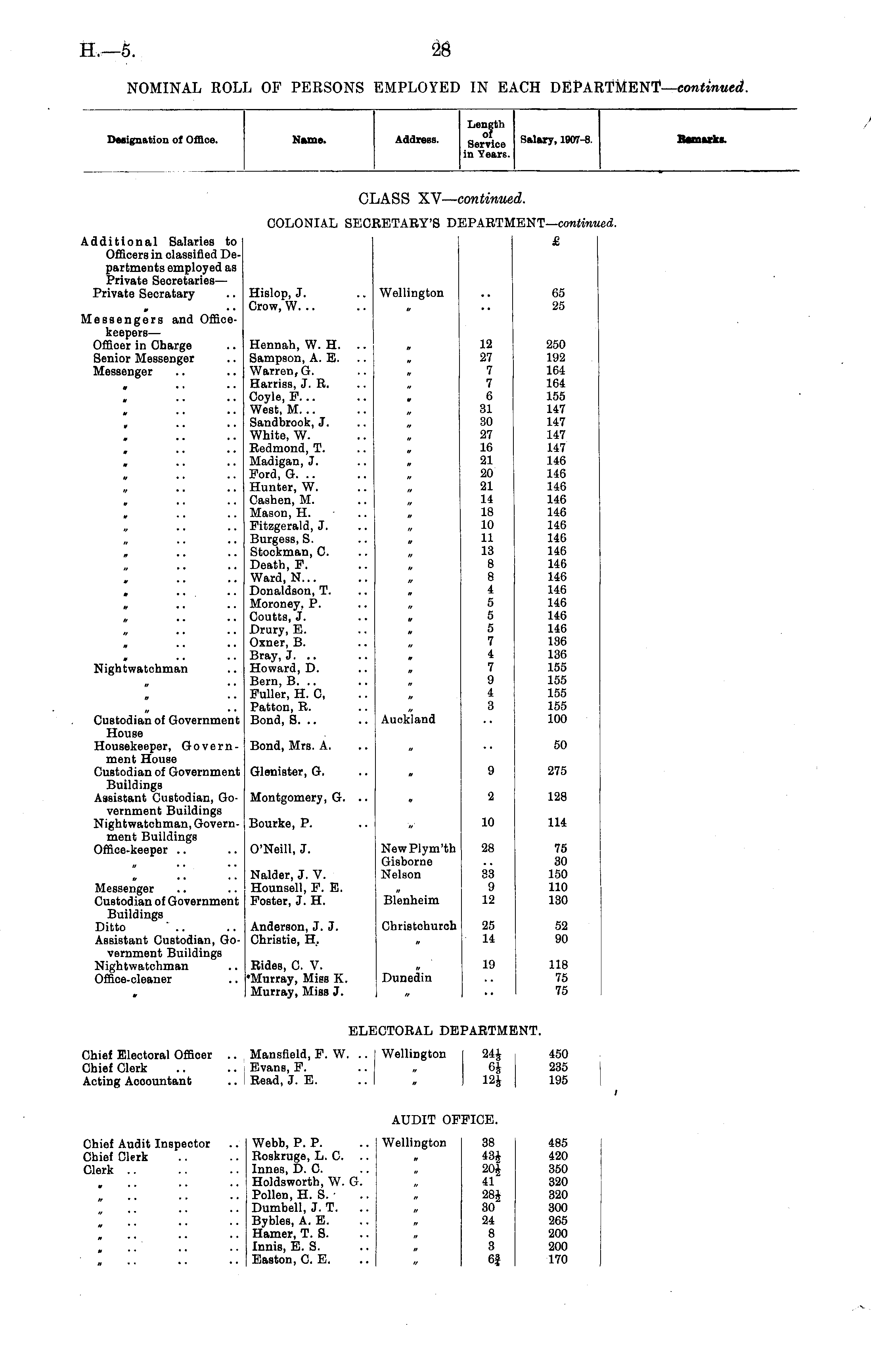 Designation of Office. Name. Address. Length Service in Years. Salary, 1907-8. Bam arks. CI LASS XV— c •.ontinuei u. COLONIAL SECI RETARY'S DI 3PARTM iENT— contim, ued. ted. Additional Salaries to Officers in classified Departments employed as Private Secretaries — Private Secratary .. Hislop, J. .. Crow, W. .. Messengers and Officekeepers— Officer in Charge .. Hennah, W. H. Senior Messenger .. Sampson, A. E. Messenger .. .. Warren, G. , .. .. Harriss, J. R. .. Coyle, P... .. West, M... .. Sandbrook, J. .. White, W. .. Redmond, T. , .. .. Madigan, J. .. Ford, G. .. „ .. .. Hunter, W. .. Cashen, M. .. Mason, H. „ .. .. Fitzgerald, J. .. Burgess, S. .. Stockman, 0. .. Death, P. .. Ward, N... , ... .. Donaldson, T. , .. .. Moroney, P. » .. .. Coutts, J. .. Drury, E. 0 .. .. Oxner, B. .. Bray, J. .. Nightwatchman .. Howard, D. .. Bern, B. .. .. Fuller, H. C, .. Patton, R. Custodian of Government Bond, 8. .. House Housekeeper, Govern- Bond, Mrs. A. ment House Custodian of Government Glenister, G. Buildings Assistant Custodian, Go- Montgomery, G. .. vernment Buildings Nightwatchman,Govern- Bourke, P. ment Buildings Offioe-keeper .. .. O'Neill, J. ". '.'. '.'. Nalder, J. V. Messenger .. .. Hounsell, F. E. Custodian of Government Poster, J. H. Buildings Ditto ' .. .. Anderson, J. J. Assistant Custodian, Go- Christie, H. vernment Buildings Nightwatchman .. Rides, C. V. Office-cleaner .. 'Murray, Mies K. . Murray, Miss J. Wellington „ Auckland New Plym'th Gisborne Nelson Blenheim Christchurch Dunedin £ 65 25 12 27 7 7 6 31 30 27 16 21 20 21 14 18 10 11 13 8 8 4 5 5 5 7 4 7 9 4 3 250 192 164 164 155 147 147 147 147 146 146 146 146 146 146 146 146 146 146 146 146 146 146 136 136 155 155 155 155 100 50 9 275 2 128 10 114 28 83 9 12 75 30 150 110 130 25 14 52 90 19 118 75 75 ELE 3CTORAL DEI 'ARTM BNT. Chief Electoral Officer .. Mansfield, P. W. .. I Chief Clerk .. .. Evans, P. Acting Acoountant .. I Read, J. E. .. I | Wellington 24J 6J 12* 450 235 195 AUDIT op: 'ICE. I Chief Audit Inspector .. Webb, P. P. .. I Chief Clerk .. .. Roskruge, L. C Clerk .. .. .. Innes, D. 0. .. Holdsworth, W. G. .. Pollen, H. S. • .. Dumbell, J. T. .. Bybles, A. E. .. Hamer, T. S. .. Innis, E. S. .. Easton, CE, I Wellington 38 43£ 20J 41 28J 30 24 8 3 6f 485 420 350 320 320 300 265 200 200 170