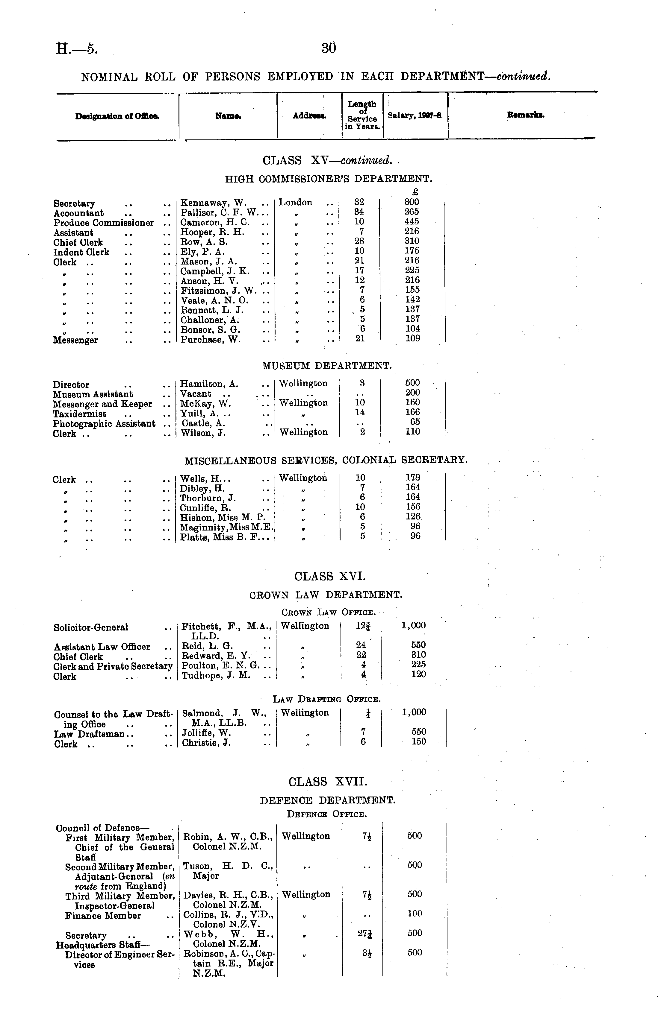 Designation of Office. Nam*. Address. Length of Service in Years. Salary, 1987-8. Remarks. CLASS XV — continued. HIGH COMMISSIONER'S DEPARTMENT. £ Secretary .. .. Kennaway, W. .. London .. 32 800 Accountant .. .. Palliser, 0. F. W. .. „ .. 34 265 Produce Commissioner .. Cameron, H. C .. „ .. 10 445 Assistant .. .. Hooper, R. H. .. „ .. 7 216 Chief Clerk .. .. Row, A. S. .. „ .. 28 310 Indent Clerk .. .. Ely, P. A. 10 175 Clerk .. .. .. Mason, J. A. .. „ .. 21 216 Campbell, J. K. .. „ .. 17 225 .. Anson, H. V. ,.. . .. 12 216 .. Fitzsimon, J. W. .. „ .. 7 155 Veale, A. N. 0. .. , .. 6 142 .. Bennett, L.J... „ ... 5 137 .. Challoner, A. .. „ .. 8 137 Bonsor, S. G 6 104 Messenger .. .. Purchase, W. .. „ .. 21 109 MUSEUM DEPARTMENT. Director .. .. Hamilton, A. .. Wellington 3 500 Museum Assistant .. Vacant .. ... .. ■ ■ 200 Messenger and Keeper .. McKay, W. .. Wellington 10 160 Taxidermist .. .. Yuill, A. .. .. . 14 166 Photographic Assistant .. Castle, A. .. .. ■ • 65 Clerk .. .. .. Wilson, J. .. Wellington 2 j 110 MISCELLANEOUS SERVICES, COLONIAL SECRETE RY. JY. Clerk .. .. .. Wells, H... .. Wellington 10 179 .. Dibley.H. .. 7 164 .. Thorburn, J. „ 6 164 .. Cunliffe, R. .. . 10 156 .. Hishon, Miss M. P. , 6 126 .. Maginnity,Miss M.E. „ 5 96 .. Platts, MissB. F... „ 5 96 CLASS XVI. CROWN LAW DEPARTMENT. Crown Law Office. Solicitor-General .. Pitchett, P., M.A., I Wellington 12f 1,000 LL.D. .. I Assistant Law Offioer .. Reid, L. G. .. „ 24 550 Chief Clerk .. .. Redward, E. Y. .. 22 310 Clerkand Private Secretary Poulton, E. N. G. .. ', 4 225 Clerk .. .. Tudhope, J. M. .. 4 120 Law Drafting Office. Counsel to the Law Draft- Salmond, J. W., Wellington \ 1,000 ing Offioe .. .. M.A., LL.B. Law Draftsman.. .. Jolliffe, W. .. , 7 550 Clerk .. .. • • Christie, J. „ 6 150 CLASS XVII. DEFENCE DEPARTMENT. Defence Office. Council of Defence — | First Military Member, | Robin, A. W., C.B., Wellington 7j 500 Chief of the General j Colonel N.Z.M. Staff Second Military Member, | Tuson, H. D. C, .. .. 500 Adjutant-General (en | Major route from England) Third Military Member, Davies, R. H, C.B., Wellington 74 500 Inspector-General Colonel N.Z.M. Finanoe Member .. Collins, R. J., VID., „ .. 100 Colonel N.Z.V. Secretary .. .. Webb, W. H., . 27J 500 Headquarters Staff— Colonel N.Z.M. Director of Engineer Ser- Robinson, A. C, Cap- „ 3J 500 vioes tain R.E., Major N.Z.M.