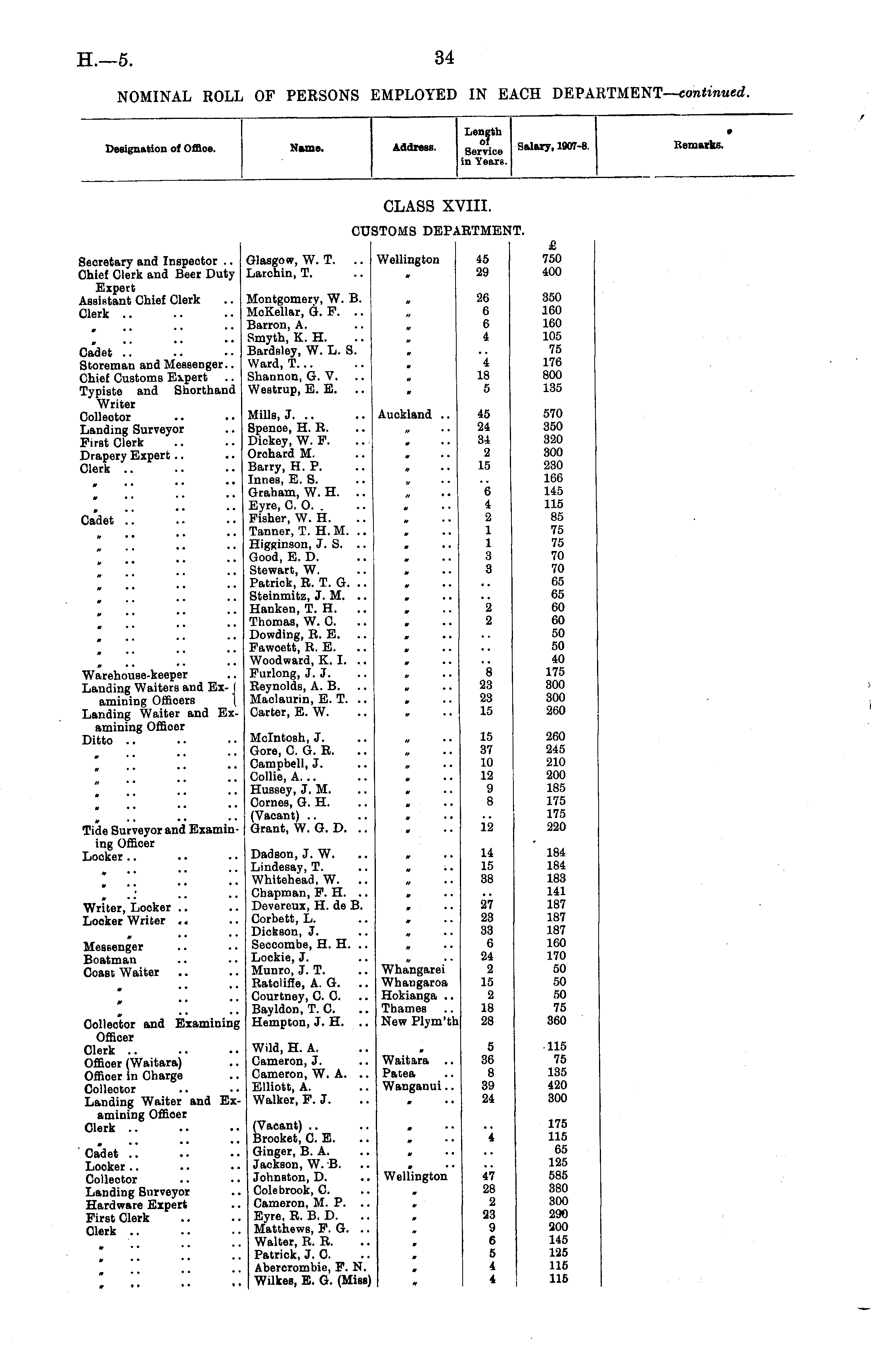 Designation of Offioe. Name. Address. Length SerVice Salary, 1907-8. in Years. * Remarks. CLASS X\ mi. CUSTOMS DEPA .rtme: T. Secretary and Inspeotor .. Chief Clerk and Beer Duty Expert Assistant Chief Clerk Clerk .. Glasgow, W. T. .. Wellington Larchin, T. .. . 45 29 £ 750 400 Cadet .. Storeman and Messenger.. Chief Customs Expert .. Typiste and Shorthand Writer Collector Landing Surveyor First Clerk Drapery Expert Clerk .. Montgomery, W. B. MoKellar, G. P. Barron, A. .. „ Smyth, K. H. Bardsley, W. L. S. Ward, T... Shannon, G. V. .. „ Westrup, E. E. .. 26 6 6 4 350 160 160 105 75 176 800 135 4 18 5 Cadet Mills, J. .. .. Auokland .. Spenoe, H. R. Dickey, W. P. Orchard M. Barry, H. P. Innes, E. S. .. . Graham, W. H. .. Eyre, CO.. Fisher, W. H Tanner, T. H. M. .. Higginson, J. S. .. . Good, E. D. Stewart, W. Patrick, R. T. G. .. Steinmitz, J. M. .. Hanken, T. H. .. Thomas, W. 0. Dowding, R. E. .. Fawoett, R. E. Woodward, K. I. ,. Furlong, J. J. .. „ Reynolds, A. B. .. „ Maclaurin, E. T. .. Carter, E. W. 45 24 34 2 15 6 4 2 1 1 3 3 570 350 320 300 230 166 145 115 85 75 75 70 70 65 65 60 60 50 50 40 175 300 300 260 2 2 Warehouse-keeper Landing Waiters and Ex- I amining Officers \ Landing Waiter and Examining Officer Ditto .. 8 23 23 15 0 •. . • Mcintosh, J. .. „ Gore, CG.E Campbell, J. Collie, A. .. Hussey, J. M. Comes, G. H. .. , (Vacant) .. .. . Grant, W. G. D 15 37 10 12 9 8 260 245 210 200 185 175 175 220 Tide Surveyor and Examining Officer Locker 12 Dadson, J. W. Lindesay, T. .. „ ;. Whitehead, W Chapman, P. H. .. . Devereux, H. de B. Corbett, L. .. , Dickson, J. Seccombe, H. H. .. „ Lockie, J. .. „ Munro, J. T. .. Whangarei Ratoliffe, A. G. .. Whangaroa Courtney, CO. .. Hokianga .. Bayldon, T. C .. Thames .. Hempton, J. H. .. New Plym'th 14 15 38 184 184 183 141 187 187 187 160 170 50 50 50 75 360 Writer, Locker .. Locker Writer 27 23 33 6 24 2 15 2 18 28 Messenger Boatman Coast Waiter it '' * • Collector and Examining Officer Clerk .. Offioer (Waitara) Offioer in Charge Collector Landing Waiter and Examining Offioer Clerk .. Wild, H. A. Cameron, J. .. Waitara .. Cameron, W. A. .. Patea Elliott, A. .. Wanganui.. Walker, F.J 5 36 8 39 24 115 75 135 420 300 Cadet .. Locker Collector Landing Surveyor Hardware Expert First Clerk Clerk .. (Vacant) .. .. . Brooket, 0. E Ginger, B. A. Jackson, W. B. .. . Johnston, D. .. Wellington Cole brook, C Cameron, M. P. .. . Eyre, R. B. D. Matthews, P. G. .. Walter, R. R. Patrick, J. O. Abercrombie, P. N. . Wilkes, E. G. (Miss) 4 47 28 2 23 9 6 5 4 4 175 115 65 125 585 380 300 290 200 145 125 115 115