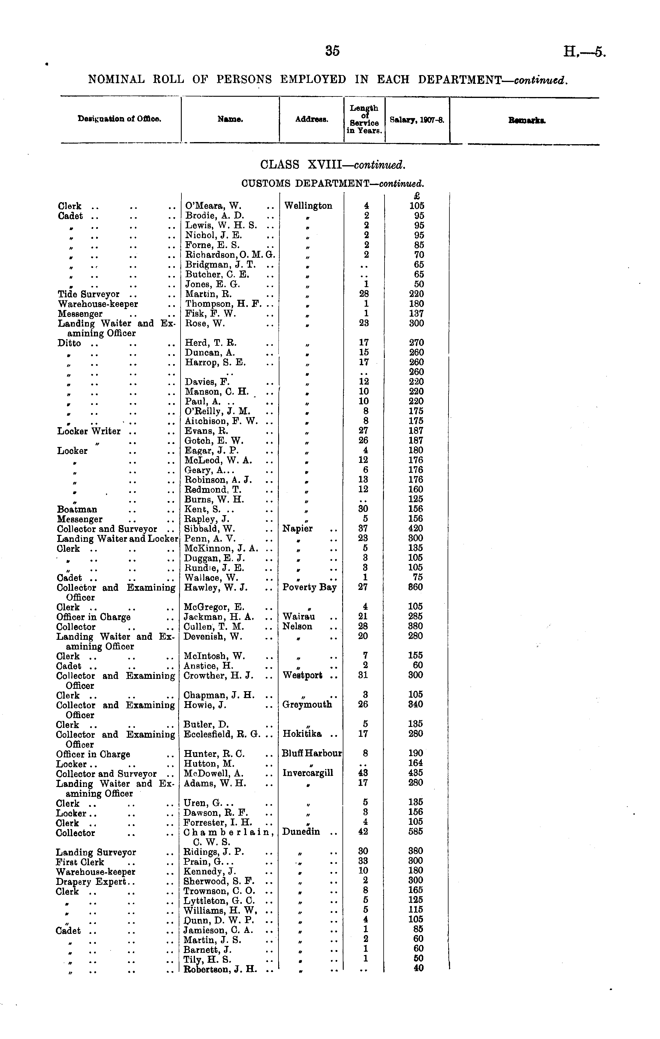 Designation of Office. Name. Address. Length Service in Years. Salary, 1907-8. Remarks. CL. XVIII —contin ued. CUSTOI IS DEPART1 :ENT—ci mtinued. £ 105 95 95 95 85 70 65 65 50 220 180 137 300 Clerk Cadet O'Meara, W. Brodie, A. D. Lewis, W. H. S. .. Nicbol, J. E. Forne, E. S. Richardson, O. M. G. Bridgman, J. T. Butcher, CE, Jones, E. G. Martin, R. Thompson, H. F. Fisk, P. W. Rose, W. Wellington 4 2 2 2 2 2 Tide Surveyor Warehouse-keeper Messenger Landing Waiter and Examining Officer Ditto .. 1 28 1 1 23 0 ■ • • • .. Locker Writer Locker Herd, T. R. Duncan, A. Harrop, S. E. Davies, P. Manson, C. H. Paul, A. .. .. O'Reilly, J. M. .. Aitchison, P. W. .. Evans, R. Gotoh, E. W. Eagar, J. P. McLeod, W. A. Geary, A... Robinson, A. J. Redmond, T. Burns, W. H. Kent, S. .. Rapley, J. Sibbald, W. Penn, A. V. McKinnon, J. A. Duggan, E. J. Rundie, J. E. Wallaoe, W. Hawley, W. J. 17 15 17 12 10 10 8 8 27 26 4 12 6 13 12 270 260 260 260 220 220 220 175 175 187 187 180 176 176 176 160 125 156 156 420 300 135 105 105 75 360 . . . • * •. Boatman Messenger Collector and Surveyor .. Landing Waiter and Locker Clerk .. Napier 30 5 37 23 5 3 3 1 27 Cadet .. Collector and Examining Officer Clerk Officer in Charge Collector Landing Waiter and Examining Offioer Clerk Cadet Collector and Examining Offioer Clerk .. Collector and Examining Offioer Clerk .. Collector and Examining Officer Officer in Charge Locker Collector and Surveyor .. Landing Waiter and Examining Officer Clerk Locker Clerk .. Collector McGregor, E. Jackman, H. A. Cullen, T. M. DeveniBh, W. Mcintosh, W. Anstice, H. Crowther, H.J. Chapman, J. H. Howie, J. Poverty Bay Wairau Nelson 0 .. Westport .. Greymouth 4 21 28 20 7 2 31 3 26 105 285 380 280 155 60 300 105 340 Butler, D. Ecolesfield, R. G. Hokitika .. 5 17 135 280 Hunter, R. 0. Hutton, M. McDowell, A. Adams, W. H. Bluff Harbour lnvercargill 8 43 17 190 164 435 280 Uren, G. .. Dawson, R. F. Forrester, I. H. Chamberlain, 0. W. S. Ridings, J. P. Prain, G... Kennedy, J. Sherwood, S. P. Trownson, CO. Lyttleton, G. C Williams, H. W, Dunn, D. W. P. .. Jamieson, Ci. Martin, J. S. Barnett, J. Tily, H. S. Robertson, J. H. .. 5 3 4 42 135 156 105 585 Dunedin .. Landing Surveyor First Clerk Warehouse-keeper Drapery Expert.. Clerk .. 0 . . a 30 33 10 2 8 5 5 4 1 2 1 1 380 300 180 300 165 125 115 105 85 60 60 50 40 Cadet .. 0