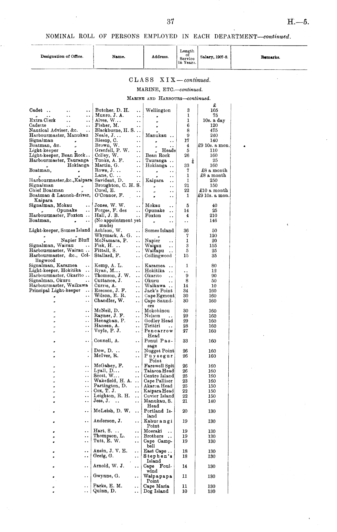 Designation of Office. Name. Address. Length Service Salary. 1907-8. in Years. Remarks, CLi 1 l S S XIX — continued. M. iRINE, ETC.— continued. Marin: & and Harbours— continued. Cadet .. Extra Clerk Cadette Nautical Adviser, &c. Harbourmaster, Manukau Signalman , Boatman, &o. „ Light-keeper . Light-keeper, Bean Rock.. Harbourmaster, Tauranga „ Hokianga Boatman, . Butcher, D. H. Munro, J. A. Alves, W... Fisher, M. Blackburne, H. S. .. Neale, J. .. Riesop, 0. Brown, W. Grenfell, P. W. Colley, W. Tunks, A. P. Martin, G. Rowe, J. .. Lane, C .. Savident, D. Broughton, C. H. S. Curel, E. O'Connor, F. I £ Wellington 3 105 1 75 „ 1 10b. a day 6 120 8 475 Manukau .. 9 240 17 140 4 £9 10s. a mon. , Heads 5 110 Bean Rook 26 160 Tauranga .. J 25 Hokianga .. 33 160 7 £8 a month „ .. 1 £8 a month Kaipara .. 1 250 21 150 22 £10 a month . .. 1 £910s. a mon. H arbourmaster,&c,Kaipara Signalman Chief Boatman „ Boatman & Launch-driver, Kaipara Signalman, Mokau „ Opunake Harbourmaster, Foxton .. Boatman, , Jones, W. W. Forges, P. des Hall, J. B. (No appointment yet made) Aohison, W. Whymark, A. G. McNamara, P. Pisk, H. .. Pittall, S. Stallard, F. Mokau ..5 40 Opunake ..14 25 Foxton .. 4 210 146 Light-keeper, Somes Island Napier Bluff Signalman, Wairau Harbourmaster, Wairau .. Harbourmaster, &c, Gollingwood Signalman, Karamea Light-keeper, Hokitika .. Harbourmaster, Okarito .. Signalman, Okuru Harbourmaster, Waikawa Prinoipal Light-keeper .. Somes Island 36 50 7 120 Napier ..1 20 Wairau .. 3 155 Waitapu .. 5 25 Collingwood 15 35 % . . • . • • Kemp, A. L. Ryan, M... Thomson, J. W. Cuttance, J. Curne, A. Ereoson, J. F. Wilson, E. R. Chandler, W. McNeil, D. Rayner, J. P. Henaghan, P. Hansen, A. .. Voyle, P. J. Connell, A. Dow, D. .. Mclver, R. McGahey, F. Lyall, D... Scott, W... Wakefield, H. A. .. Partington, D. Cox, T. J. Leighton, R. H. Jess, J. .. Karamea .. 1 80 Hokitika .. .. 12 Okarito .. 9 90 Okuru ..8 50 Waikawa ..14 10 Jack's Point 34 160 CapeEgmont 30 160 Cape Saund- 30 160 ers Mokohinou 30 160 Nelson .. 29 160 Godley Head 29 160 Tiritiri .. 28 160 Pencarrow 27 160 Head Ponui Pas- 33 160 sage Nugget Point 26 160 Puysegur 26 160 Point Farewell Spit 26 160 TaiaroaHead 26 160 Centre Island 25 160 Cape Palliser 23 160 Akaroa Head 25 150 Kaipara Head 22 150 Cuvier Island 22 150 Manukau, S. 21 140 Head Portland Is- 20 130 land Kahurangi 19 130 Point Moeraki .. 19 130 Brothers .. 19 130 Cape Camp- 19 130 bell East Cape .. 18 130 Stephen's 18 130 Island Cape Foul- 14 130 wind Waipapapa 11 130 Point Cape Maria 11 130 Dog Island | 10 130 . * . •. McLeish, D. W. . . • Anderson, J. . Hart, S. .. Thompson, L. Tutt, E. W. 0 *. . 0 .. Ansin, J. V. E. Greig, G. Arnold, W. J. 0 • • Gwynne, G. . • ■ Parks, E. M. Quinn, D.