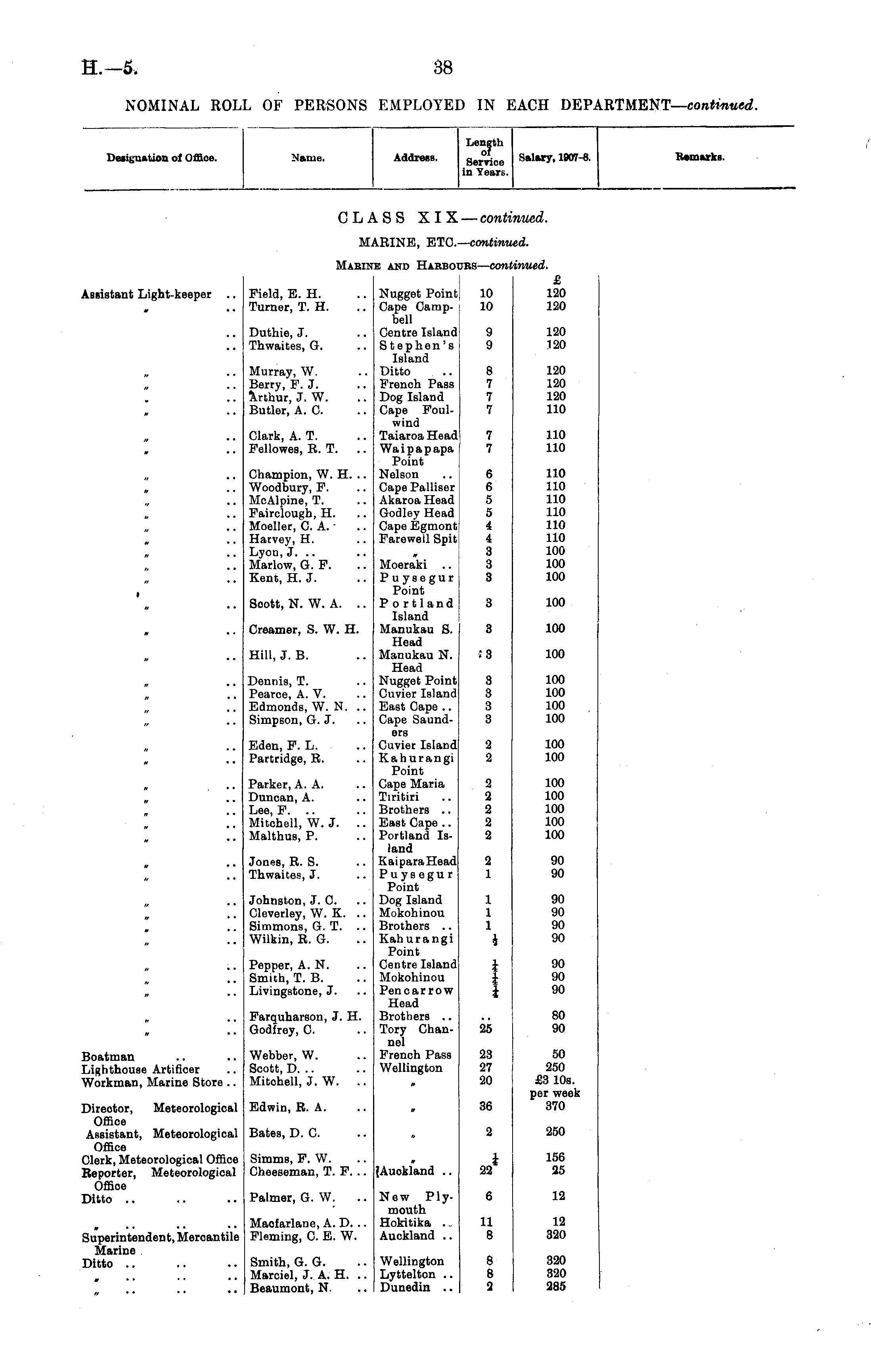 Designation of Office. Name. Address. Length of Service in Years. Salary, 1907-8. Remarks. CLASS XIX — conti'i tued. MARINE, ETC.— continw id. assistant Light-keeper .. Marine and Harbours — conU i Field, E. H. .. Nugget Point) 10 Turner, T. H. .. Cape Camp- i 10 bell Duthie, J. .. Centre Island 9 Thwaites, G. .. Stephen's 9 Island Murray, W. .. Ditto ... 8 Berry, P. J. .. B'rench Pass 7 Arthur, J. W. .. Dog Island 7 Butler, A. 0. .. Cape Foul- 7 wind Clark, A. T. .. Taiaroa Head 7 Fellowes, R. T. .. Waipapapa [ 7 Point Champion, W. H. .. Nelson .. 6 Woodbury, F. .. Cape Palliser 6 McAlpine, T. .. AkaroaHead 5 Fairclough, H. .. Godley Head 5 Moeller, C. A. - .. Cape Egmont 4 Harvey, H. .. Farewell Spit 4 Lyon, J. .. .. „ 3 Marlow, G. F. .. Moeraki .. 3 Kent, H. J. .. Puysegur 3 Point Soott, N. W. A. .. Portland 3 Island Creamer, S. W. H. Manukau S. 3 Head Hill, J. B. .. Manukau N. 3 Head Dennis, T. .. Nugget Point 3 Pearce, A. V. .. Cuvier Island 3 Edmonds, W.N. .. East Cape .. 3 Simpson, G. J. .. Cape Saund- 3 ers Eden, P. L. .. Cuvier Island 2 Partridge, R. .. Kahurangi 2 Point Parker, A. A. .. Cape Maria 2 Duncan, A. .. Tiritiri .. 2 Lee, P. .. .. Brothers .. 2 Mitchell, W. J. .. East Cape .. 2 Malthus, P. .. Portland Is- 2 land Jones, R. S. .. KaiparaHead 2 Thwaites, J. .. Puysegur 1 Point Johnston, J. C. .. Dog Island 1 Cleverley, W. K. .. Mokohinou 1 Simmons, G. T. .. Brothers .. 1 Wilkin, R. G. .. Kahurangi J Point Pepper, A.N. .. Centre Island Smith, T. B. .. Mokohinou Livingstone, J. .. Pencarrow J Head Farquharson, J. H. Brothers Godfrey, 0. .. Tory Chan- 25 nel Webber, W. .. French Pass 23 Scott, D. .. .. Wellington 27 Mitchell, J. W. .. . 20 inued. £ 120 120 . • • 120 120 120 120 120 110 110 110 0 • • 110 110 110 110 110 110 100 100 100 0 .. » 100 100 100 100 100 100 100 a • • 100 100 100 100 100 100 100 90 90 .. * • 90 90 90 90 90 90 90 80 90 0 . • Boatman Lighthouse Artificer Workman, Marine Store .. 50 250 £3 10s. per week 370 Director, Meteorological Office Assistant, Meteorological Office 31erk, Meteorological Offioe Reporter, Meteorological Office Ditto .. Edwin, R. A. .. , 36 Bates, D. C .. . 2 Simms, P. W. » 1 Cheeseman, T. P. .. (Auokland .. 22 250 156 25 Superintendent, Mercantile Marine Ditto .. Palmer, G. W. .. New Ply- 6 mouth Maofarlane, A. D. .. Hokitika ... 11 Fleming, 0. E. W. Auckland .. 8 12 12 320 Smith, G. G. .. Wellington 8 Marciel, J. A. H. .. Lyttelton .. 8 Beaumont, N. .. Dunedin .. 2 320 320 285