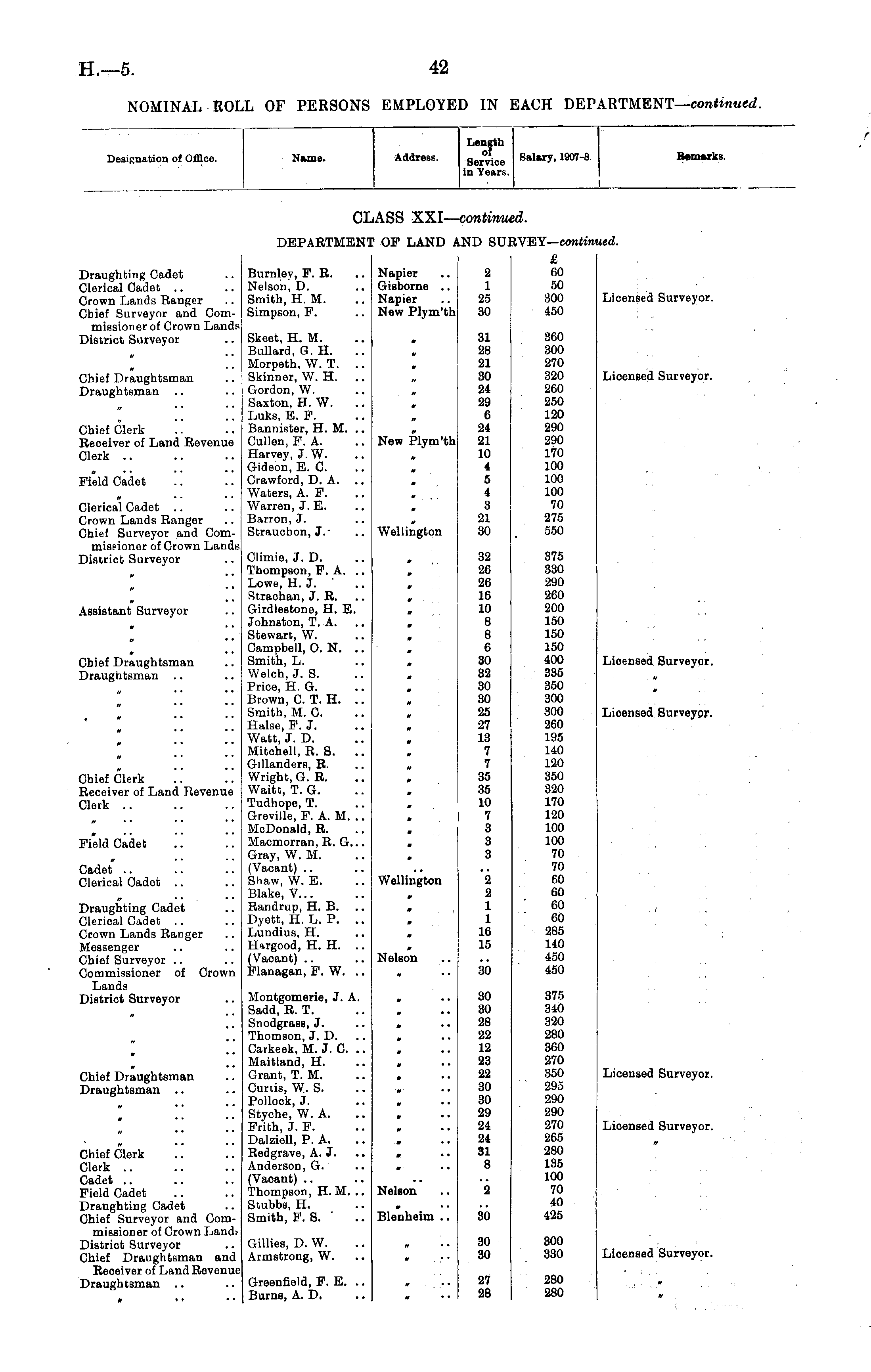Designation of Office. Name. Address. Length Service in Years. Salary, 1907-8. Remarks. C] ,ASS XXI— continui id. DEPARTMEN ! OF LAND A .ND SU1 iVEtY—contin; led. Draughting Cadet Clerical Cadet Crown Lands Ranger Chief Surveyor and Commissioner of Crown Lands District Surveyor Burnley, P. R. Nelson, D. Smith, H. M. Simpson, F. Napier Gisborne .. Napier New Plym'th 2 1 25 30 £ 60 50 300 450 Licensed Surveyor. Chief Draughtsman Draughtsman Chief Clerk Receiver of Land Revenue Clerk .. Skeet, H. M. Bullard, G. H. Morpeth, W. T. Skinner, W. H. .. Gordon, W. Saxton, H. W. Luks, E. P. Bannister, H. M. Cullen, F. A. Harvey, J. W. Gideon, E. C. Crawford, D. A. Waters, A. P. Warren, J. E. Barron, J. Strauchon, J.- . New Plym'th 31 28 21 30 24 29 6 24 21 10 4 5 4 3 21 30 360 300 270 320 260 250 120 290 290 170 100 100 100 70 275 550 Licensed Surveyor. Field Cadet Clerical Cadet Crown Lands Ranger Chief Surveyor and Commissioner of Crown Lands District Surveyor Wellington Assistant Surveyor . *. . , .. Chief Draughtsman Draughtsman .. Climie, J. D. Thompson, P. A. Lowe, H. j. Strachan, J. R. Girdlestone, H. E. Johnston, T. A. Stewart, W. Campbell, O. N. Smith, L. Welch, J. S. Price, H. G. Brown, C T. H. Smith, M. 0. Halse, P. J. Watt, J. D. Mitchell, R. S. .. Gillanders, R. Wright, G. R. Waitt, T. G. Tudhope, T. Greville, P. A. M. .. McDonald, R. Macmorran, R.G... Gray, W. M. (Vacant) Shaw, W. E. Blake, V... Randrup, H. B. Dyett, H. L. P. Lundius, H. Hargood, H. H. (Vacant) Flanagan, P. W. * 32 26 26 16 10 8 8 6 30 32 30 30 25 27 13 7 7 35 35 10 7 3 3 3 375 330 290 260 200 150 150 150 400 335 350 300 300 260 195 140 120 350 320 170 120 100 100 70 70 60 60 60 60 285 140 450 450 Lioensed Surveyor. Licensed Surveyor. , . . .. •. Chief Clerk Receiver of Land Revenue Clerk .. ' Field Cadet Cadet" .. Clerical Cadet 0 Draughting Cadet Clerical Cadet Crown Lands Ranger Messenger Chief Surveyor Commissioner of Crown Lands District Surveyor Wellington 2 2 1 1 16 15 Nelson 30 Chief Draughtsman Draughtsman .. . .. . • Montgomerie, J. A. Sadd, R. T. Snodgrass, J. Thomson, J. D. Carkeek, M. J. O. Maitland, H. Grant, T. M. Cunis, W. S. Pollock, J. Styche, W. A. Frith, J. P. Dalziell, P. A. Redgrave, A. J. Anderson, G. (Vacant) Thompson, H. M. .. Stubbs, H. Smith, F. S. ' 30 30 28 22 12 23 22 30 30 29 24 24 31 8 375 340 320 280 360 270 350 295 290 290 270 265 280 135 100 70 40 425 Licensed Surveyor. 0 • • • • Lioensed Surveyor. a .. . • Chief Clerk .'! '.'. Clerk .. Cadet Field Cadet Draughting Cadet Chief Surveyor and Commissioner of Crown Landi District Surveyor Chief Draughtsman and Receiver of Land Revenue Draughtsman .. Nelson Blenheim .. 2 30 Gillies, D. W. Armstrong, W. 30 30 300 330 Licensed Surveyor. Greenfield, P. E. Burns, A. D. 27 28 280 280 „ *. . •