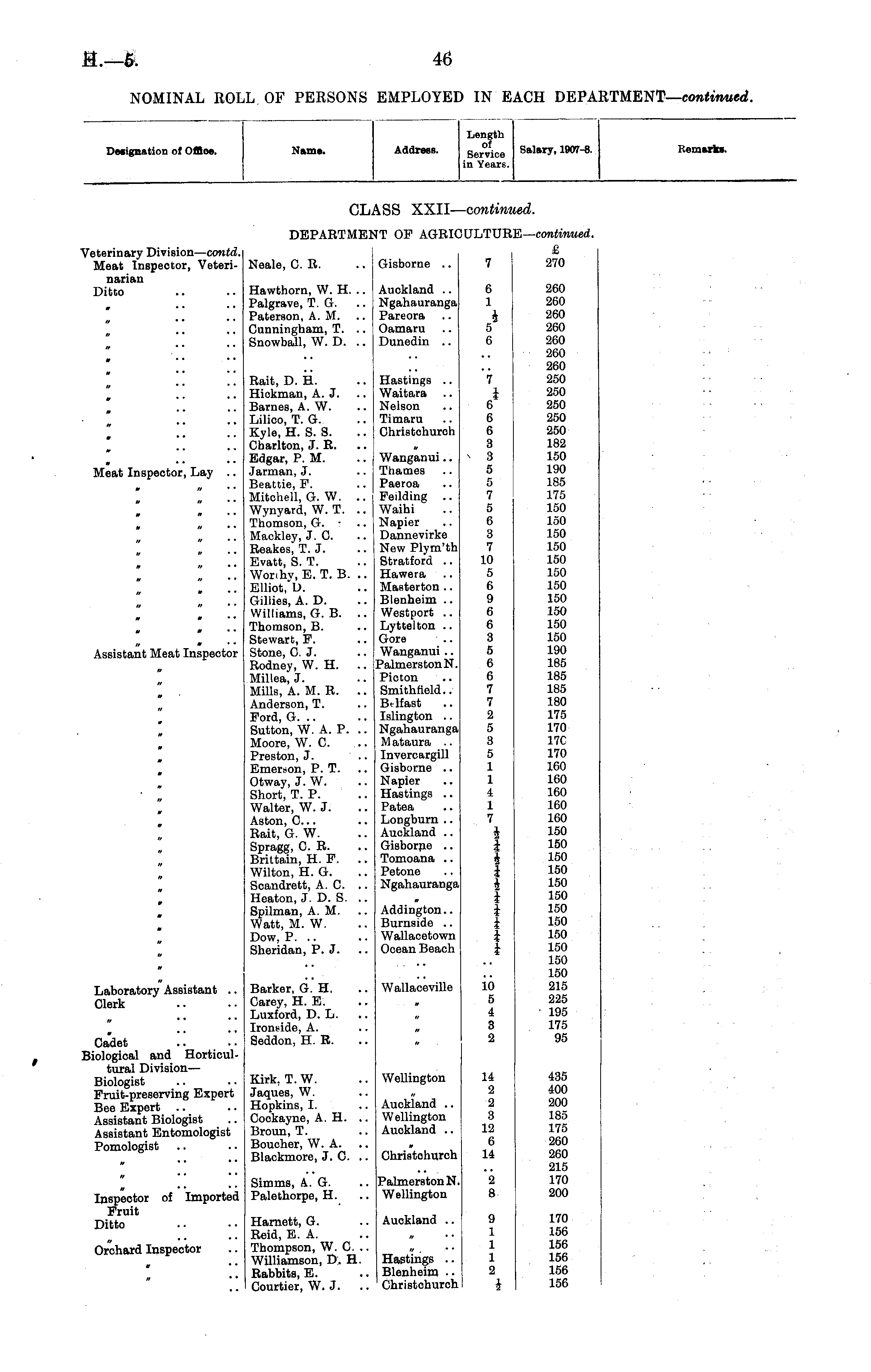 Designation of Offioe. Name. Address. Length of Service in Years. Salary, 1907-8. Remarks. CL ,ASS XXII--contin; md. DEPARTME] NT OP AGRIC ULTUB ;E— continued. Veterinary Division— contd. Meat Inspector, Veterinarian Ditto Neale, C8. Gisborne .. 7 £ 270 Hawthorn, W. H. .. Palgrave, T. G. Paterson, A.M. Cunningham, T. .. Snowball, W. D. Auokland .. Ngahauranga Pareora Oamaru Dunedin .. 6 1 i 5 6 260 260 260 260 260 260 260 250 250 250 250 250 182 150 190 185 175 150 150 150 150 150 150 150 150 150 150 150 190 185 185 185 180 175 170 17C 170 160 160 160 160 160 150 150 150 150 150 150 150 150 150 150 150 150 215 225 195 175 95 it • * ■ * » * ■ . • • u • • m * * * Meat Inspector, Lay .. * a * • a n • • w a • • tt m a it • * Assistant Meat Inspector Rait, D. H. Hickman, A. J. Barnes, A. W. Lilico, T. G. Kyle, H. S. S. Charlton, J. R. Edgar, P. M. Jarman, J. Beattie, P. Mitchell, G. W. .. Wynyard, W. T. .. Thomson, G. - Mackley, J. 0. Reakes, T. J. Evatt, S. T. Wonhv, E. T. B. .. Elliot," U. Gillies, A. D. Williams, G. B. .. Thomson, B. Stewart, P. Stone, O.J, Rodney, W. H. Millea, J. Mills, A. M. R. .. Anderson, T. Ford, G. .. Sutton, W. A. P. Moore, W. 0. Preston, J. Emerson, P. T. Otway, J. W. Short, T. P. Walter, W. J. Aston, 0... Rait, G. W. Spragg, 0. R. Brittain, H. P. Wilton, H. G. Scandrett, A. 0. Heaton, J. D. S. .. Spilman, A.M. Watt, M. W. Dow, P. .. Sheridan, P. J. Hastings .. Waitara Nelson Timaru Christchurch Wanganui.. Thames Paeroa Feilding .. Waihi Napier Dannevirke New Plym'th Stratford .. Hawera Masterton .. Blenheim .. Westport .. Lyttelton .. Gore Wanganui .. PalmerstonN. Picton Smithfield.. Belfast Islington .. Ngahauranga M ataura .. lnvercargill Gisborne .. Napier Hastings .. Patea Longburn .. Auokland .. Gisborne .. Tomoana .. Petone Ngahauranga 7 i 6 6 6 3 > 3 5 5 7 5 6 3 7 10 5 6 9 6 6 3 5 6 6 7 7 2 5 3 5 1 1 4 1 7 i I 4 i 4 I j I I *i a tt » a tt » i Addington.. Burnside .. Wallacetown Ocean Beach » a a Laboratory Assistant .. Clerk Barker, G. H. Carey, H. E. Luxford, D. L. Ironside, A. Seddon, H. R. Wallaoeville 10 5 4 3 2 Cadet Biological and Horticultural DivisionBiologist Fruit-preserving Expert Bee Expert Assistant Biologist Assistant Entomologist Pomologist Kirk, T. W. Jaques, W. Hopkins, I. Cockayne, A. H. Broun, T. Boucher, W. A. Blackmore, J. 0. Wellington Auckland .. Wellington Auckland .. 14 2 2 3 12 6 14 435 400 200 185 175 260 260 215 170 200 Christohurch a * • Inspector of Imported Fruit Ditto Simms, A. G. Palethorpe, H. PalmerstonN. Wellington 2 8 Harnett, G. Reid, E. A. Thompson, W. C. .. Williamson, D. H. Rabbits, E. Courtier, W. J. Auckland .. 9 1 1 1 2 1 170 156 156 156 156 156 Orchard Inspector Hastings .. Blenheim .. Christchurch