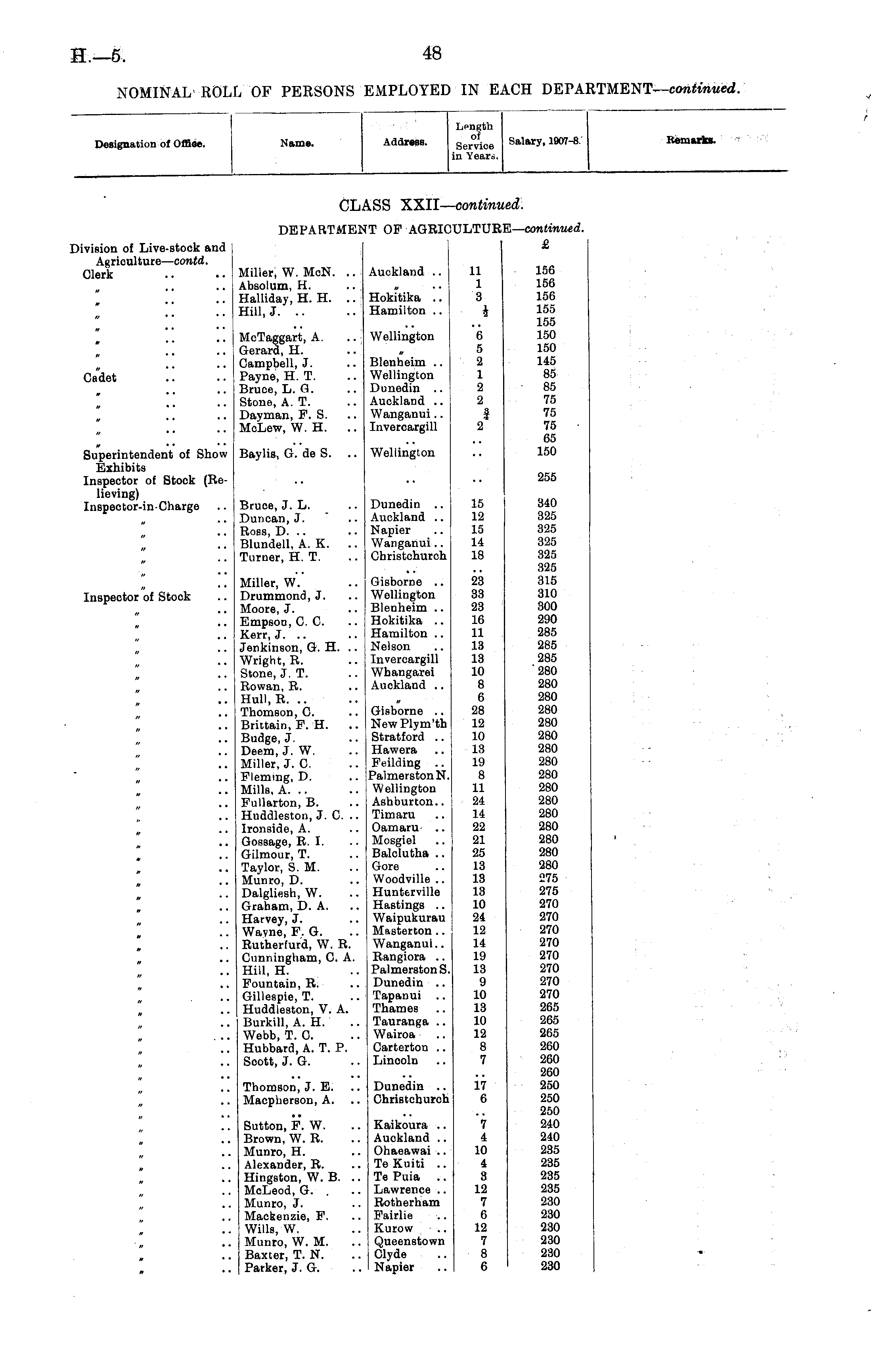 Designation of Offioe. Name. Address. Lpngth of Service in Years. Salary, 1907-8. Remarks. CLASS XXII— continit ud: Mvision of Live-stock and Agriculture— contd. Clerk DEPARTMENT OF AGRICULTUR i i IE— continued. £ Miller, W. McN. .. Auckland .. 11 Absolum, H. .. „ .. 1 Halliday, H. H. .. Hokitika .. 3 Hill, J. .. .. Hamilton .. J MoTaggart, A. .. Wellington 6 Gerard, H. 5 Campbell, J. .. Blenheim .. 2 Payne, H. T. .. Wellington 1 Bruce, L. G. .. Dunedin .. 2 Stone, A. T. .. Auckland .. 2 Dayman, P. S. .. Wanganui.. f McLew, W. H. .. lnvercargill 2 156 156 156 155 155 150 150 145 85 - 85 75 75 75 65 150 Cadet Superintendent of Show Exhibits Inspector of Stock (Relieving) Inspeotor-in-Charge Baylis, G. de S. .. Wellington 255 Inspector of Stock Bruce, J. L. .. Dunedin .. 15 Duncan, J. .. Auckland .. 12 Ross, D. .. .. Napier .. 15 Blundell, A. K. .. Wanganui.. 14 Turner, H. T. .. Christchurch 18 Miller, W. .. Gisborne .. 23 Drummond, J. .. Wellington 33 Moore, J. .. Blenheim .. 23 Empson, C C .. Hokitika .. 16 Kerr, J. .. .. Hamilton .. 11 Jenkinson, G. H. .. Nelson .. 13 Wright, R. .. lnvercargill 13 Stone, J. T. .. Whangarei 10 Rowan, R. .. Auckland .. 8 Hull, R. .. .. 0 6 Thomson, 0. .. Gisborne .. 28 Brittain, P. H. .. New Plym'th 12 Budge, J. .. Stratford .. 10 Deem, J. W. .. Hawera .. 13 Miller, J. 0. .. Peilding .. 19 Fleming, D. .. PalmerstonN. 8 Mills, A. .. .. Wellington 11 Fullarton, B. .. Ashburton.. 24 Huddleston, J. C .. Timaru .. 14 Ironside, A. .. Oamaru .. 22 Gossage, R.I. .. Mosgiel .. 21 Gilmour, T. .. Balclutha .. 25 Taylor, S. M. .. Gore .. 13 Munro, D. .. Woodville .. 13 Dalgliesh, W. .. Hunterville 13 Graham, D. A. .. Hastings .. 10 Harvey, J. .. Waipukurau 24 Wayne, F. G. .. Masterton .. 12 Rutherfurd, W. R. Wanganui.. 14 Cunningham, 0. A. Rangiora .. 19 Hill, H. .. Palmerston S. 13 Fountain, R. .. Dunedin .. 9 Gillespie, T. ..Tapanui .. 10 Huddleston, V. A. Thames .. 13 Burkill, A. H. .. Tauranga .. 10 Webb, T. C .. Wairoa .. 12 Hubbard, A. T. P. Carterton .. 8 Scott, J. G. .. Lincoln .. 7 340 325 325 325 325 325 315 310 300 290 285 285 285 280 280 280 280 280 280 280 280 280 280 280 280 280 280 280 280 275 275 270 270 270 270 270 270 270 270 265 265 265 260 260 260 250 250 250 240 240 235 235 235 235 230 230 230 230 230 230 ./ * • Thomson, J. E. .. Dunedin .. 17 Macpherson, A. .. Christchurch 6 Sutton, P. W. .. Kaikoura .. 7 Brown, W. R. .. Auckland .. 4 Munro, H. .. Ohaeawai .. 10 Alexander, R. .. Te Kuiti .. 4 Hingston, W. B. .. Te Puia .. 3 McLeod, G. . .. Lawrence .. 12 Munro, J. .. Rotherham 7 Mackenzie, F. .. Pairlie .. 6 Wills, W. .. Kurow .. 12 Munro, W. M. .. Queenstown 7 Baxter, T. N. .. Clyde .. 8 Parker, J. G. .. Napier .. 6 » • •