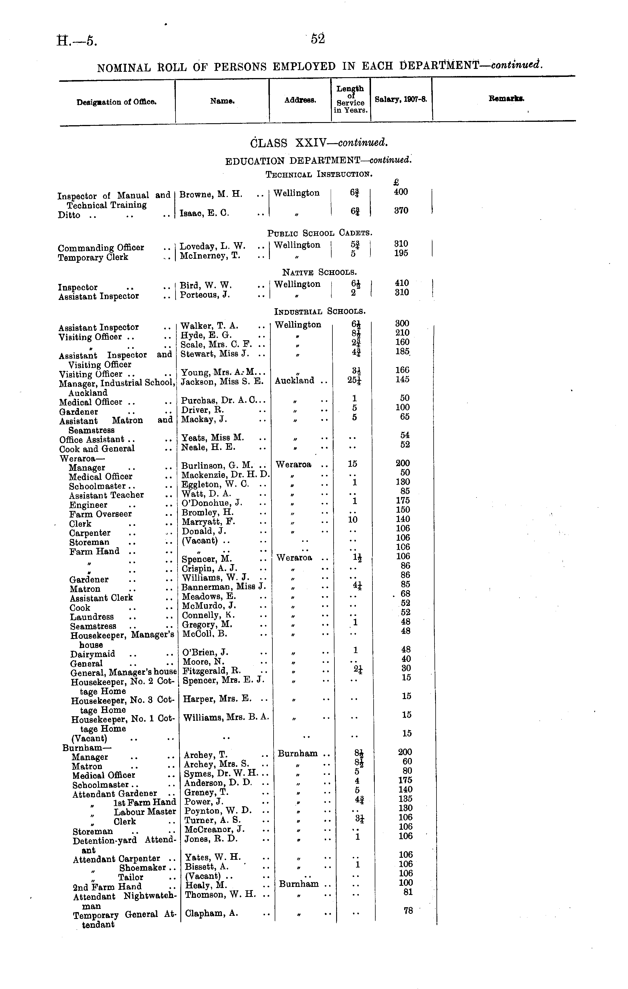 Desigaation of Office. Name. Address. Length Service in Years. Salary, 1907-8. Remarks. CLi> XXIV— continued. EDUCATI T DN DEPARTMENT— continued. Technical Instruction. Inspector of Manual and Technical Training Ditto .. Browne, M. H. £ Wellington 6f 400 6| 370 Isaac, E. 0. Commanding Officer .. I Temporary Clerk . . | I Loveday, L. W. .. I Mclnerney, T. .. I Public School Cadets. Wellington I 5| I 310 I 5 I 195 Inspector .. • • I Assistant Inspector .. | Bird, W. W. .. I Porteous, J. .. 1 Native Schools. Wellington I 6J I 410 2 I 310 Industrial Schools. Assistant Inspector Visiting Offioer Walker, T. A. Hyde, E.G. Scale, Mrs. C. F. .. Stewart, Miss J. .. Wellington 64 300 84 210 2| 160 4| 185 Assistant Inspector and Visiting Officer Visiting Offioer Manager, Industrial School, Auckland Medical Officer Gardener Assistant Matron and Seamstress Office Assistant Cook and General Weraroa — Manager Medical Officer Schoolmaster Assistant Teacher Engineer Farm Overseer Clerk Carpenter Storeman Farm Hand Young, Mrs. A.M... Jackson, Miss S. E. Purchas, Dr. A. C.. Driver, R. Mackay, J. Yeats, Miss M. Neale, H. E. 34 I 66 Auckland .. 251 U5 1 50 5 100 ... 5 65 54 .. ■• 52 Burlinson, G. M. Mackenzie, Dr. H. D. Eggleton, W. 0. Watt, D. A. O'Donohue, J. Bromley, H. Marryatt, F. Donald, J. (Vacant) Spencer, M. Crispin, A. J. Williams, W. J. .. Bannerman, Miss J. Meadows, E. McMurdo, J. Connelly, K. Gregory, M. McColl, B. Weraroa .. 15 200 50 -.1 130 .... 85 1 175 150 10 140 106 106 1C6 Weraroa .. 14 106 86 .... 86 41 85 .68 .. •• 52 52 ..1 48 .. •• 48 Gardener Matron Assistant Clerk Cook Laundress Seamstress Housekeeper, Manager's bouse Dairymaid General General, Manager's house Housekeeper, No. 2 Cottage Home Housekeeper, No. 3 Cottage Home Housekeeper, No. 1 Cottage Home (Vacant) Burnham — Manager Matron Medical Offioer Schoolmaster Attendant Gardener .. „ 1st Farm Hand Labour Master Clerk Storeman Detention-yard Attendant Attendant Carpenter .. „ Shoemaker .. Tailor 2nd Farm Hand Attendant Nightwatchman Temporary General Attendant O'Brien, J. Moore, N. Fitzgerald, R. Spencer, Mrs. E. J. Harper, Mrs. E. .. Williams, Mrs. B. A. Archey, T. Archey, Mrs. S. Symes, Dr. W. H. .. Anderson, D. D. Greney, T. Power, J. Poynton, W. D. .. Turner, A. S. McCreanor, J. Jones, R. D. ..1 48 40 21 30 .... 15 15 15 15 Burnham .. 84 200 84 60 ..5 80 4 175 5 140 4j 135 .... 130 31 106 106 1 106 Yates, W. H. Bissett, A. (Vacant) Healy, M. Thomson, W. H. 106 1 106 106 Burnham .. .. 100 .. •■ 81 Clapham, A. 78