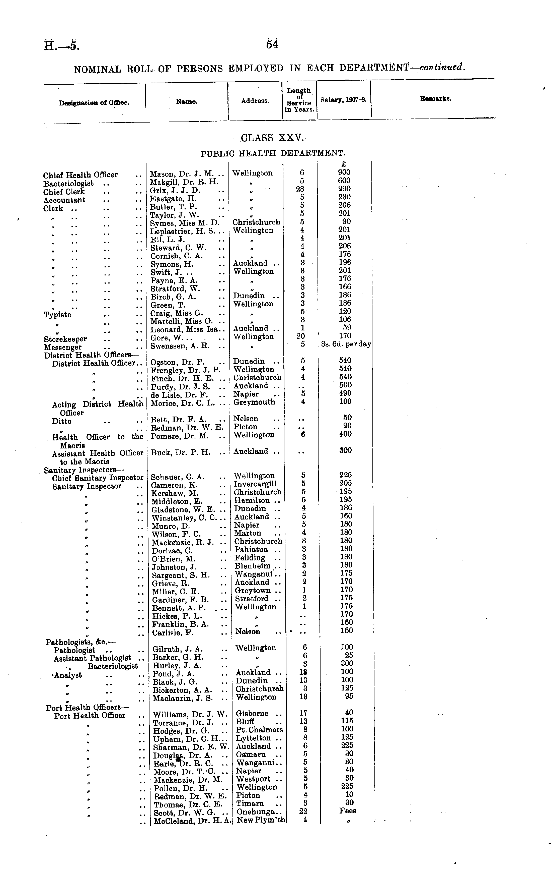 Designation of Office. Name. Address. Length Service Satar. UW-8. in Year6. Remarks. CLASS X :xv. PUBLIC :C HEALTH D )EPAR' 'MENT. Chief Health Offioer Bacteriologist Chief Clerk Aocountant Clerk .. Mason, Dr. J. M. .. Makgill, Dr. R. H. Grix, J. J. D. Eastgate, H. Butler, T. P. Taylor, J. W. Symes, Miss M. D. Leplastrier, H. S. .. Ell, L. J. Steward, C W. Cornish, C A. Symons, H. Swift, J. .. Payne, E. A. Stratford, W. Birch, G. A. Green, T. Craig, Miss G. Martelli, Miss G. .. Leonard, Miss Isa.. Gore, W. .. Swenssen, A. R. Wellington Christchurch Wellington Auckland .. Wellington 6 5 28 5 5 5 5 4 4 4 4 3 3 3 3 3 3 5 3 1 20 5 £ 900 600 290 230 206 201 90 201 201 206 176 196 201 176 166 186 186 120 106 59 170 8s. 6d. per day Dunedin .. Wellington Typiste . • * • ■ Storekeeper Messenger District Health Offioers — District Health Officer.. Auckland .. Wellington Ogston, Dr. F. Frengley, Dr. J. P. Pinch, Dr. H. E. Purdy, Dr. J. S. .. de Lisle, Dr. P. .. Morice, Dr. O. L. Dunedin .. Wellington Christchurch Auckland .. Napier Greymouth 5 4 4 540 540 540 500 490 100 0 • • Acting District Health Offioer Ditto *5 4 Belt, Dr. P. A. .. Redman, Dr. W. E. Pomare, Dr. M. Nelson Picton Wellington 6 50 20 400 Health Officer to the Maoris Assistant Health Officer to the Maoris Sanitary Inspectors— Chief Sanitary Inspeotor Sanitary Inspector Buck, Dr. P. H. .. Auckland .. 300 0 Sohauer, 0. A. Cameron, K. Kershaw, M. Middleton, E. Gladstone, W. E. .. Winstanley, C 0. .. Munro, D. Wilson, P.O. Mackenzie, R. J. .. Dorizao, 0. O'Brien, M. Johnston, J. Sargeant, S. H. Grieve, R. Miller, 0. B. Gardiner, P. B. Bennett, A. P. ... Hickes, P. L. Franklin, B. A. Carlisle, F. Wellington lnvercargill Christchurch Hamilton .. Dunedin .. Auckland .. Napier Marton Christchurch Pahiatua .. Peilding .. Blenheim .. Wanganui.. Auckland .. Greytown .. Stratford .. Wellington 5 5 5 5 4 5 5 4 3 3 3 3 2 2 1 2 1 225 205 195 195 186 160 180 180 180 180 180 180 175 170 170 175 175 170 160 160 0 • • * • • . ■ ■ Nelson Pathologists, &o.— Pathologist Assistant Pathologist .. Bacteriologist •Analyst Gilruth, J. A. Barker, G. H. Hurley, J. A. Pond, J. A. Black, J. G. Bickerton, A. A. Maclaurin, J. S. Wellington 6 6 3 18 13 3 13 100 25 300 100 100 125 95 » • • • • Auckland .. Dunedin .. Christchuroh Wellington . • ■ Port Health Officers — Port Health Offioer Williams, Dr. J. W. Torrance, Dr. J. .. Hodges, Dr. G. Upham, Dr. C H... Sharman, Dr. E. W. Douglas, Dr. A. .. Earle,T)r. R. 0. Moore, Dr. T.C. .. Mackenzie, Dr. M. Pollen, Dr. H. Redman, Dr. W. E. Thomas, Dr. 0. E. Scott, Dr. W. G. .. | MoCleland, Dr. H. A.j Gisborne .. Bluff Pt. Chalmers Lyttelton .. . Auckland .. Oamaru .. Wanganui.. Napier Westport .. Wellington Picton | Timaru | Onehunga.. i.j New Plym'th 17 13 8 8 6 5 5 5 5 5 4 3 22 i 4 40 115 100 125 225 30 30 40 30 225 10 30 Fees , * * * tt *