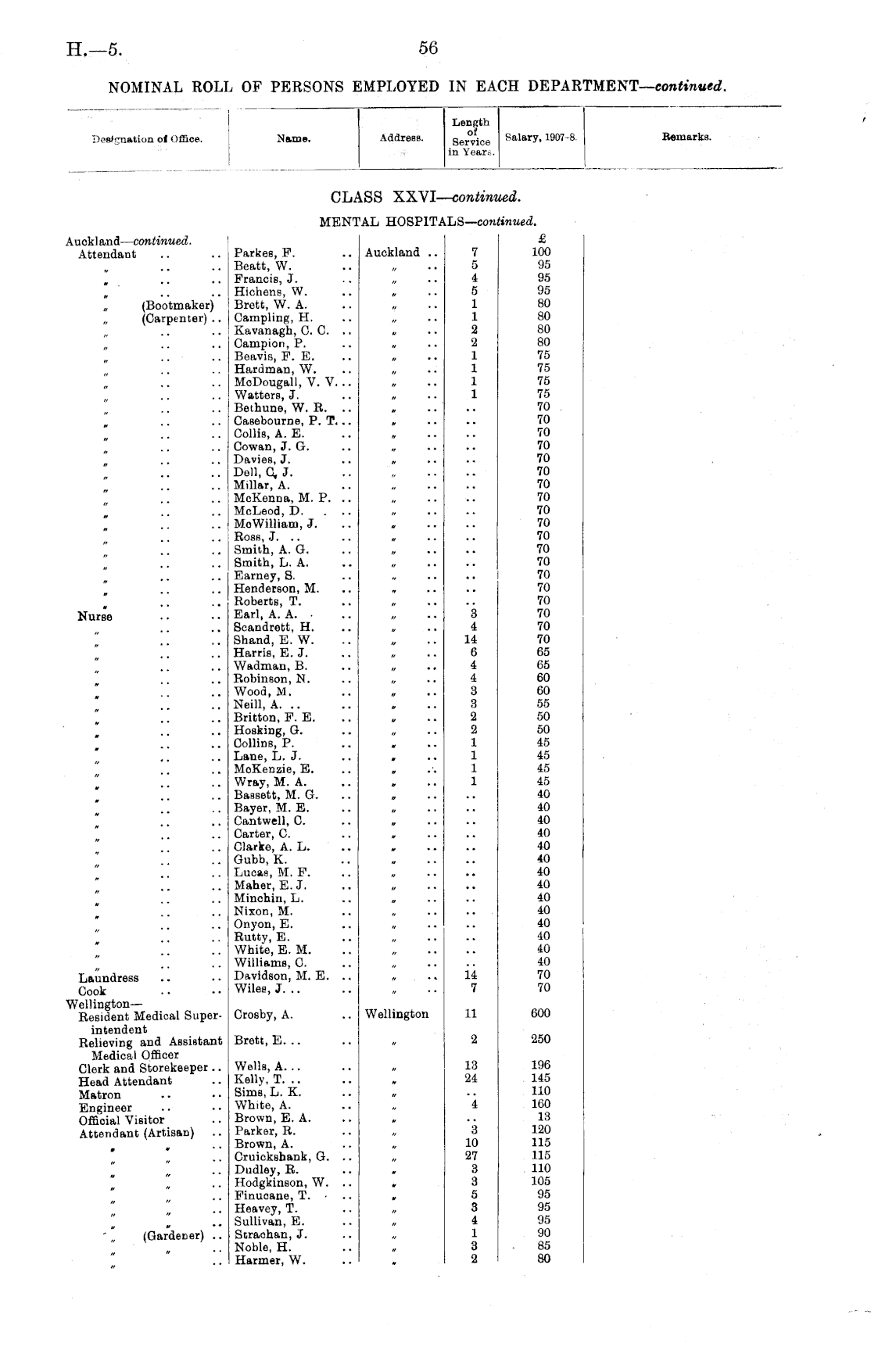 Designation of Office. Name. Address. Length of Service in Years. Salary, 1907-8. Remarks. CL. LSS XXVI--contim ;ed. Auckland— continued. Attendant MEN' 'AL HOSPIT. ,LS— com inued. „ (Bootmaker) (Carpenter) .. Nurse Parkes, P. Beatt, W. Franois, J. Hiohens, W. Brett, W. A. Campling, H. Kavanagh, 0. C. Campion, P. Beavis, P. E. Hardman, W. MoDougall, V. V... Watters, J. Bethune, W. R. Casebourne, P. T. .. Collis, A. E. Cowan, J. G. Davies, J. Dell, C, J. Millar, A. MoKenna, M. P. McLeod, D. ... MoWilliam, J. Ross, J. .. Smith, A. G. Smith, L. A. Earney, S. Henderson, M. Roberts, T. Earl, A. A. ■ Scandrett, H. Shand, E. W. Harris, E. J. Wadman, B. Robinson, N. Wood, M. Neill, A. .. Britton, P. E. Hosking, G. Collins, P. Lane, L. J. MoKenzie, E. Wray, M. A. Bassett, M. G. Bayer, M. E. Cantwell, O. Carter, O. Clarke, A. L. .. Gubb, K. Lucas, M. P. Maher, E. J. Minchin, L. Nixon, M. Onyon, E. Rutty, E. White, E. M. Williams, O. Davidson, M. E. Wiles, J Auckland .. 7 5 4 5 1 1 2 2 1 1 1 1 3 4 14 6 4 4 3 3 2 2 1 1 1 1 £ 100 95 95 95 80 80 80 80 75 75 75 75 70 70 70 70 70 70 70 70 70 70 70 70 70 70 70 70 70 70 70 65 65 60 60 55 50 50 45 45 45 45 40 40 40 40 40 40 40 40 40 40 40 40 40 40 70 70 . .. .. » • ■ • • Laundress Cook WellingtonResident Medical Superintendent Relieving and Assistant Medical Officer Clerk and Storekeeper .. Head Attendant Matron Engineer Offioial Visitor Attendant (Artisan) 14 7 Crosby, A. Wellington 11 600 Brett, E. .. 2 250 . . Wells, A. .. Kelly, T... Sims, L. K. White, A. Brown, E. A. Parker, R. Brown, A. Cruickshank, G. .. Dudley, R. Hodgkinson, W. .. Pinuoane, T. ■ Heavey, T. Sullivan, E. Straohan, J. Noble, H. Harmer, W. 13 24 "i 3 10 27 3 3 5 3 4 1 3 2 196 145 110 160 13 120 115 115 110 105 95 95 95 90 . 85 80 . a 0 0 '' (Gardener) ..