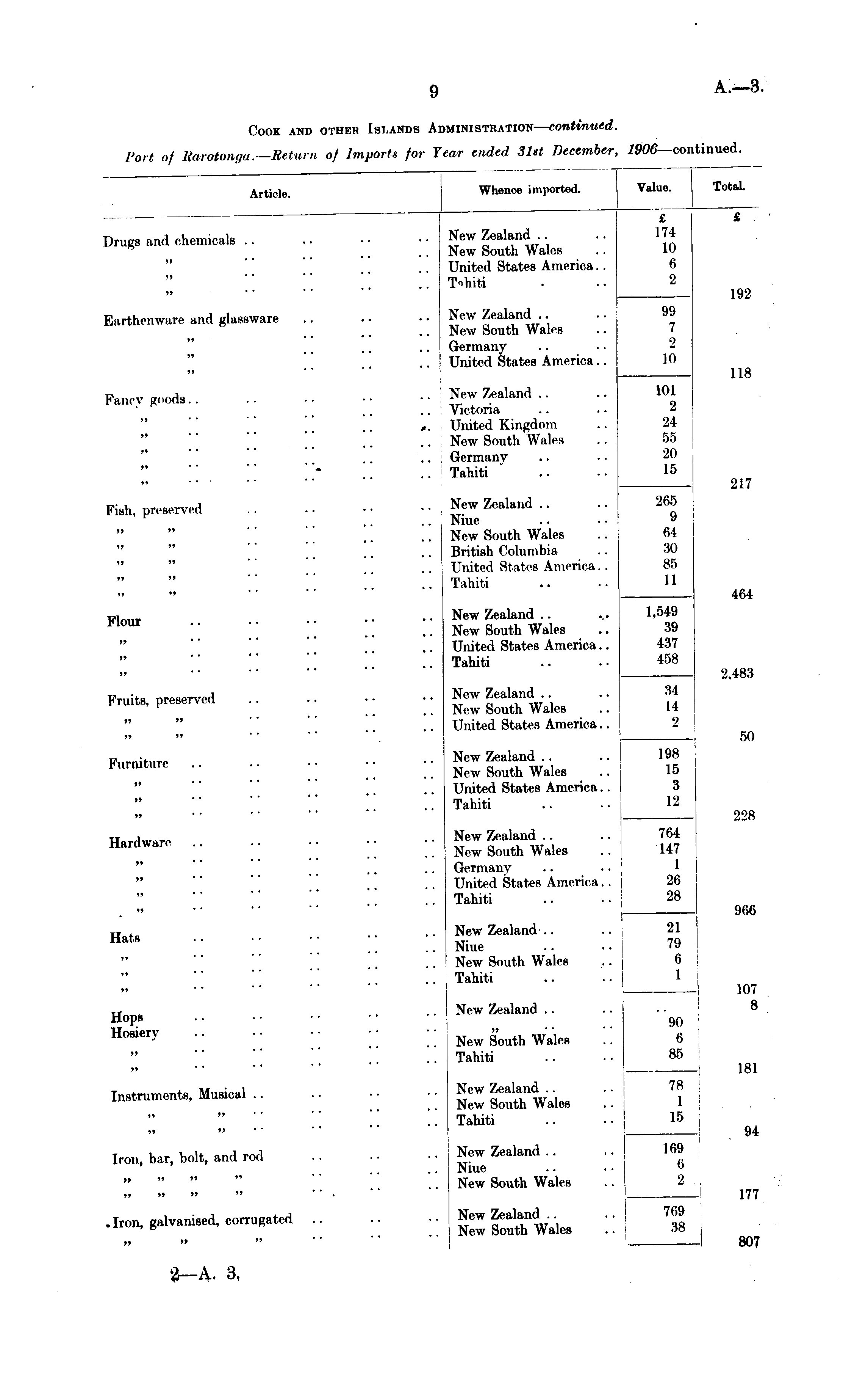 Article. Whence ini]iorted. Value. Total. £ 174 10 6 2 JC Drugs and chemicals .. »» * • New Zealand New South Wales United States America. . Tahiti »» »♦ • * 192 Earthenware and glassware »» New Zealand New South Wales Germany United States America . . 99 7 2 10 »t t> 118 P"ancy gooda.. »» * ' »J ' * * . New Zealand . . Victoria United Kingdom New South Wales Germany Tahiti 101 2 24 55 20 15 .. »» * * ,, . . 217 Kish, preserved >» »» *» M New Zealand Niue New South Wales British Columbia United States America.. Tahiti 265 9 64 30 85 11 » >» »» >» »» '» 464 Flour »> * * New Zealand New South Wales United States America .. Tahiti 1,549 39 437 458 »> " ' 2,183 Fruits, preserved New Zealand .. New South Wales United States America.. 34 14 2 »» M »> W BO Furniture >» • • New Zealand New South Wales United States America.. Tahiti 198 15 3 12 » • • »> • * 228 Hardware »» * • New Zealand New South Wales Germany United States America. . Tahiti 764 147 1 26 28 »» • • *• • ■ ♦* • • !)i;<; Hats ** New Zealand Niue ! New South Wales , Tahiti 21 79 6 1 »» * ' »» 107 8 Hops Hosiery New Zealand New South Wales Tahiti 90 85 »♦ * * »» * * 181 Instruments, Musical .. New Zealand New South Wales Tahiti 78 15 >» " » » 94 i " I Inni, bar, bolt, and rod New Zealand Niue New South Wales 169 I 177 „ „ » " „ ,» » » i • Iron, galvanised, corrugated New Zealand New South Wales 769 38 „ ,i » 1 i 807