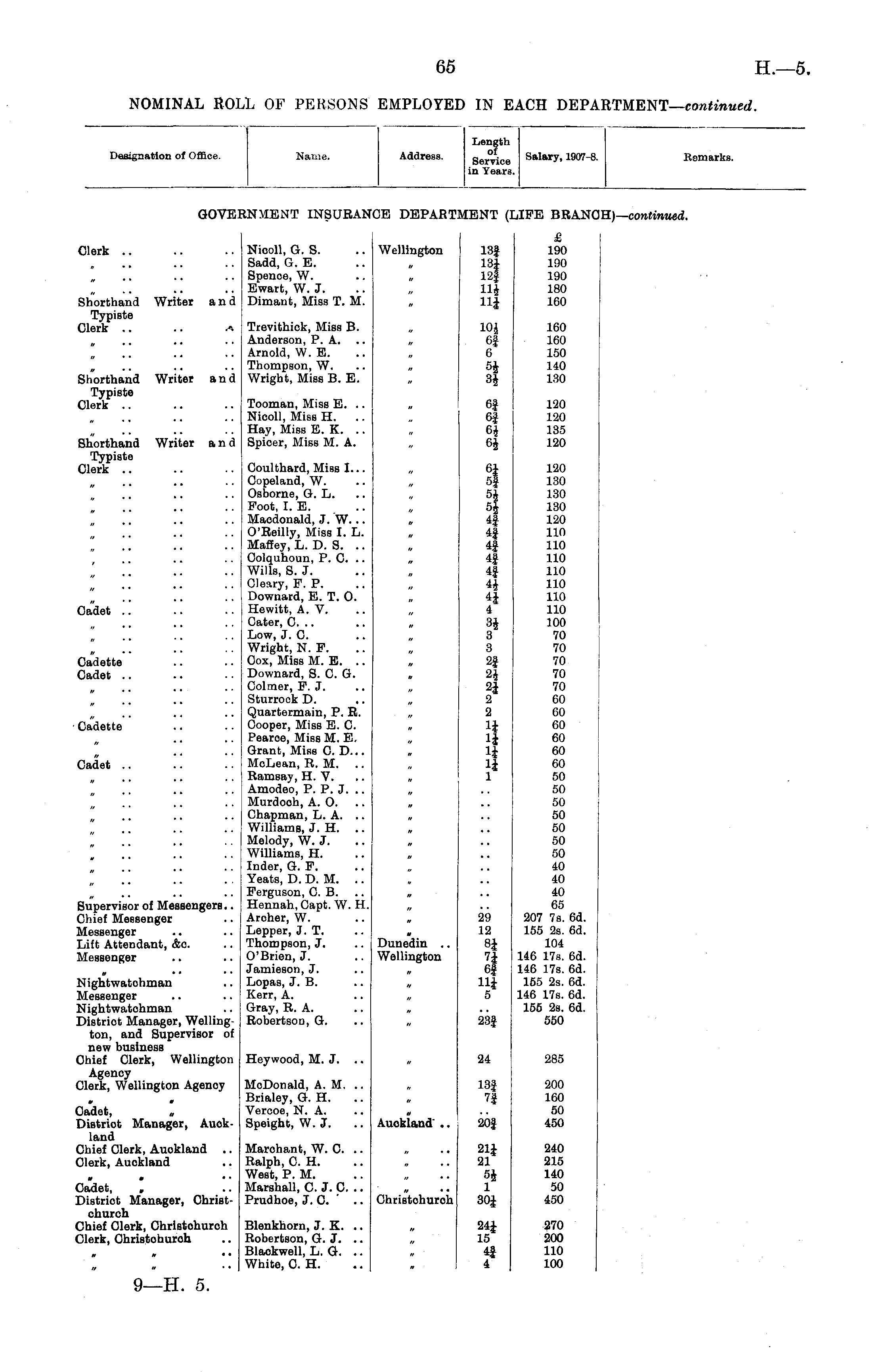 Designation of Office. Name. Address. Length Ser° ice Sttlar y- 1907 - a in Years. Remarks. GOVE INMENT INSURAN 3E depart: [ENT ( jIPE BRANO '.) — continued. Clerk .. Niooll, G. S. Sadd, G. E. Spenoe, W. Ewart, W. J. Dimant, Miss T. M. Wellington 13} 131 12} Hi ll| £ 190 190 190 180 160 Shorthand Writer and Typiste Clerk .. .. a Trevithiok, Miss B. Anderson, P. A. Arnold, W. E. Thompson, W. Wright, Miss B. E. 10* 6} 6 54 H 160 160 150 140 130 Shorthand Writer and Typiste Clerk .. Tooman, Miss E. .. Niooll, Miss H. Hay, Miss E. K. Spicer, Miss M. A. 6} 6} 6* 6J 120 120 135 120 Shorthand Writer and Typiste Clerk .. Cadet .. Cadette Cadet Cadette Coulthard, Miss I... Copeland, W. Osborne, G. L. Foot, I. E. Macdonald, J. W. .. O'Reilly, Miss I. L. Maffey, L. D. S. Oolquhoun, P. C Wills, S. J. Cleary, F. P. Downard, E. T. 0. Hewitt, A. V. Cater, C .. Low, J. 0. Wright, N. P. Cox, Miss M. E. Downard, S. 0. G. Colmer, F. J. Sturrook D. Quartermain, P. R. Cooper, Miss E. C Pearoe, Miss M. E, Grant, Miss CD... McLean, R. M. .. Ramsay, H. V. Amodeo, P. P. J. Murdooh, A. O. Chapman, L. A. Williams, J. H. Melody, W. J. Williams, H. Inder, G. F. Yeats, D. D. M. Ferguson, CB, Hennah, Capt. W. H. Aroher, W. Lepper, J. T. Thompson, J. O'Brien, J. Jamieson, J. Lopas, J. B. Kerr, A. Gray, R. A. Robertson, G. 3 4} 4} 4} 4} 4} 44 4 4 34 3 3 2} 24 ai 2 2 11 1J li 11 1 120 130 130 130 120 110 110 110 110 110 110 110 100 70 70 70 70 70 60 60 60 60 60 60 50 50 50 50 50 50 50 40 40 40 65 207 7s. 6d. 155 2s. 6d. 104 146 17s. 6d. 146 17s. 6d. 155 2s. 6d. 146 17s. 6d. 155 2s. 6d. 550 Cadet Supervisor of Messengers.. Chief Messenger Messenger Lift Attendant, &c. Messenger Dunedin .. Wellington 29 12 81 71 6} HI 5 Nightwatohman Messenger Nightwatohman District Manager, Wellington, and Supervisor of new business Chief Clerk, Wellington Agency Clerk, Wellington Agency 23} Hey wood, M. J. " 24 285 McDonald, A. M. Brialey, G. H. Vercoe, N. A. Speight, W.J. 13} 7} 200 160 50 450 Cadet, „ Distriot Manager, Auokland Chief Clerk, Auokland .. Clerk, Auokland Auckland .. 20} Cadet, . District Manager, Christchuroh Chief Clerk, Christohurch Clerk, Christohuroh Marchant, W. 0. Ralph, 0. H. West, P. M. Marshall, C. J. 0. .. Prudhoe, J. 0. 211 21 54 1 30J 240 215 140 50 450 Christchurch Blenkhorn, J. K. Robertson, G.J. Blaokwell, L. G. White, 0. H. 24J 15 4} 4 270 200 110 100