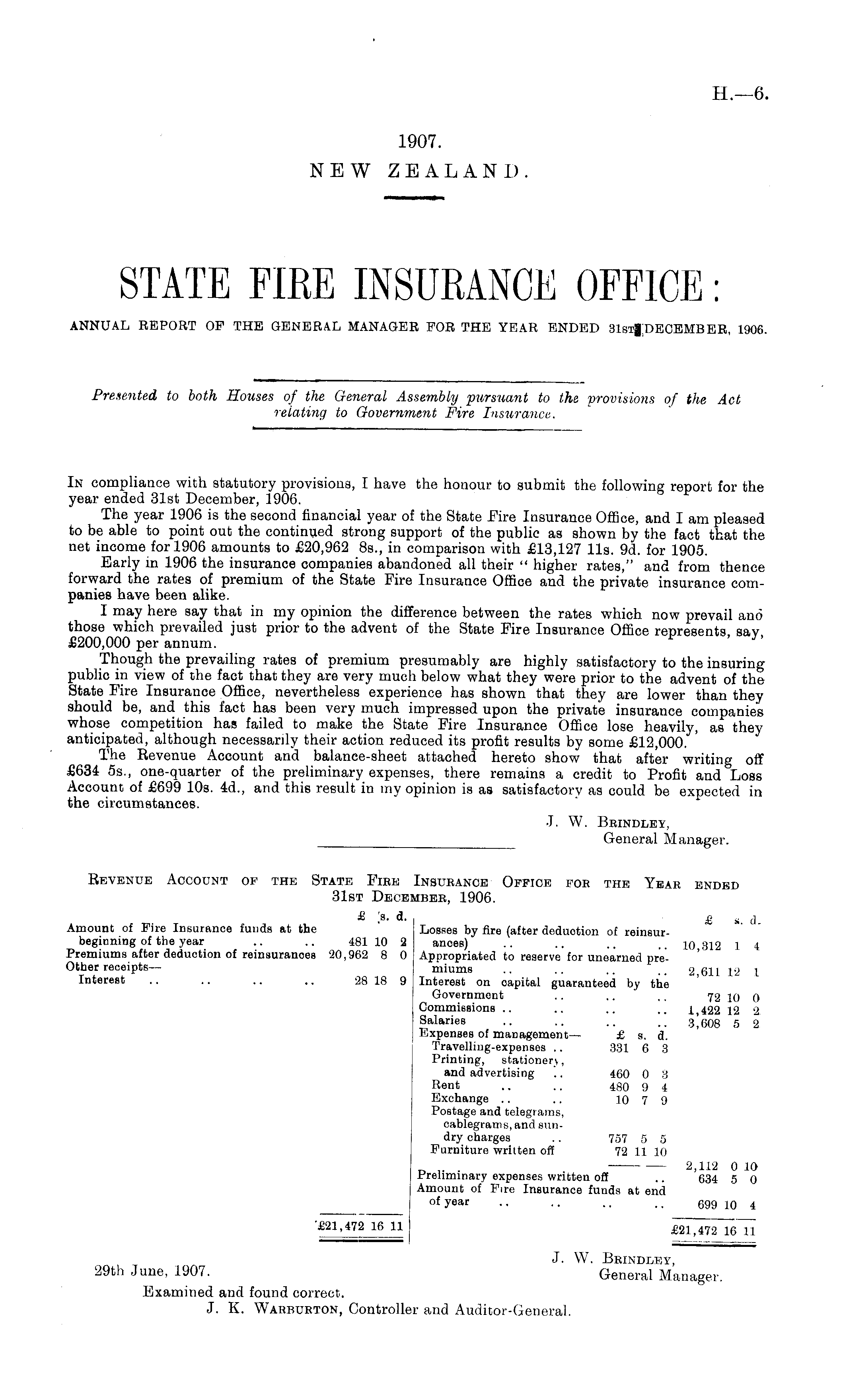 In compliance with statutory provisions, I have the honour to submit the following report for the year ended 31st December, 1906. The year 1906 is the second financial year of the State Eire Insurance Office, and I am pleased to be able to point out the continued strong support of the public as shown by the fact that the net income for 1906 amounts to £20,962 Bs., in comparison with £13,127 lis. 9d. for 1905. Early in 1906 the insurance companies abandoned all their " higher rates," and from thence forward the rates of premium of the State Fire Insurance Office and the private insurance companies have been alike. I may here say that in my opinion the difference between the rates which now prevail and those which prevailed just prior to the advent of the State Fire Insurance Office represents say £200,000 per annum. Though the prevailing rates of premium presumably are highly satisfactory to the insuring public in view of the fact that they are very much below what they were prior to the advent of the State Fire Insurance Office, nevertheless experience has shown that they are lower than they should be, and this fact has been very much impressed upon the private insurance companies whose competition has failed to make the State Fire Insurance Office lose heavily, as they anticipated, although necessarily their action reduced its profit results by some £12,000. The Revenue Account and balance-sheet attached hereto show that after writing off £634 55., one-quarter of the preliminary expenses, there remains a credit to Profit and Loss Account of £699 10s. 4d., and this result in my opinion is as satisfactory as could be expected in the circumstances. J. W. Bbindley, General Manager.