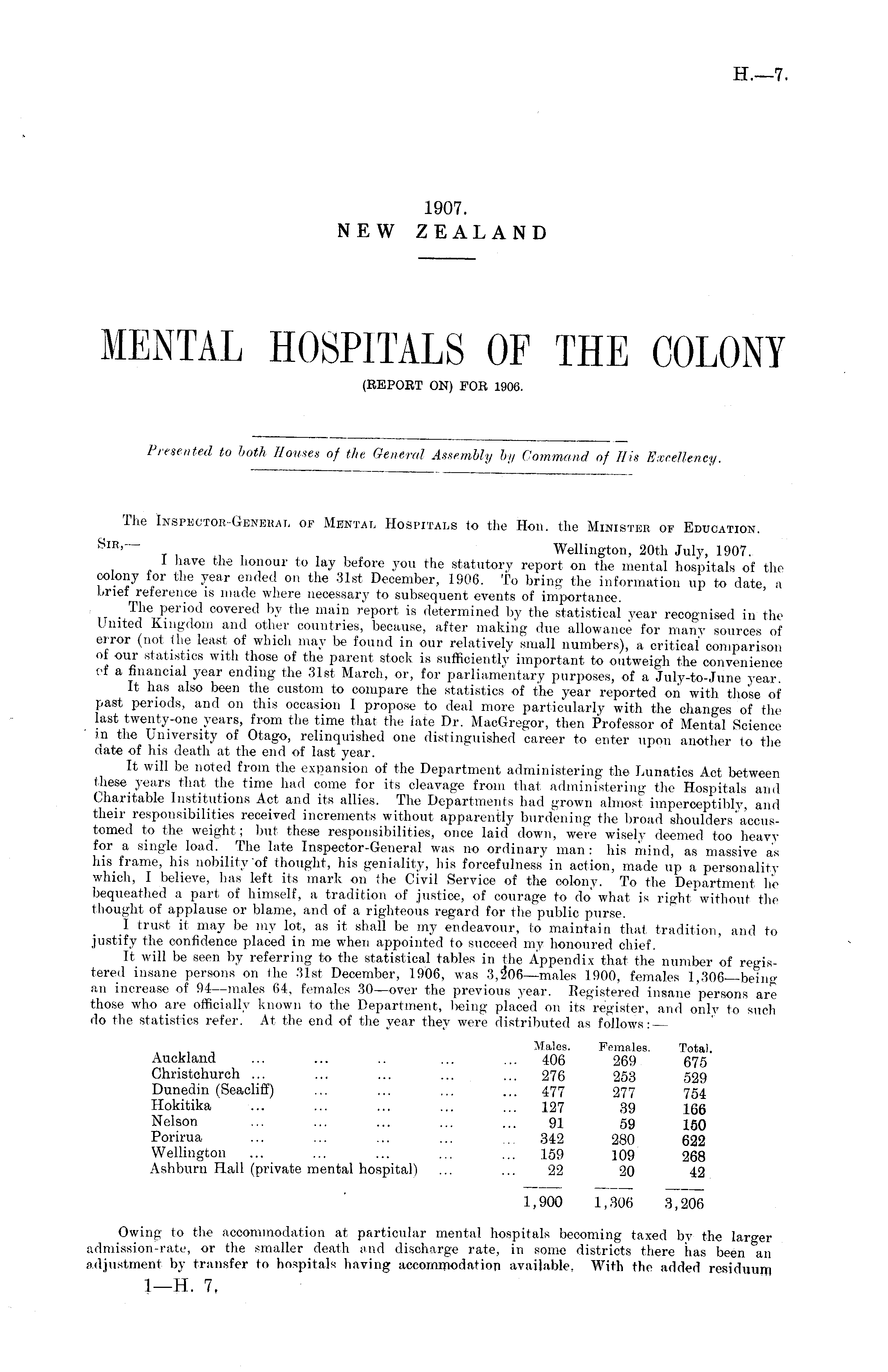 The Inspector-General op Mental Hospitals to the Hon. the Minister of Education. Sir >~ _ . , , Wellington, 20th July, 1907. 1 have the honour to lay before you the statutory report on the mental hospitals of the colony for the year ended on the 31st December, 1906. To bring the information up to date a brief reference is made where necessary to subsequent events of importance. , _ The period covered by the main report is determined by the statistical year recognised in the United Kingdom and other countries, because, after making due allowance for many sources of error (not the least of which may be found in our relatively small numbers), a critical comparison of our statistics with those of the parent stock is sufficiently important to outweigh the convenience Of a financial year ending the 31st March, or, for parliamentary purposes, of a July-to-June year. It has also been the custom to compare the statistics of the year reported on with those of past periods, and on this occasion I propose to deal more particularly with the changes of the last twenty-one years, from the time that the iate Dr. MacGregor, then Professor of Mental Science in the University of Otago, relinquished one distinguished career to enter upon another to the date of his death at the end of last year. It will be noted from the expansion of the Department administering the Lunatics Act between these years that the time had come for its cleavage from that administering the Hospitals and Charitable Institutions Act and its allies. The Departments had grown almost imperceptibly, and their responsibilities received increments without apparently burdening the broad shoulders'accustomed to the weight; but these responsibilities, once laid down, were wisely deemed too heavy for a single load. The late Inspector-General was no ordinary man: his mind, as massive as his frame, his nobility'of thought, his geniality, his forcefulness in action, made up a personality which, I believe, has left its mark on the Civil Service of the colony. To the Department he bequeathed a part of himself, a tradition of justice, of courage to do' what is right'without the thought of applause or blame, and of a righteous regard for the public purse. I trust it may be my lot, as it shall be my endeavour, to maintain thai tradition, and to justify the confidence placed in me when appointed to succeed my honoured chief. It will be seen by referring to the statistical tables in the Appendix that the number of registered insane persons on (he 31st December, 1906, was 3,2o6—males 1900, females I,3o6—bemoan increase of 94—males 64, females .30—over the previous year. Registered insane persons are those who are officially known to the Department, being placed on its register, and only to such do the statistics refer. At the end of the year they were distributed as follows: Males. Females. Total. Auckland ... ... .. ... ... 406 269 675 Christchurch ... ... ... ... ... 276 253 529 Dunedin (Seacliff) ... ... ... ... 477 277 754 Hokitika ... ... ... ... ... 127 39 166 Nelson ... ... ... ... ... 91 59 i s q Porirua ... ... ... ... ... 342 280 622 Wellington ... ... ... ... ... 159 109 268 Ashburn Hall (private mental hospital) ... ... 22 20 42 1,900 1,306 3,206 Owing to the accommodation at particular mental hospitals becoming taxed by the larger admission-rate, or the smaller death and discharge rate, in some districts there has been an adjustment by transfer to hospitals having accommodation available, With the added residuum