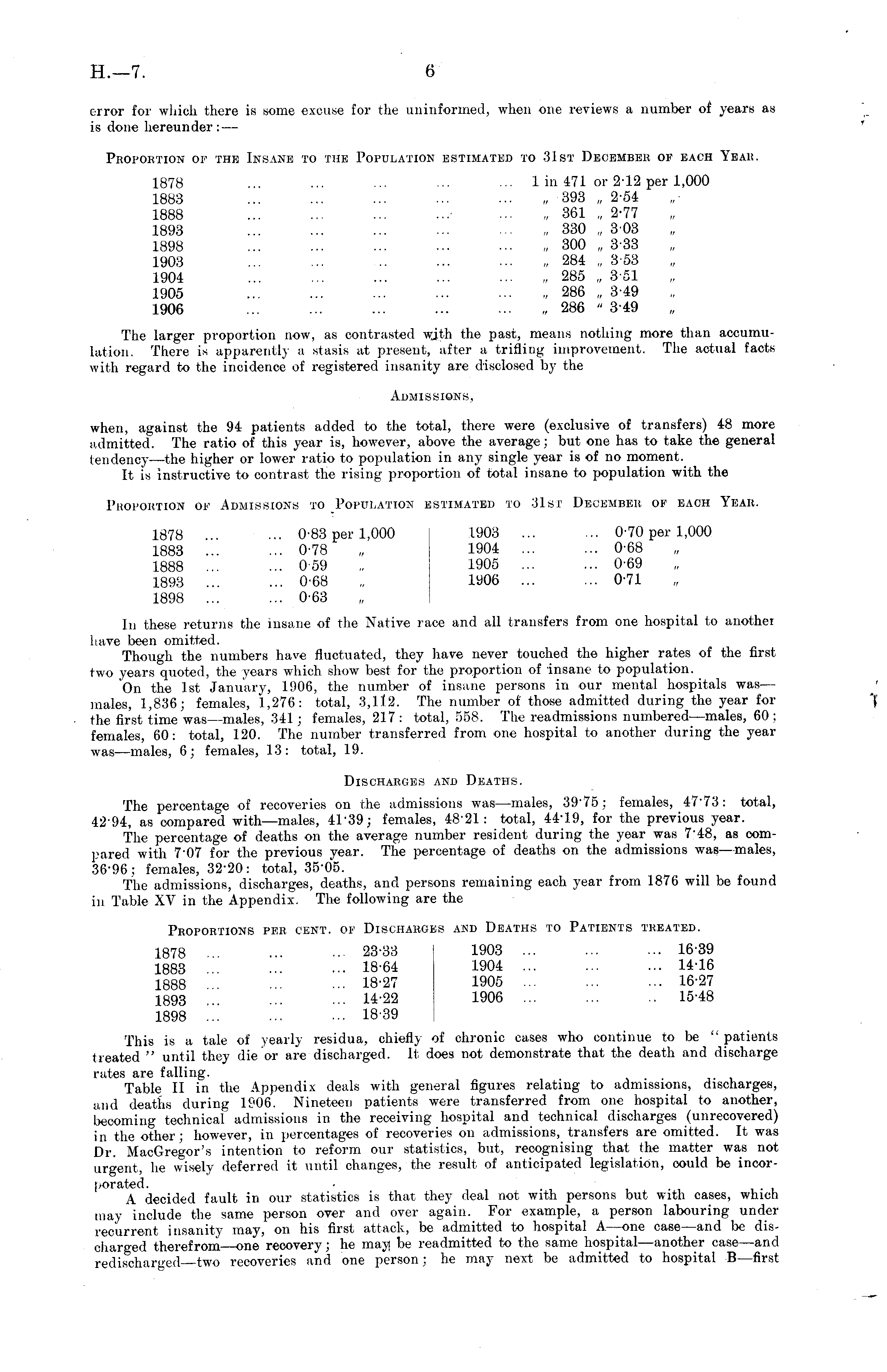 error for which there is some excuse for the uninformed, when one reviews a number of years as is done hereunder: — Proportion of the Insane to the Population estimated to 31st December of each Year. 1878 ... ... ... .. lin 471 01-2-12 per 1,000 1883 „ 393 „ 2-54 1888 ... ... 361 „ 2-77 1893 „ 330 „ 303 1898 300 „ 3-33 1903 284 „ 3-53 1904 285 „ 3-51 1905 286 „ 3-49 1906 286 " 349 The larger proportion now, as contrasted with the past, means nothing more than accumulation. There is apparently a stasis at present, after a trifling improvement. The actual facts with regard to the incidence of registered insanity are disclosed by the Admissions, when, against the 94 patients added to the total, there were (exclusive of transfers) 48 more a.dmitted. The ratio of this year is, however, above the average; but one has to take the general tendency—the higher or lower ratio to population in any single year is of no moment. It is instructive to contrast the rising proportion of total insane to population with the Proportion of Admissions to Population estimated to 31st December of each Year. 1878 ... ... 0-83 per 1,000 1903 ... ... 0-70 per 1,000 1883 0-78 „ 1904 0-68 1888 0-59 „ 1905 0-69 1893 ... ... 0-68 „ 1906 ... ... 0-71 1898 ... ... 0-63 In these returns the insane of the Native race and all transfers from one hospital to another have been omitted. Though the numbers have fluctuated, they have never touched the higher rates of the first two years quoted, the years which show best for the proportion of insane to population. On the Ist January, 1906, the number of insane persons in our mental hospitals was— males, 1,836; females, 1,276: total, 3,11.2. The number of those admitted during the year for the first time was —males, 341; females, 217 : total, 558. The readmissions numbered—males, 60 ; females, 60: total, 120. The number transferred from one hospital to another during the year was —males, 6; females, 13: total, 19. Discharges and Deaths. The percentage of recoveries on the admissions was —males, 3975; females, 47*73: total, 42-94, as compared with—males, 4U39; females, 4821 : total, 44*19, for the previous year. The percentage of deaths on the average number resident during the year was 748, as compared with 707 for the previous year. The percentage of deaths on the admissions was —males, 36-96; females, 32-20: total, 35*05. The admissions, discharges, deaths, and persons remaining each year from 1876 will be found in Table XV in the Appendix. The following are the Proportions per cent, of Discharges and Deaths to Patients treated. 1878 23-33 1903 16-39 1883 18-64 1904 14-16 1888 18-27 1905 16-27 1893 14-22 1906 ... ... .. 15-48 1898 1839 This is a tale of yearly residua, chiefly of chronic cases who continue to be " patients treated " until they die or are discharged. It does not demonstrate that the death and discharge rates are falling. Table II in the Appendix deals with general figures relating to admissions, discharges, and deaths during 1906. Nineteen patients were transferred from one hospital to another, becoming technical admissions in the receiving hospital and technical discharges (unrecovered) in the other: however, in percentages of recoveries on admissions, transfers are omitted. It was Dr. MacGregor's intention to reform our statistics, but, recognising that the matter was not. urgent, he wisely deferred it until changes, the result of anticipated legislation, could be incorporated. A decided fault in our statistics is that they deal not with persons but with cases, which may include the same person over and over again. For example, a person labouring under recurrent insanity may, on his first attack, be admitted to hospital A—one case —and be discharged therefrom —one recovery; he may! D « readmitted to the same hospital —another case —and redischarged—two recoveries and one person; he may next be admitted to hospital B—first