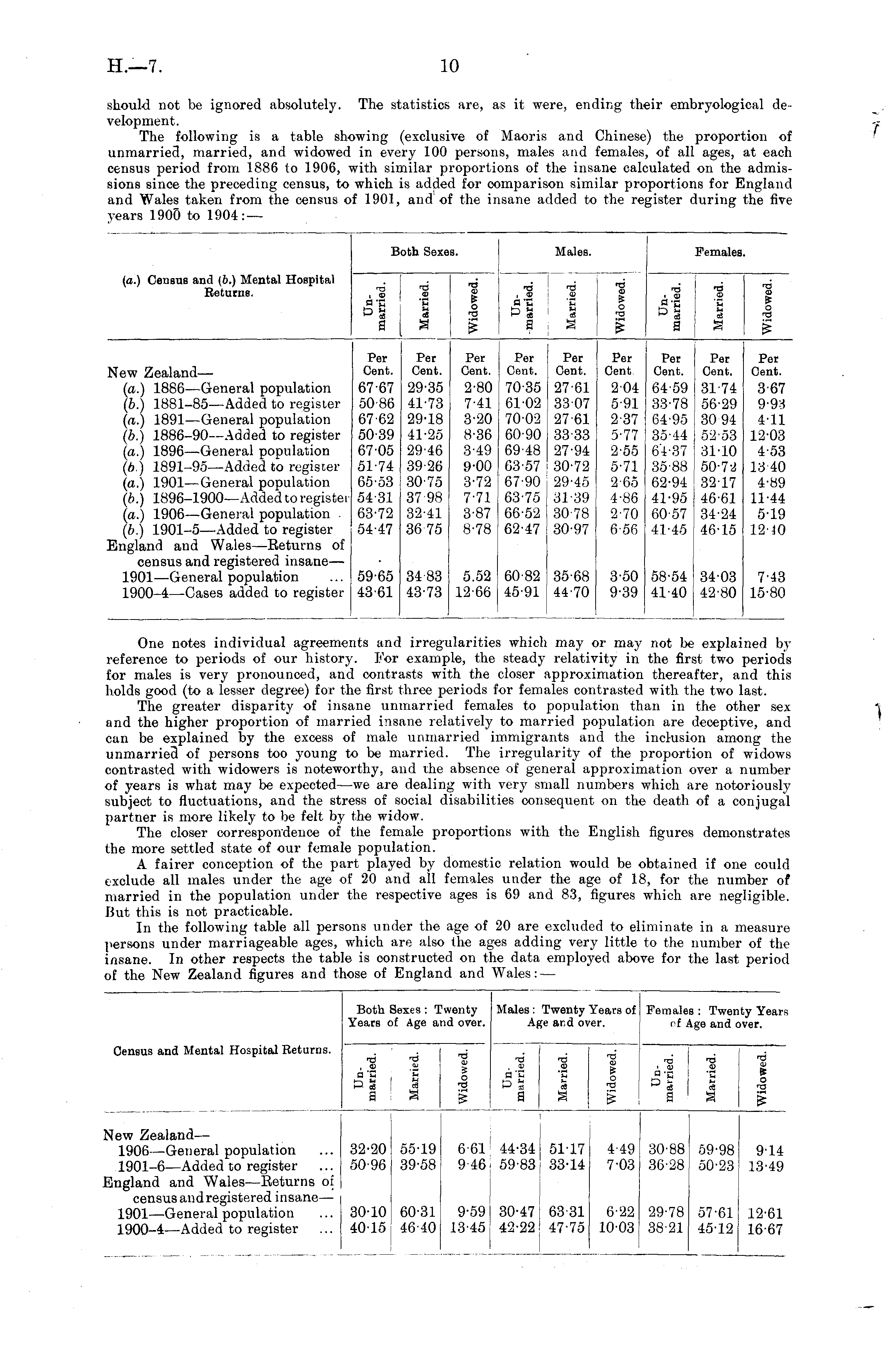 should not be ignored absolutely. The statistics are, as it were, ending their embryological development. The following is a table showing (exclusive of Maoris and Chinese) the proportion of unmarried, married, and widowed in every 100 persons, males and females, of all ages, at each census period from 1886 to 1906, with similar proportions of the insane calculated on the admissions since the preceding census, to which is added for comparison similar proportions for England and Wales taken from the census of 1901, and of the insane added to the register during the five years 1900 to 1904:—