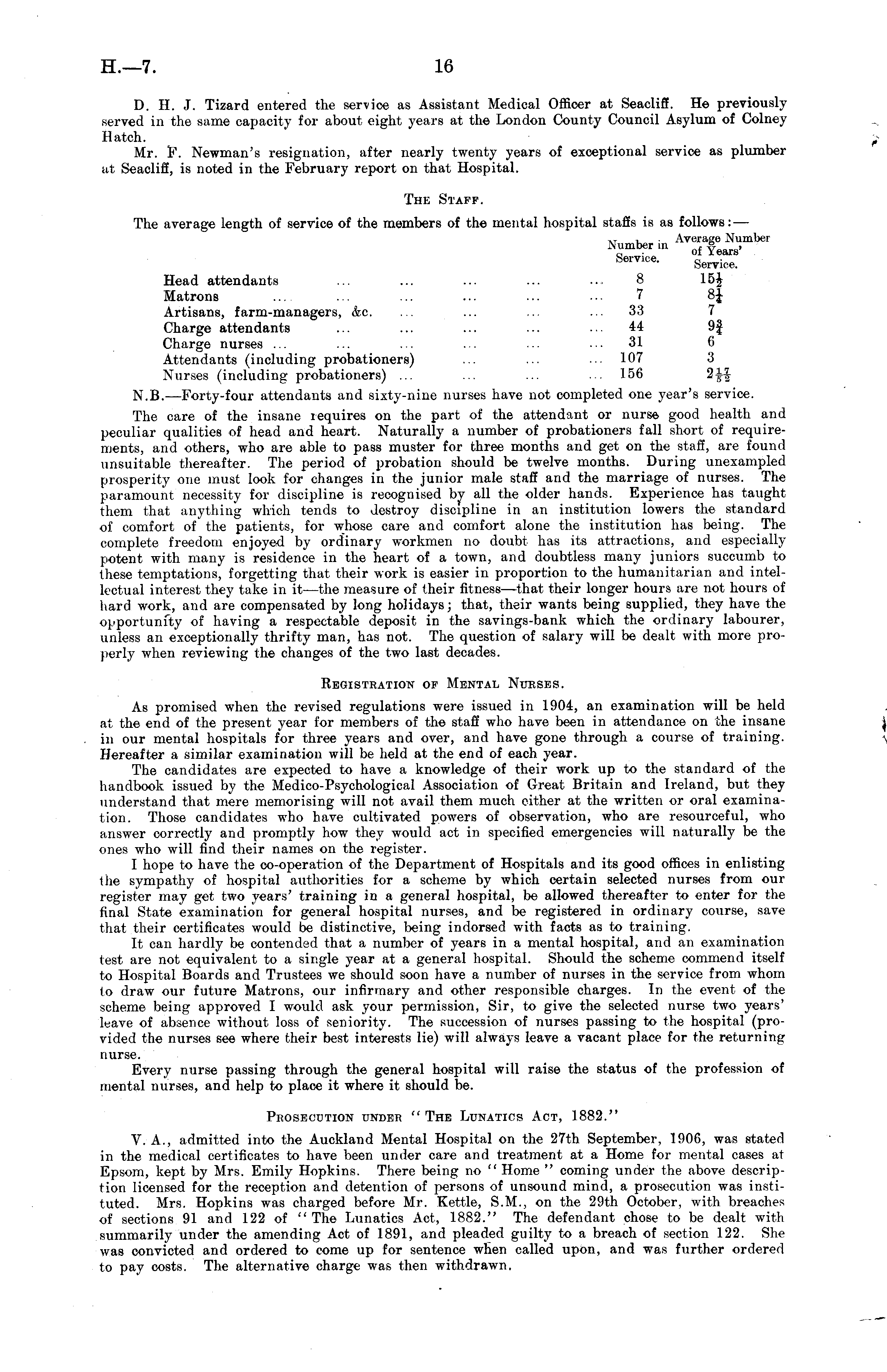 D. H. J. Tizard entered the service as Assistant Medical Officer at Seacliff. He previously served in the same capacity for about eight years at the London County Council Asylum of Colney Hatch. Mr. F. Newman's resignation, after nearly twenty years of exceptional service as plumber at Seacliff, is noted in the February report on that Hospital. The Staff. The average length of service of the members of the mental hospital staffs is as follows: — • T , Average Number Number m o£ f ears , Service. gervice _ Head attendants ... ... ... ... ... 8 15J Matrons ... ... ... ... ... • • ■ 7 8 J Artisans, farm-managers, &c. ... ... ... ... 33 7 Charge attendants ... ... ... ... ... 44 9f Charge nurses ... ... ... ... ... ... 31 6 Attendants (including probationers) ... ... ... 107 3 Nurses (including probationers) ... ... ... ... 156 244 N.B.—Forty-four attendants and sixty-nine nurses have not completed one year's service. The care of the insane requires on the part of the attendant or nurse good health and peculiar qualities of head and heart. Naturally a number of probationers fall short of requirements, and others, who are able to pass muster for three months and get on the staff, are found unsuitable thereafter. The period of probation should be twelve months. During unexampled prosperity one must look for changes in the junior male staff and the marriage of nurses. The paramount necessity for discipline is recognised by all the older hands. Experience has taught them that anything which tends to destroy discipline in an institution lowers the standard of comfort of the patients, for whose care and comfort alone the institution has being. The complete freedom enjoyed by ordinary workmen no doubt has its attractions, and especially potent with many is residence in the heart of a town, and doubtless many juniors succumb to these temptations, forgetting that their work is easier in proportion to the humanitarian and intellectual interest they take in it—the measure of their fitness —that their longer hours are not hours of hard work, and are compensated by long holidays; that, their wants being supplied, they have the opportunfty of having a respectable deposit in the savings-bank which the ordinary labourer, unless an exceptionally thrifty man, has not. The question of salary will be dealt with more properly when reviewing the changes of the two last decades. Registration of Mental Nurses. As promised when the revised regulations were issued in 1904, an examination will be held at the end of the present year for members of the staff who have been in attendance on the insane in our mental hospitals for three years and over, and have gone through a course of training. Hereafter a similar examination will be held at the end of each year. The candidates are expected to have a knowledge of their work up to the standard of the handbook issued by the Medico-Psychological Association of Great Britain and Ireland, but they understand that mere memorising will not avail them much either at the written or oral examination. Those candidates who have cultivated powers of observation, who are resourceful, who answer correctly and promptly how they would act in specified emergencies will naturally be the ones who will find their names on the register. I hope to have the co-operation of the Department of Hospitals and its good offices in enlisting the sympathy of hospital authorities for a scheme by which certain selected nurses from our register may get two years' training in a general hospital, be allowed thereafter to enter for the final State examination for general hospital nurses, and be registered in ordinary course, save that their certificates would be distinctive, being indorsed with facts as to training. It can hardly be contended that a number of years in a mental hospital, and an examination test are not equivalent to a single year at a general hospital. Should the scheme commend itself to Hospital Boards and Trustees we should soon have a number of nurses in the service from whom to draw our future Matrons, our infirmary and other responsible charges. In the event of the scheme being approved I would ask your permission, Sir, to give the selected nurse two years' leave of absence without loss of seniority. The succession of nurses passing to the hospital (provided the nurses see where their best interests lie) will always leave a vacant place for the returning nurse. Every nurse passing through the general hospital will raise the status of the profession of mental nurses, and help to place it where it should be. Prosecution under " The Lunatics Act, 1882." V. A., admitted into the Auckland Mental Hospital on the 27th September, 1906, was stated in the medical certificates to have been under care and treatment at a Home for mental cases at Epsom, kept by Mrs. Emily Hopkins. There being no " Home " coming under the above description licensed for the reception and detention of persons of unsound mind, a prosecution was instituted. Mrs. Hopkins was charged before Mr. Kettle, S.M., on the 29th October, with breaches of sections 91 and 122 of "The Lunatics Act, 1882." The defendant chose to be dealt with summarily under the amending Act of 1891, and pleaded guilty to a breach of section 122. She was convicted and ordered to come up for sentence when called upon, and was further ordered to pay costs. The alternative charge was then withdrawn,