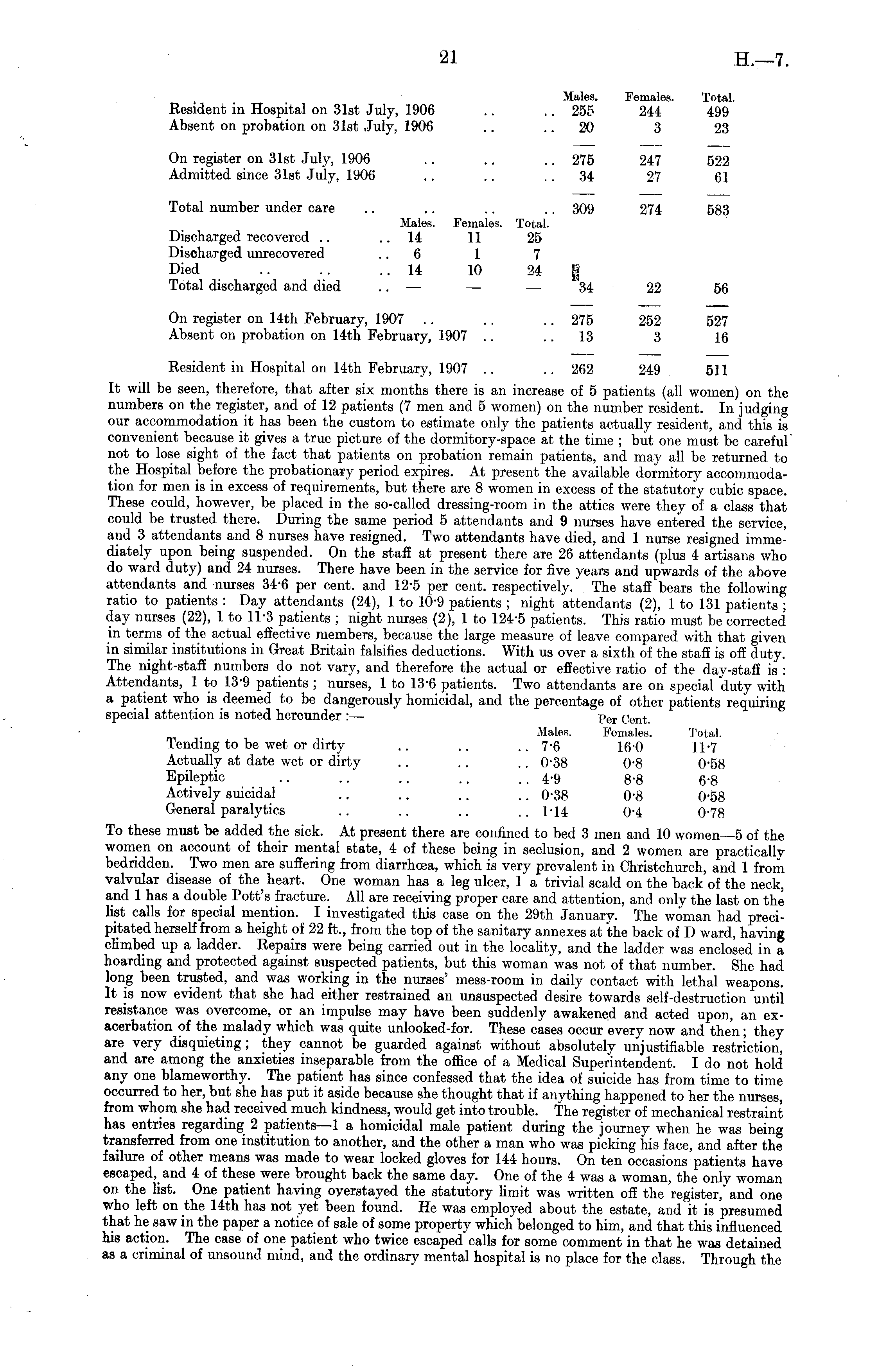 Males. Females. Total. Resident in Hospital on 31st July, 1906 .. .. 255 244 499 Absent on probation on 31st July, 1906 .. 20 3 23 On register on 31st July, 1906 .. .. .. 275 247 522 Admitted since 31st July, 1906 .. .. 34 27 61 Total number under care .. .. .. .. 309 274 583 Males. Females. Total. Discharged recovered .. 14 11 25 Discharged unrecovered .. 6 1 7 Died .. .. ..14 10 24 | Total discharged and died .. — — — 34 • 22 56 On register on 14th February, 1907 .. .. .. 275 252 527 Absent on probation on 14th February, 1907 .. 13 3 16 Resident in Hospital on 14th February, 1907 .. .. 262 249 511 It will be seen, therefore, that after six months there is an increase of 5 patients (all women) on the numbers on the register, and of 12 patients (7 men and 5 women) on the number resident. In judging our accommodation it has been the custom to estimate only the patients actually resident, and this is convenient because it gives a true picture of the dormitory-space at the time ; but one must be careful not to lose sight of the fact that patients on probation remain patients, and may all be returned to the Hospital before the probationary period expires. At present the available dormitory accommodation for men is in excess of requirements, but there are 8 women in excess of the statutory cubic space. These could, however, be placed in the so-called dressing-room in the attics were they of a class that could be trusted there. During the same period 5 attendants and 9 nurses have entered the service, and 3 attendants and 8 nurses have resigned. Two attendants have died, and 1 nurse resigned immediately upon being suspended. On the staff at present there are 26 attendants (plus 4 artisans who do ward duty) and 24 nurses. There have been in the service for five years and upwards of the above attendants and nurses 34-6 per cent, and 12-5 per cent, respectively. The staff bears the following ratio to patients : Day attendants (24), 1 to 10*9 patients ; night attendants (2), 1 to 131 patients ; day nurses (22), Ito 11*3 patients ; night nurses (2), Ito 124*5 patients. This ratio must be corrected in terms of the actual effective members, because the large measure of leave compared with that given in similar institutions in Great Britain falsifies deductions. With us over a sixth of the staff is off duty. The night-staff numbers do not vary, and therefore the actual or effective ratio of the day-staff is : Attendants, Ito 13*9 patients ; nurses, Ito 13*6 patients. Two attendants are on special duty with a patient who is deemed to be dangerously homicidal, and the percentage of other patients requiring special attention is noted hereunder : — p er c ent Males. Females. 'total. Tending to be wet or dirty .. .. .. 7*6 160 11-7 Actually at date wet or dirty .. .. .. 0-38 0-8 0-58 Epileptic .. .. .. .. ..4*9 B*B 6*B Actively suicidal .. .. .. .. o*3B o*B o*sß General paralytics .. .. .. .. 1-14 o*4 0-78 To these must be added the sick. At present there are confined to bed 3 men and 10 women—s of the women on account of their mental state, 4 of these being in seclusion, and 2 women are practically bedridden. Two men are suffering from diarrhoea, which is very prevalent in Christchurch, and 1 from valvular disease of the heart. One woman has a leg ulcer, 1 a trivial scald on the back of the neck, a,nd 1 has a double Pott's fracture. All are receiving proper care and attention, and only the last on the" list calls for special mention. I investigated this case on the 29th January. The woman had precipitated herself from a height of 22 ft., from the top of the sanitary annexes at the back of D ward, having climbed up a ladder. Repairs were being carried out in the locality, and the ladder was enclosed in a hoarding and protected against suspected patients, but this woman was not of that number. She had long been trusted, and was working in the nurses' mess-room in daily contact with lethal weapons. It is now evident that she had either restrained an unsuspected desire towards self-destruction until resistance was overcome, or an impulse may have been suddenly awakened and acted upon, an exacerbation of the malady which was quite unlooked-for. These cases occur every now and then; they are very disquieting; they cannot be guarded against without absolutely unjustifiable restriction, and are among the anxieties inseparable from the office of a Medical Superintendent. Ido not hold any one blameworthy. The patient has since confessed that the idea of suicide has from time to time occurred to her, but she has put it aside because she thought that if anything happened to her the nurses, from whom she had received much kindness, would get into trouble. The register of mechanical restraint has entries regarding 2 patients—l a homicidal male patient during the journey when he was being transferred from one institution to another, and the other a man who was picking his face, and after the failure of other means was made to wear locked gloves for 144 hours. On ten occasions patients have escaped, and 4of these were brought back the same day. One of the 4 was a woman, the only woman on the list. One patient having oyerstayed the statutory limit was written off the register, and one who left on the 14th has not yet been found. He was employed about the estate, and it is presumed that he saw in the paper a notice of sale of some property which belonged to him, and that this influenced his action. The case of one patient who twice escaped calls for some comment in that he was detained as a criminal of unsound mind, and the ordinary mental hospital is no place for the class. Through the