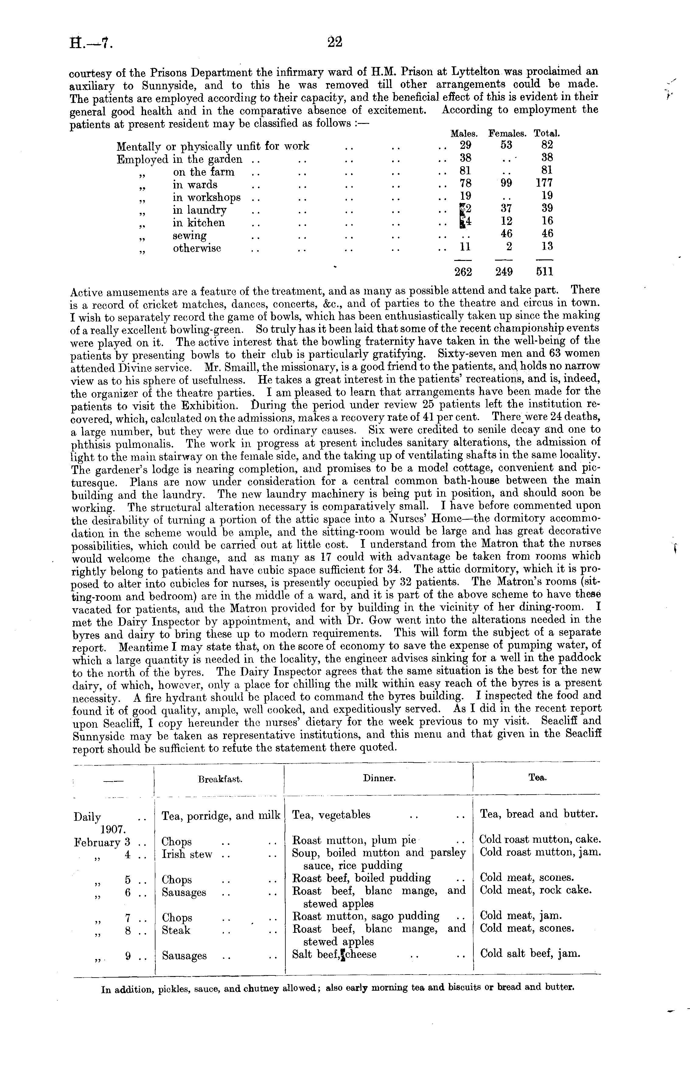 courtesy of the Prisons Department the infirmary ward of H.M. Prison at Lyttelton was proclaimed an auxiliary to Sunnyside, and to this he was removed till other arrangements could be made. The patients are employed according to their capacity, and the beneficial effect of this is evident in their general good health and in the comparative absence of excitement. According to employment the patients at present resident may be classified as follows : — Males. Females. Total. Mentally or physically unfit for work .. .. .. 29 53 82 Employed in the garden .. .. .. .. .. 38 .. ■ 38 „ on the farm .. .. .. .. .. 81 .. 81 inwards 78 99 177 „ in workshops .. .. .. .. .. 19 .. 19 „ in laundry .. .. .. .. .. Jj2 37 39 in kitchen .. .. .. .. .. f 4 12 16 „ sewing .. .. .. .. .... 46 46 „ otherwise .. .. .. .. .. 11 2 13 262 249 511 Active amusements are a feature of the treatment, and as many as possible attend and take part. There is a record of cricket matches, dances, concerts, &c, and of parties to the theatre and circus in town. I wish to separately record the game of bowls, which has been enthusiastically taken up since the making of a really excellent bowling-green. So truly has it been laid that some of the recent championship events were played on it. The active interest that the bowling fraternity have taken in the well-being of the patients by presenting bowls to their club is particularly gratifying. Sixty-seven men and 63 women attended Divine service. Mr. Smaill, the missionary, is a good friend to the patients, and. holds no narrow view as to his sphere of usefulness. He takes a great interest in the patients' recreations, and is, indeed, the organizer of the theatre parties. lam pleased to learn that arrangements have been made for the patients to visit the Exhibition. During the period under review 25 patients left the institution recovered, which, calculated on the admissions, makes a recovery rate of 41 per cent. Therewere 24 deaths, a large number, but they were due to ordinary causes. Six were credited to senile decay and one to phthisis pulmonalis. The work in progress at present includes sanitary alterations, the admission of light to the main stairway on the female side, and the taking up of ventilating shafts in the same, locality. The gardener's lodge is nearing completion, and promises to be a model cottage, convenient and picturesque. Plans are now under consideration for a central common bath-house between the main building and the laundry. The new laundry machinery is being put in position, and should soon be working. The structural alteration necessary is comparatively small. I have before commented upon the desirability of turning a portion of the attic space into a Nurses' Horne —the dormitory accommodation in the scheme would be ample, and the sitting-room would be large and has great decorative possibilities, which could be carried out at little cost. I understand from the Matron that the nurses would welcome the change, and as many as 17 could with advantage be taken from rooms which rightly belong to patients and have cubic space sufficient for 34. The attic dormitory, which it is proposed to alter into cubicles for nurses, is presently occupied by 32 patients. The Matron's rooms (sit-ting-room and bedroom) are in the middle of a ward, and it is part of the above scheme to have these vacated for patients, and the Matron provided for by building in the vicinity of her dining-room. I met the Dairy Inspector by appointment, and with Dr. Gow went into the alterations needed in the byres and dairy to bring these up to modern requirements. This will form the subject of a separate report. Meantime I may state that, on the score of economy to save the expense of pumping water, of which a large quantity is needed in the locality, the engineer advises sinking for a well in the paddock to the north of the byres. The Dairy Inspector agrees that the same situation is the best for the new dairy, of which, however, only a place for chilling the milk within easy reach of the byres is a present necessity. A fire hydrant should be placed to command the byres building. I inspected the food and found it of good quality, ample, well cooked, and expeditiously served. As I did in the recentreport upon Seacliff, I copy hereunder the nurses' dietary for the week previous to my visit. Seacliff and Sunnyside may be taken as representative institutions, and this menu and that given in the Seacliff report should be sufficient to refute the statement there quoted.