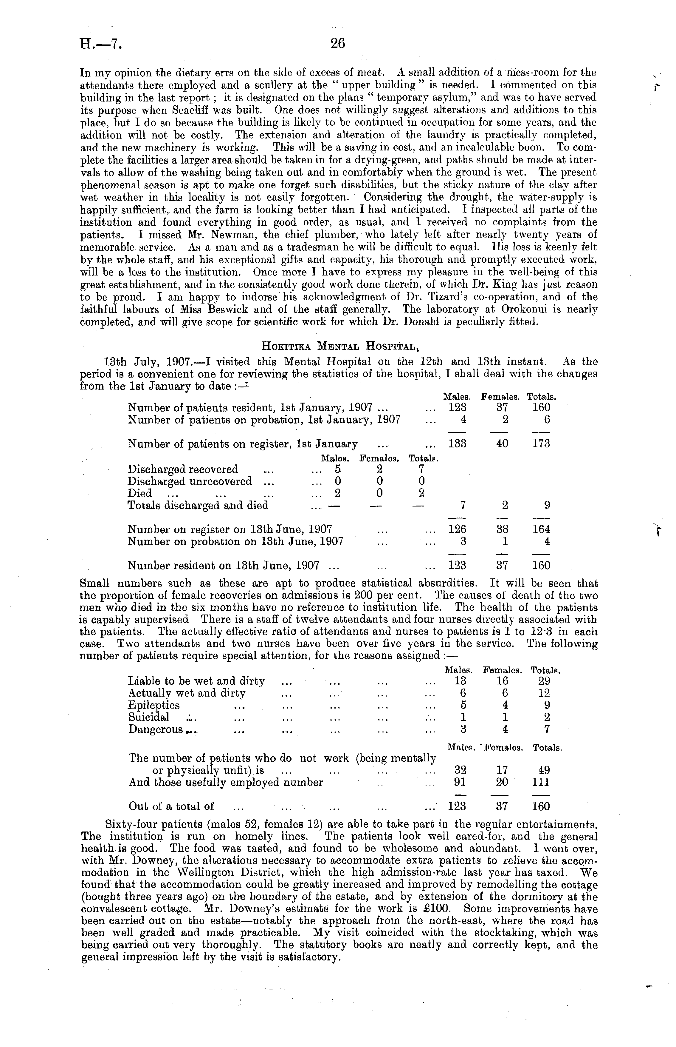 In my opinion the dietary errs on the side of excess of meat. A small addition of a mess-room for the attendants there employed and a scullery at the " upper building "is needed. I commented on this building in the last report ; it is designated on the plans " temporary asylum," and was to have served its purpose when Seacliff was built. One does not willingly suggest alterations and additions to this place, but I do so because the building is likely to be continued in occupation for some years, and the addition will not be costly. The extension and alteration of the laundry is practically completed, and the new machinery is working. This will be a saving in cost, and an incalculable boon. To complete the facilities a larger area should be taken in for a drying-green, and paths should be made at intervals to allow of the washing being taken out and in comfortably when the ground is wet. The present phenomenal season is apt to make one forget such disabilities, but the sticky nature of the clay after wet weather in this locality is not easily forgotten. Considering the drought, the water-supply is happily sufficient, and the farm is looking better than I had anticipated. I inspected all parts of the institution and found everything in good order, as usual, and I received no complaints from the patients. I missed Mr. Newman, the chief plumber, who lately left after nearly twenty years of memorable service. As a man and as a tradesman he will be difficult to equal. His loss is keenly felt by the whole staff, and his exceptional gifts and capacity, his thorough and promptly executed work, will be a loss to the institution. Once more I have to express my pleasure in the, well-being of this great establishment, and in the consistently good work done therein, of which Dr. King has just reason to be proud. I am happy to indorse his acknowledgment of Dr. Tizard's co-operation, and of the faithful labours of Miss Beswick and of the staff generally. The laboratory at Orokonui is nearly completed, and will give scope for scientific work for which Dr. Donald is peculiarly fitted. Hokitika Mental Hospital 1 13th July, 1907.—1 visited this Mental Hospital on the 12th and 13th instant. As the period is a convenient one for reviewing the statistics of the hospital, I shall deal with the changes from the Ist January to date :—* Males. Females. Totals. Number of patients resident, Ist January, 1907 ... ... 123 37 160 Number of patients on probation, Ist January, 1907 ... 4 2 6 Number of patients on register, Ist January ... ... 133 40 173 Males. Females. Total.?. Discharged recovered ... ... 5 2 7 Discharged unrecovered ... ... 0 0 0 Died ... 2 0 2 Totals discharged and died ... — — — 7 2 9 Number on register on 13th June, 1907 ... ... 126 38 164 Number on probation on 13th June, 1907 ... ... 3 1 4 Number resident on 13th June, 1907 ... ... ... 123 37 160 Small numbers such as these are apt to produce statistical absurdities. It will be seen that the proportion of female recoveries on admissions is 200 per cent. The causes of death of the two men who died in the six months have no reference to institution life. The health of the patients is capably supervised There is a staff of twelve attendants and four nurses directly associated with the patients. The actually effective ratio of attendants and nurses to patients is Ito 12-3 in each case. Two attendants and two nurses have been over five years in the service. The following number of patients require special attention, for the reasons assigned : — Males. Females. Totals. Liable to be wet and dirty ... ... ... ... 13 16 29 Actually wet and dirty ... ... ... ... 6 6 12 Epileptics ... ... ... ... ... 5 4 9 Suicidal ... ... ... ... ... ... 112 Dangerous... ... ... ... ... ... 3 4 7 Males. Females. Totals. The number of patients who do not work (being mentally or physically unfit) is ... ... ... ... 32 17 49 And those usefully employed number ... ... 91 20 111 Out of a total of ... ... ... ... ... 123 37 160 Sixty-four patients (males 52, females 12) are able to take part in the regular entertainments. The institution is run on homely lines. The patients look well cared-for, and the general health is good. The food was tasted, and found to be wholesome and abundant. I went over, with Mr. Downey, the alterations necessary to accommodate extra patients to relieve the accommodation in the Wellington District, which the high admission-rate last year has taxed. We found that the accommodation could be greatly increased and improved by remodelling the cottage (bought three years ago) on the boundary of the estate, and by extension of the dormitory at the convalescent cottage. Mr. Downey's estimate for the work is £100. Some improvements have been carried out on the estate—notably the approach from the north-east, where the road has been well graded and made practicable. My visit coincided with the stocktaking, which was being carried out very thoroughly. The statutory books are neatly and correctly kept, and the general impression left by the visit is satisfactory.