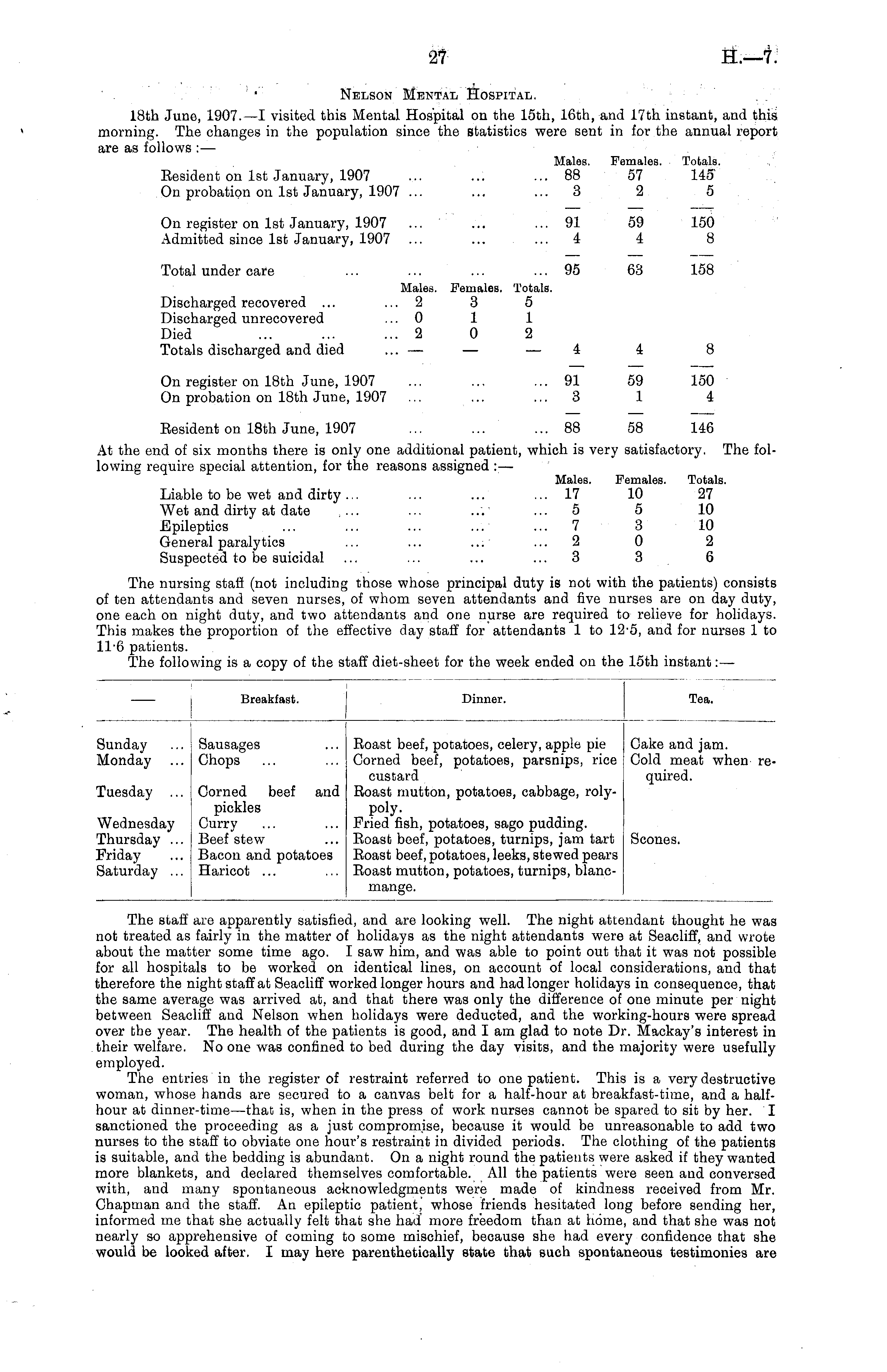 Nelson Mental Hospital. 18th June, 1907. —I visited this Mental Hospital on the 15th, 16th, and 17th instant, and this morning. The changes in the population since the statistics were sent in for the annual report are as follows :— Males. Females. Totals. Resident on Ist January, 1907 ... ... ... 88 57 145 On probation on Ist January, 1907 ... ... ... 3 2 5 On register on Ist January, 1907 ... ... ... 91 59 150 Admitted since Ist January, 1907 ... ... ... 4 4 8 Total under care ... ... ... ... 95 63 158 Males. Females. Totals. Discharged recovered ... ... 2 3 5 Discharged unrecovered ... 0 1 1 Died ... ... ... 2 0 2 Totals discharged and died ... — — — 4 4 8 On register on 18th June, 1907 ... ... ... 91 59 150 On probation on 18th June, 1907 ... ... ...3 1 4 Resident on 18th June, 1907 ... ... ... 88 58 146 At the end of six months there is only one additional patient, which is very satisfactory. The following require special attention, for the reasons assigned : : — Males. Females. Totals. Liable to be wet and dirty ... ... ... ... 17 10 27 Wet and dirty at date .... ... ... ... 5 5 10 Epileptics ... ... ... ... ... 7 3 10 General paralytics ... ... ... ... 2 0 2 Suspected to be suicidal ... ... ... ... 3 3 6 The nursing stall (not including those whose principal duty is not with the patients) consists of ten attendants and seven nurses, of whom seven attendants and five nurses are on day duty, one each on night duty, and two attendants and one nurse are required to relieve for holidays. This makes the proportion of the effective day staff for attendants 1 to 12-5, and for nurses 1 to 11*6 patients. The following is a copy of the staff diet-sheet for the week ended on the 15th instant :—