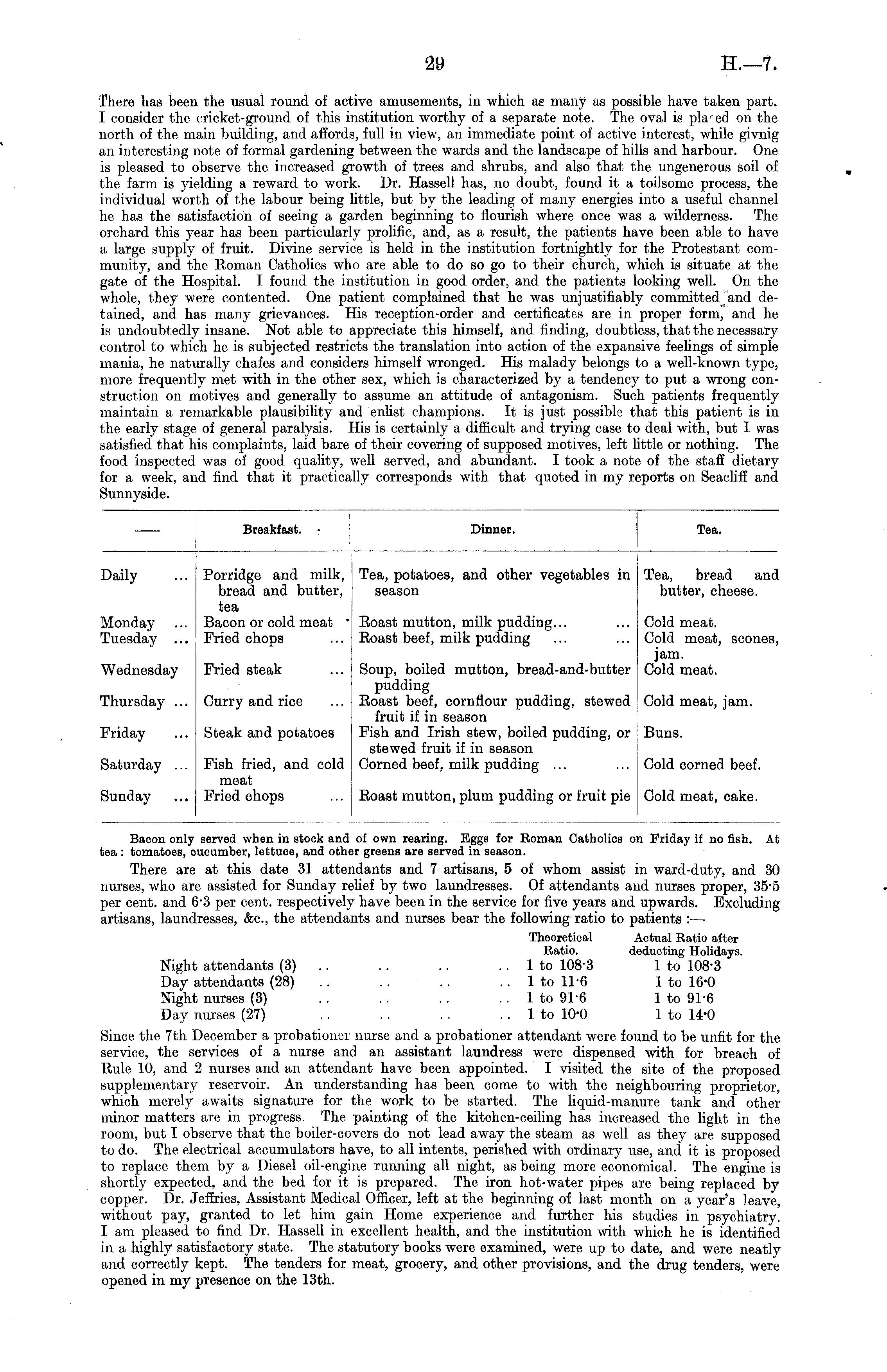 There has been the usual round of active amusements, in which as many as possible have taken part. I consider the cricket-ground of this institution worthy of a separate note. The oval is pla-ed on the north of the main building, and affords, full in view, an immediate point of active interest, while givnig an interesting note of formal gardening between the wards and the landscape of hills and harbour. One is pleased to observe the increased growth of trees and shrubs, and also that the ungenerous soil of the farm is yielding a reward to work. Dr. Hassell has, no doubt, found it a toilsome process, the individual worth of the labour being little, but by the leading of many energies into a useful channel he has the satisfaction of seeing a garden beginning to flourish where once was a wilderness. The orchard this } 7 ear has been particularly prolific, and, as a result, the patients have been able to have a large supply of fruit. Divine service is held in the institution fortnightly for the Protestant community, and the Roman Catholics who are able to do so go to their church, which is situate at the gate of the Hospital. I found the, institution in good order, and the patients looking well. On the whole, they were contented. One patient complained that he was unjustifiably committed and detained, and has many grievances. His reception-order and certificates are in proper form, and he is undoubtedly insane. Not able to appreciate this himself, and finding, doubtless, that the necessary control to which he is subjected restricts the translation into action of the expansive feelings of simple mania, he naturally chafes and considers himself wronged. His malady belongs to a well-known type, more frequently met with in the other sex, which is characterized by a tendency to put a wrong construction on motives and generally to assume an attitude of antagonism. Such patients frequently maintain a remarkable plausibility and enlist champions. It is just possible that this patient is in the early stage of general paralysis. His is certainly a difficult and trying case to deal with, but I was satisfied that his complaints, laid bare of their covering of supposed motives, left little or nothing. The food inspected was of good quality, well served, and abundant. I took a note of the staff dietary for a week, and find that it practically corresponds with that quoted in my reports on Seacliff and Sunnyside.
