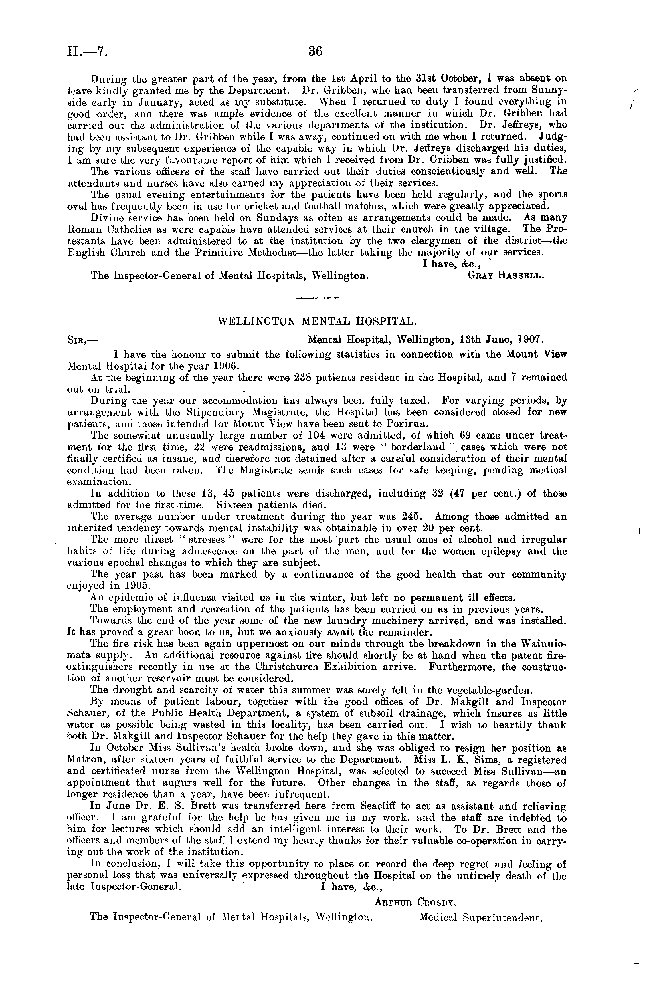 WELLINGTON MENTAL HOSPITAL. Sir, — Mental Hospital, Wellington, 13th June, 1907. I have the honour to submit the following statistics in connection with the Mount View Mental Hospital for the year 1906. At the beginning of the year there were 238 patients resident in the Hospital, and 7 remained out on trial. During the year our accommodation has always been fully taxed. For varying periods, by arrangement with the Stipendiary Magistrate, the Hospital has been considered closed for new patients, and those intended for Mount View have been sent to Porirua. The somewhat unusually large number of 104 were admitted, of which 69 came under treatment for the first time, 22 were readmissions, and 13 were " borderland " cases which were not finally certified as insane, and therefore not detained after a careful consideration of their mental condition had been taken. The Magistrate sends such cases for safe keeping, pending medical examination. In addition to these 13, 45 patients were discharged, including 32 (47 per cent.) of those admitted for the first time. Sixteen patients died. The average number under treatment during the year was 245. Among those admitted an inherited tendency towards mental instability was obtainable in over 20 per cent. The more direct "stresses" were for the most part the usual ones of alcohol and irregular habits of life during adolescence on the part of the men, and for the women epilepsy and the various epochal changes to which they are subject. The year past has been marked by a continuance of the good health that our community enjoyed in 1905. An epidemic of influenza visited us in the winter, but left no permanent ill effects. The employment and recreation of the patients has been carried on as in previous years. Towards the end of the year some of the new laundry machinery arrived, and was installed. It has proved a great boon to us, but we anxiously await the remainder. The fire risk has been again uppermost on our minds through the breakdown in the Wainuiomata supply. An additional resource against fire should shortly be at hand when the patent fireextinguishers recently in use at the Christchurch Exhibition arrive. Furthermore, the construction of another reservoir must be considered. The drought and scarcity of water this summer was sorely felt in the vegetable-garden. By means of patient labour, together with the good offices of Dr. Makgill and Inspector Schauer, of the Public Health Department, a system of subsoil drainage, which insures as little water as possible being wasted in this locality, has been carried out. I wish to heartily thank both Dr. Makgill and Inspector Schauer for the help they gave in this matter. In October Miss Sullivan's health broke down, and she was obliged to resign her position as Matron, after sixteen years of faithful service to the Department. Miss L. K. Sims, a registered and certificated nurse from the Wellington Hospital, was selected to succeed Miss Sullivan—an appointment that augurs well for the future. Other changes in the staff, as regards those of longer residence than a year, have been infrequent. In June Dr. E. S. Brett was transferred here from Seacliff to act as assistant and relieving officer. I am grateful for the help he has given me in my work, and the staff are indebted to him for lectures which should add an intelligent interest to their work. To Dr. Brett and the officers and members of the staff I extend my hearty thanks for their valuable co-operation in carrying out the work of the institution. In conclusion, I will take this opportunity to place on record the deep regret and feeling of personal loss that was universally expressed throughout the Hospital on the untimely death of the late Inspector-General. I have, &c, Arthur Crosby, The Inspector-General of Mental Hospitals, Wellington. Medical Superintendent.